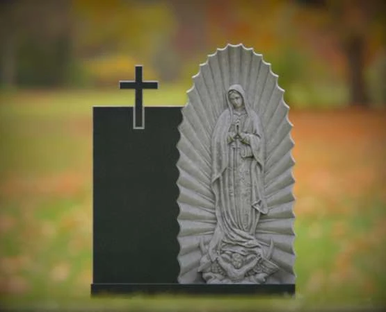 Wunderschön gestalteter Granitgrabstein mit einer detaillierten Darstellung der Jungfrau Maria und einem Kreuz. Mit Präzision und Haltbarkeit gefertigt, bietet es eine sinnvolle und heilige Hommage, um die Erinnerung an Ihren geliebten Menschen zu ehren.