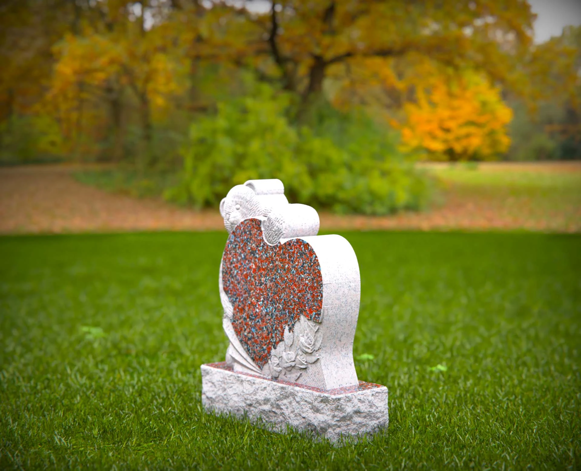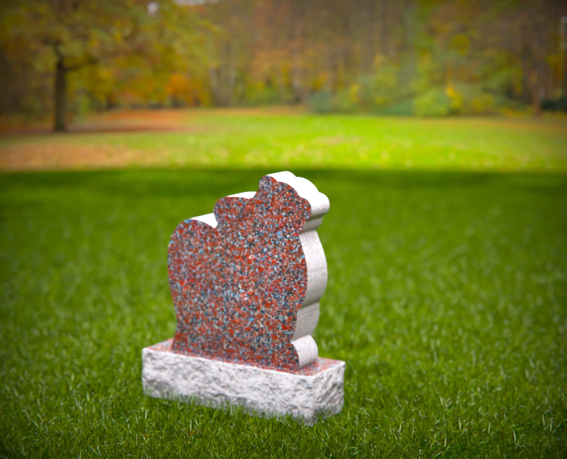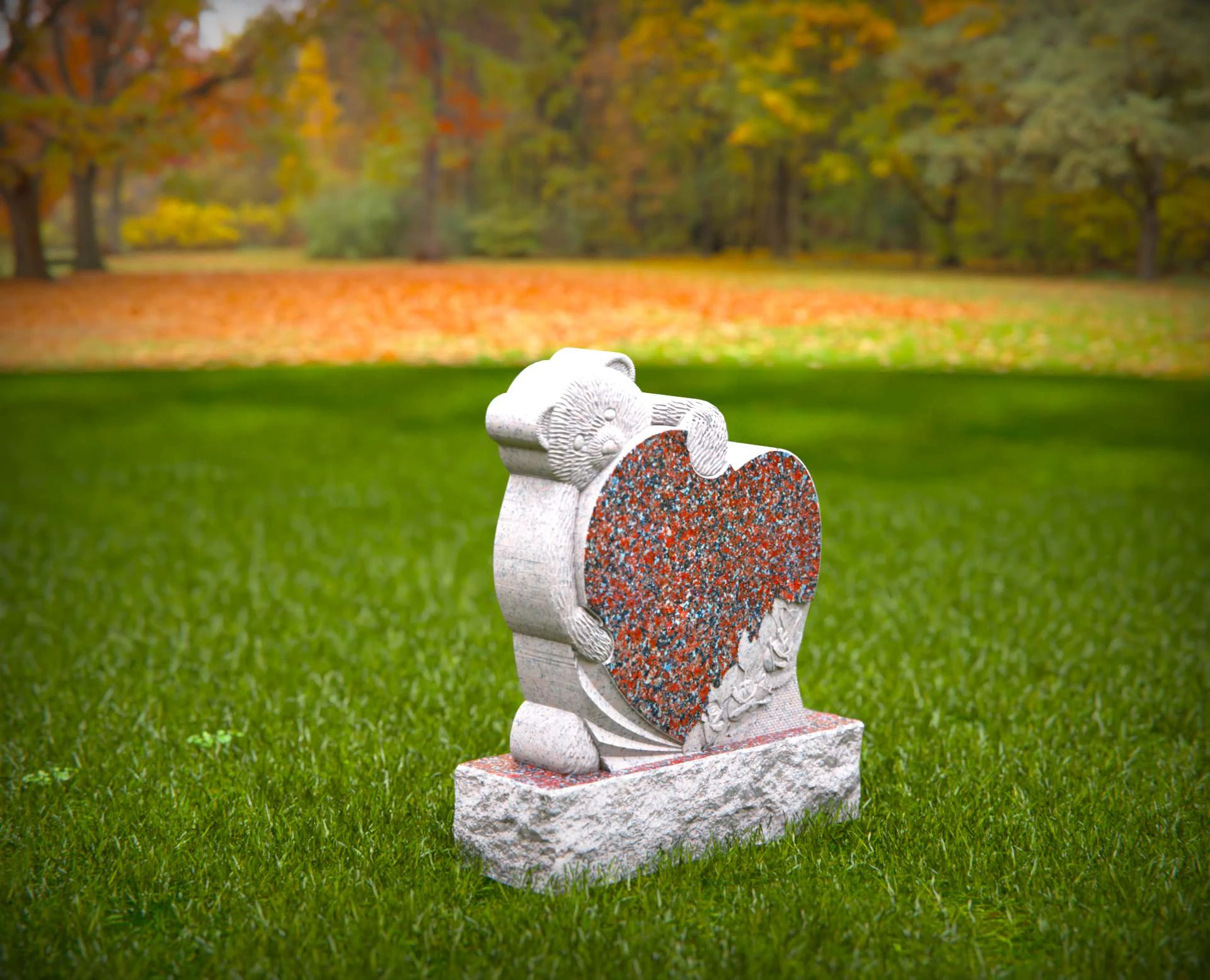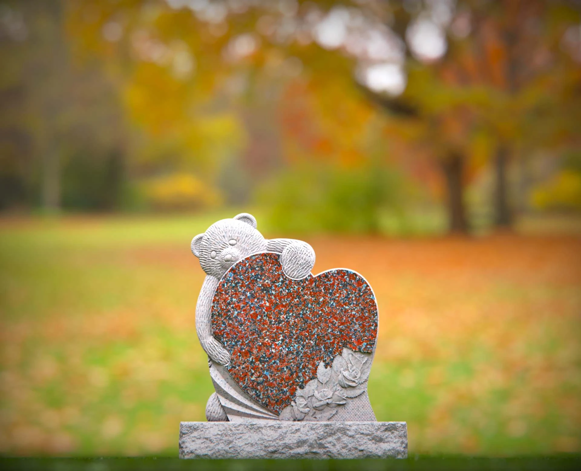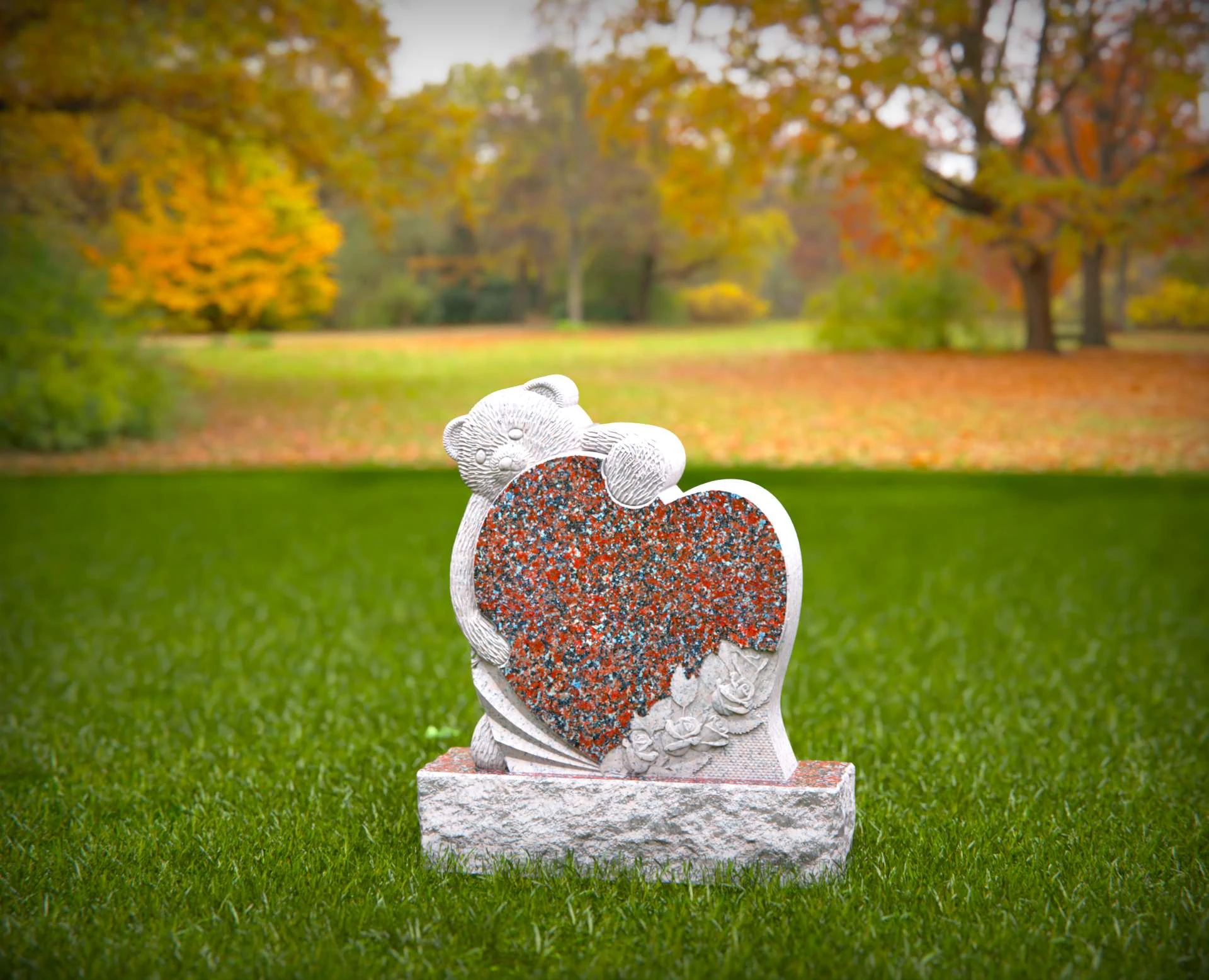 Ein bewegendes Kinder-Gedenkstein, der einen geschnitzten Teddybär zeigt, der eine herzförmige Plakette umarmt und somit Liebe, Wärme und Erinnerung symbolisiert. Zarte florale Gravuren erhöhen seine Schönheit und machen es zu einer herzlichen Hommage an ein geliebtes Kind. In einem friedlichen Friedhof platziert, verbessert die ruhige Umgebung die Atmosphäre der Reflexion und Ehre.