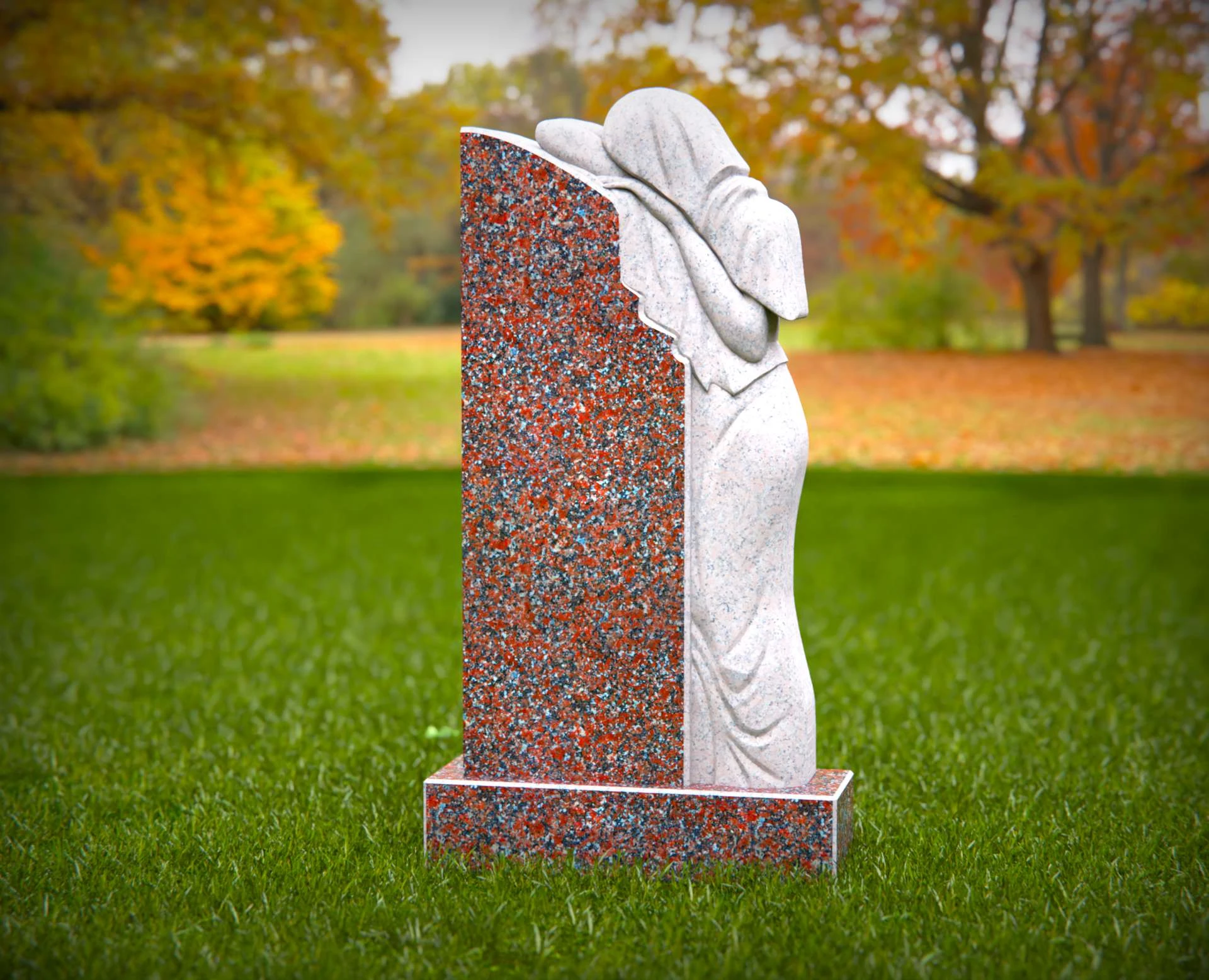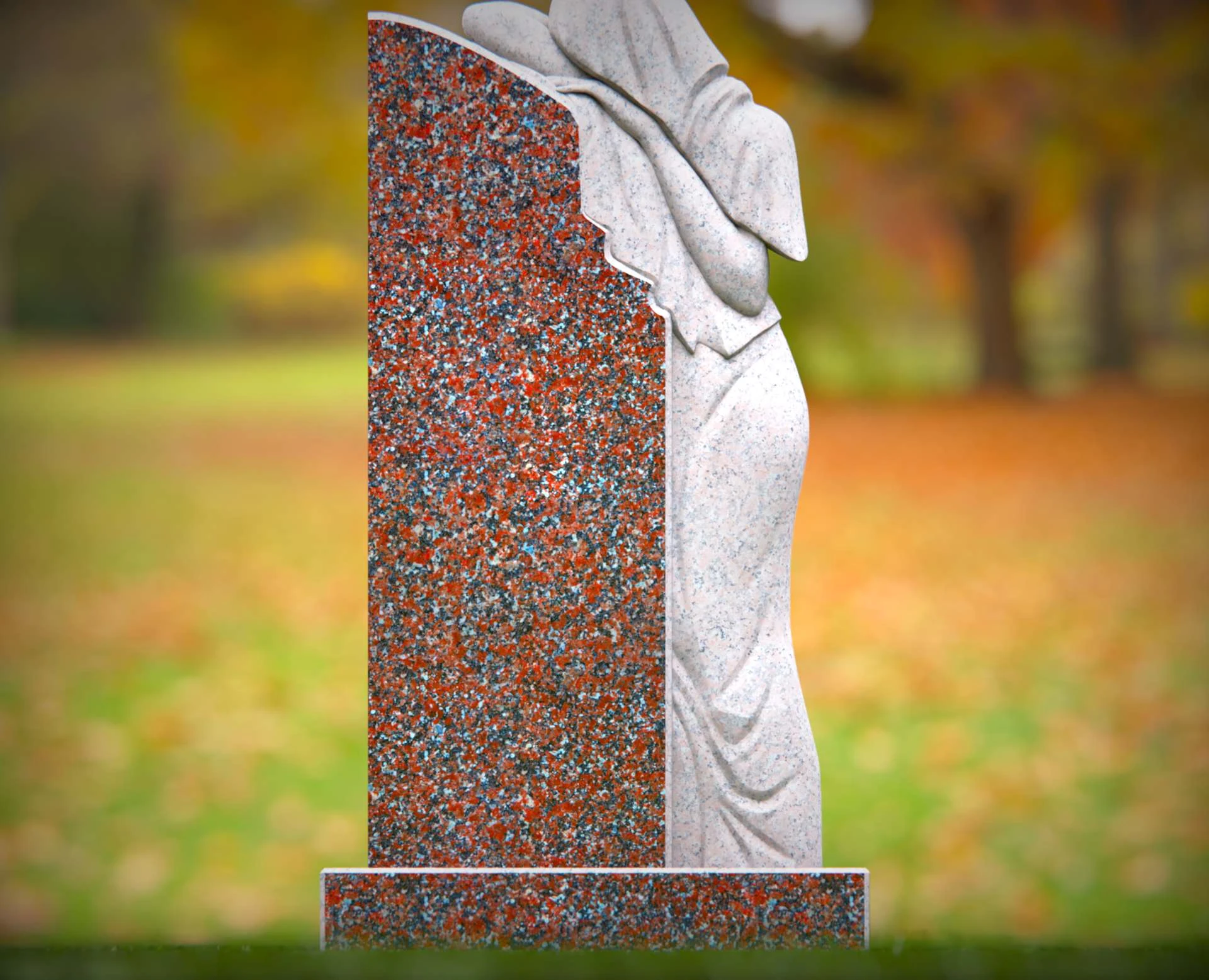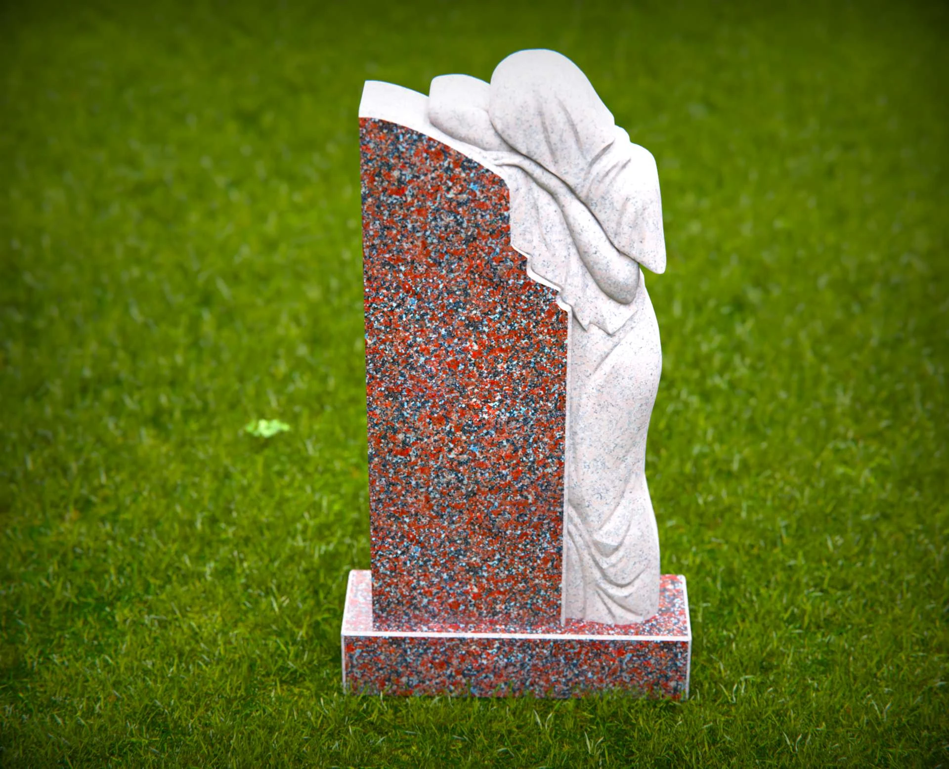 Dieser elegante Grabstein aus Granit zeichnet sich durch einen wunderschön geschnitzten trauernden Engel aus, der ewige Liebe und Erinnerung symbolisiert. Die detaillierte Schnitzerei des Engels, der sich über die polierte Granitoberfläche lehnt, fügt einem geliebten Leben eine rührende Hommage hinzu. Gefertigt aus widerstandsfähigem Granit, ist dieses Denkmal darauf ausgelegt, den Elementen standzuhalten und gleichzeitig ein zeitloses und herzliches Denkmal zu bieten. Ideal zur Ehrung eines geliebten Menschen mit Anmut und Würde.