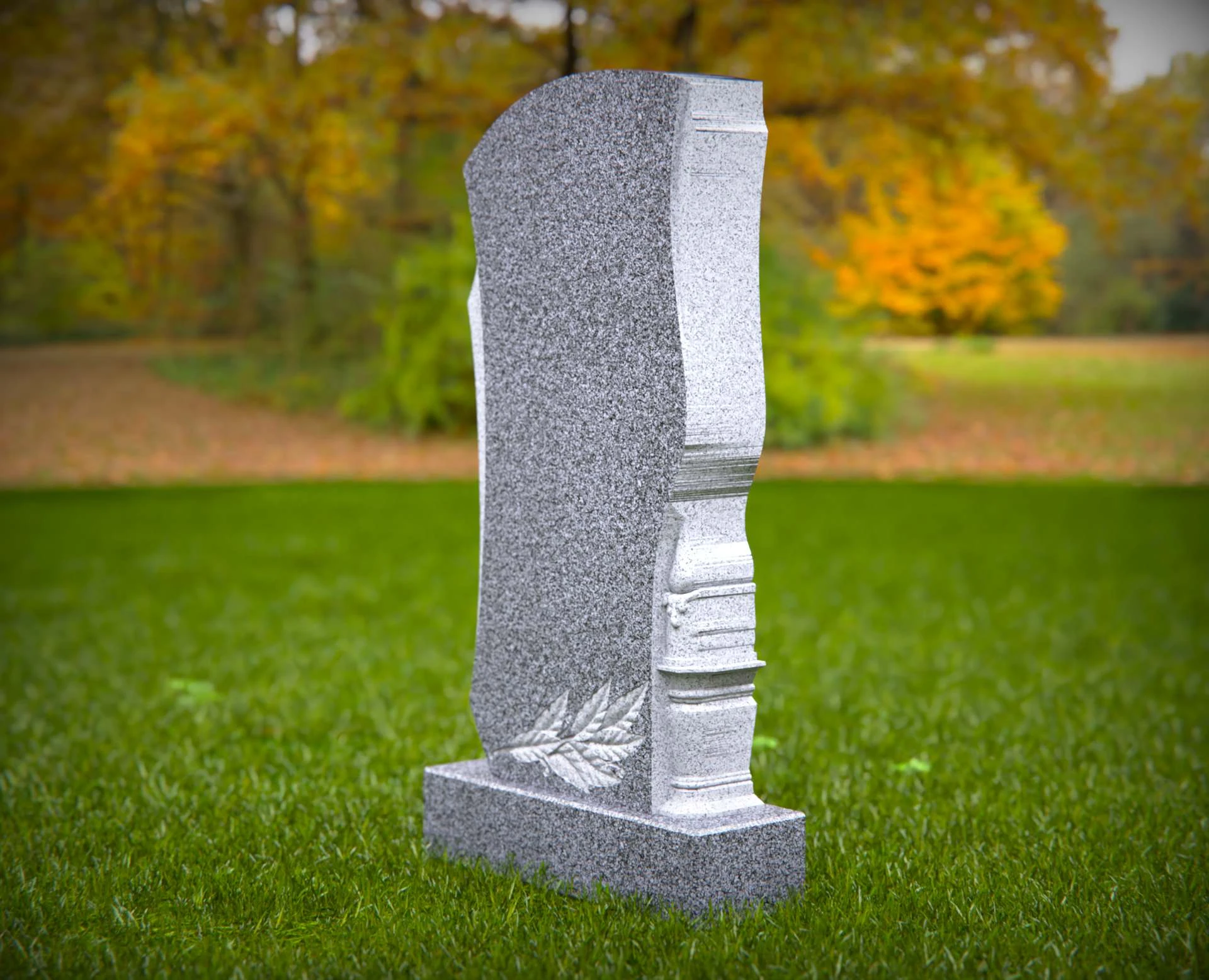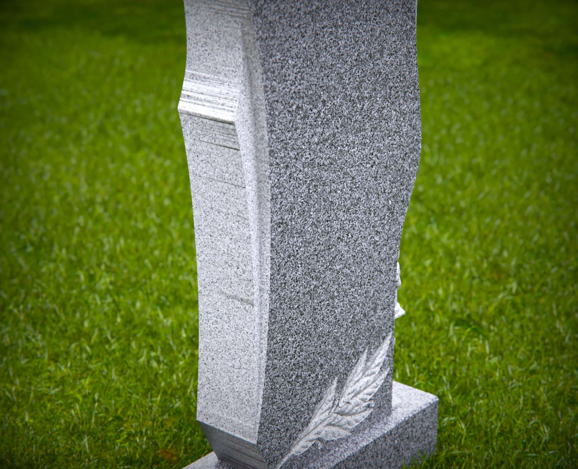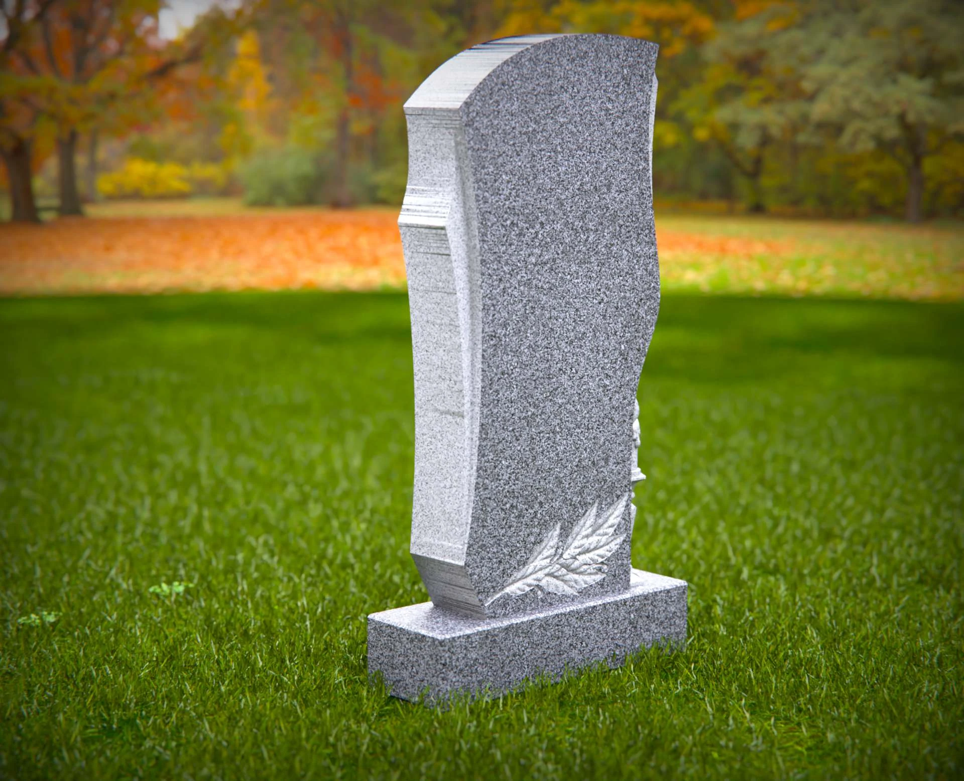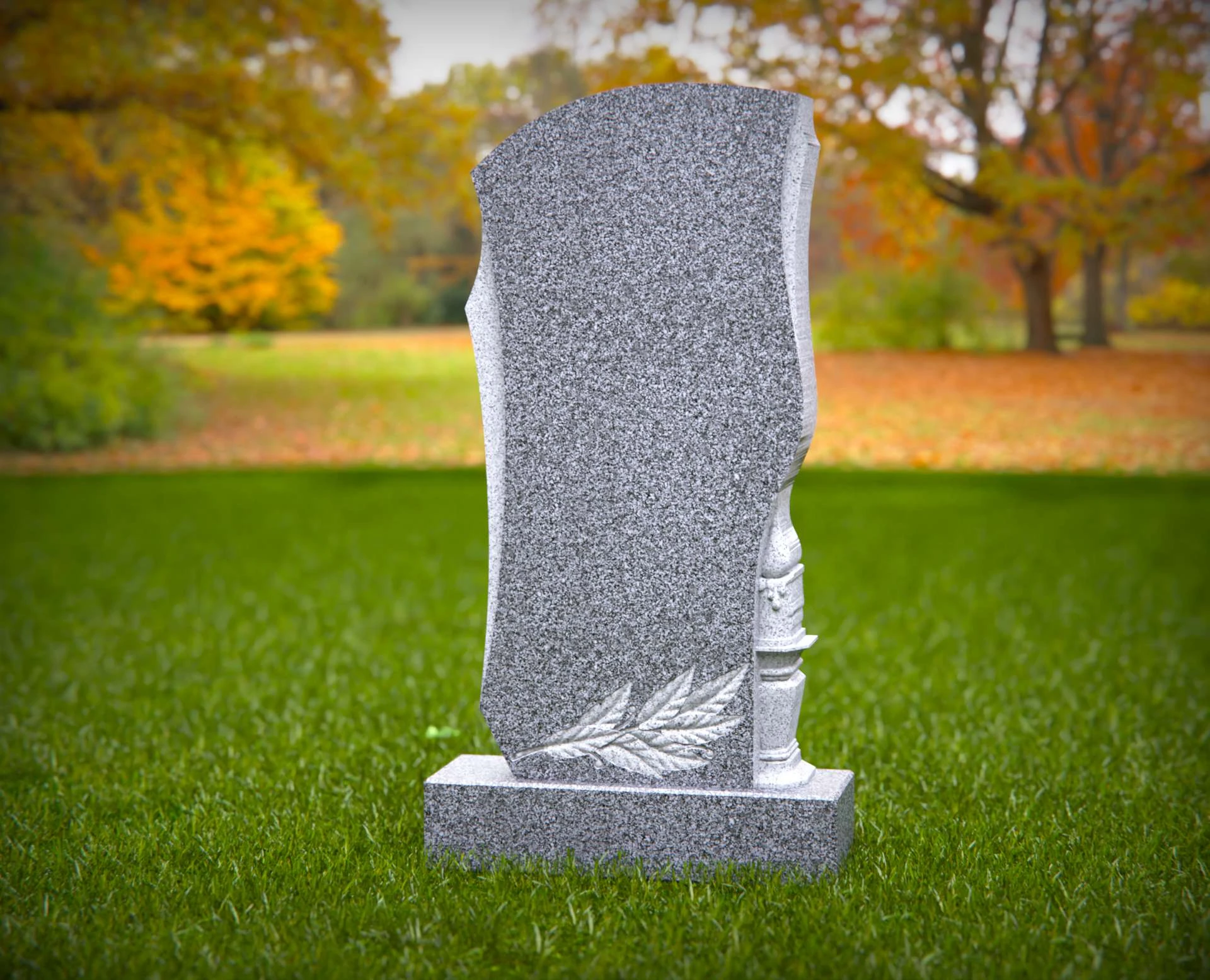 Dieser einzigartig geformte Grabstein aus Granit zeichnet sich durch ein modernes und dennoch zeitloses Design aus und bietet eine würdevolle und respektvolle Würdigung eines geliebten Menschen. Die polierte Steinoberfläche bietet ausreichend Platz für persönliche Gravuren, während die skulpturierten Seitendetails, einschließlich einer Säule und einer feinen Lorbeerblattgravur an der Basis, einen Hauch von Raffinesse hinzufügen. Die asymmetrische Kontur des Denkmals erhöht seinen visuellen Reiz und symbolisiert Stärke, Erinnerung und ein bleibendes Erbe.