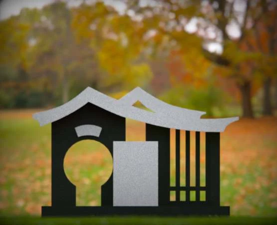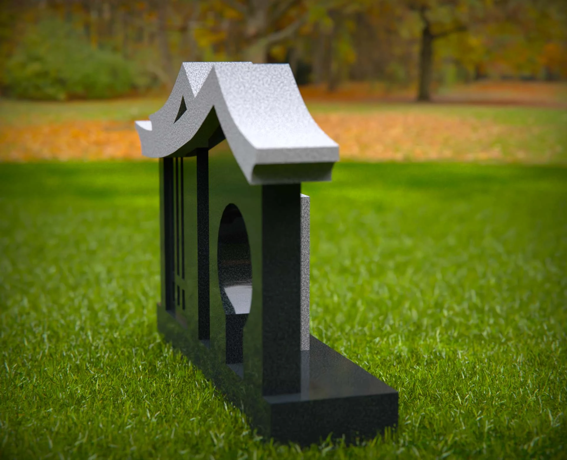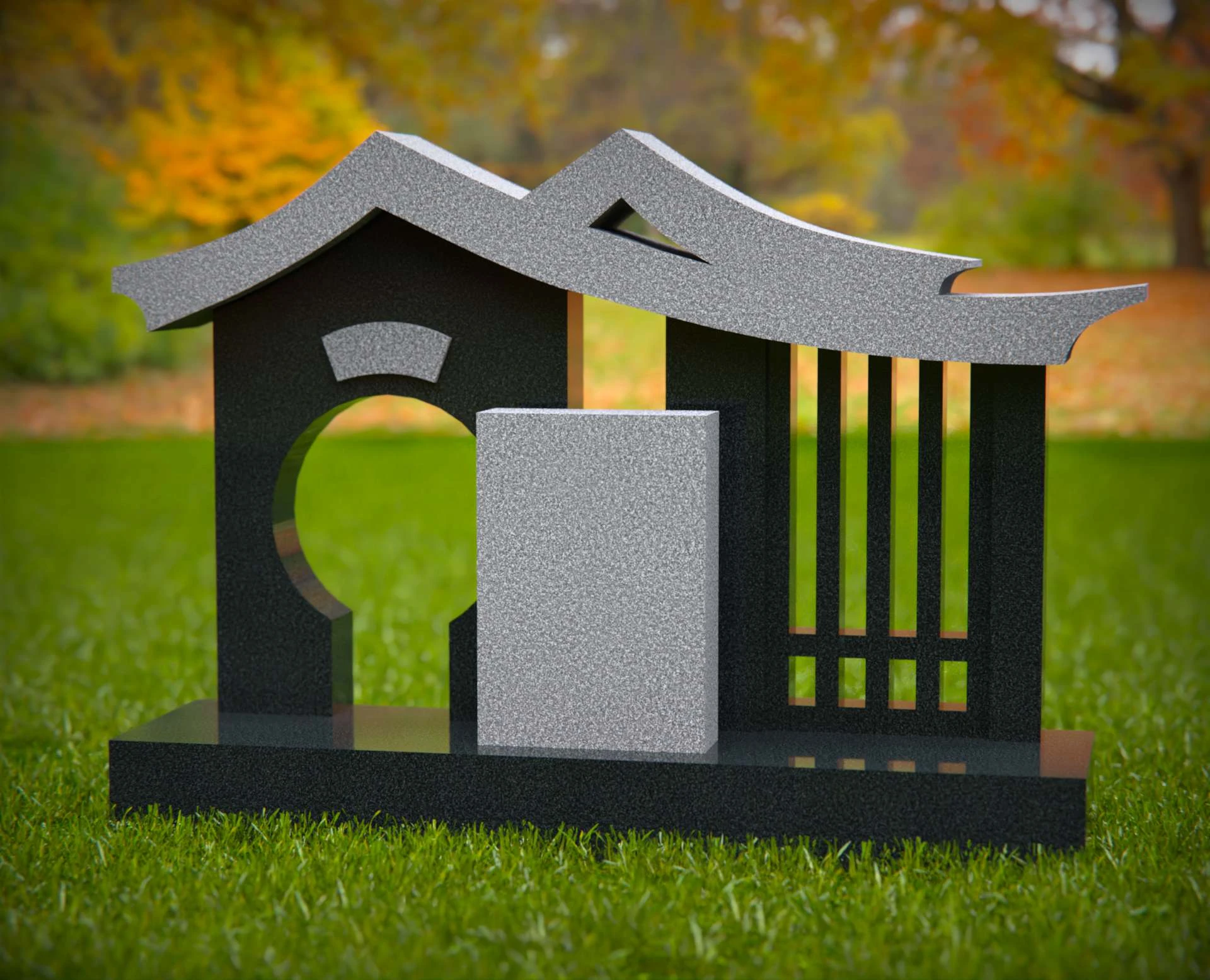 Dieser einzigartige, japanisch inspirierte Granitgrabstein verfügt über ein elegantes Pagodendach, das Harmonie, Tradition und spirituellen Frieden symbolisiert. Das komplexe Design beinhaltet eine Mondtor-Aussparung und vertikale Lamellendetails, die traditionelle asiatische Architektur widerspiegeln. Der polierte schwarze und graue Granit bietet eine moderne und doch zeitlose Ästhetik, was ihn zu einem ausgezeichneten Gedenk-Denkmal macht. Der zentrale Raum ermöglicht individuelle Inschriften und gewährleistet so eine persönliche und bedeutungsvolle Würdigung. Ideal für Friedhöfe und Gedenkgärten ist dieses künstlerische Monument eine schöne Art, die Erinnerung an einen geliebten Menschen zu ehren.