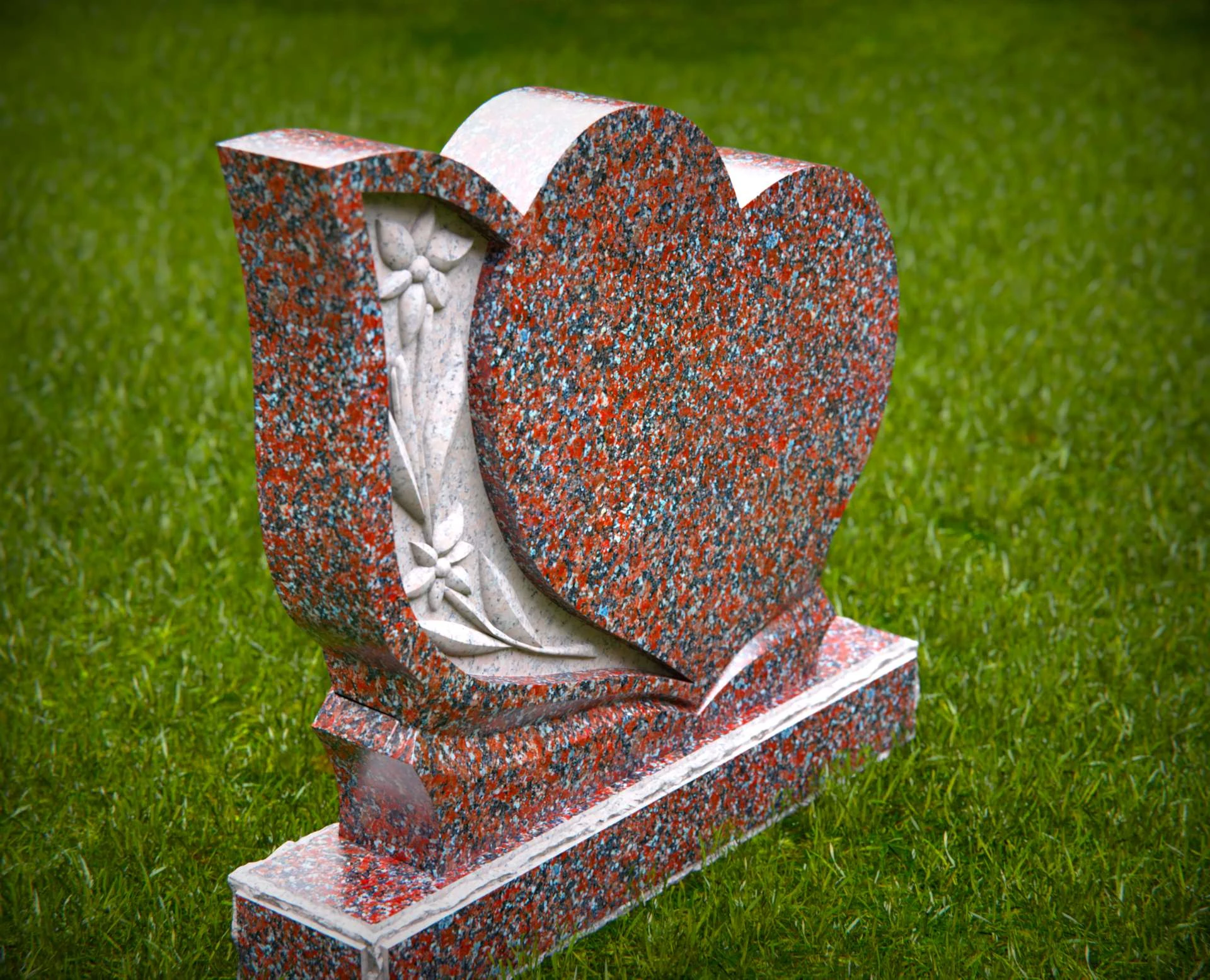 1955 - Herzförmiger Grabstein aus Granit mit geschnitzten Blumenakzenten