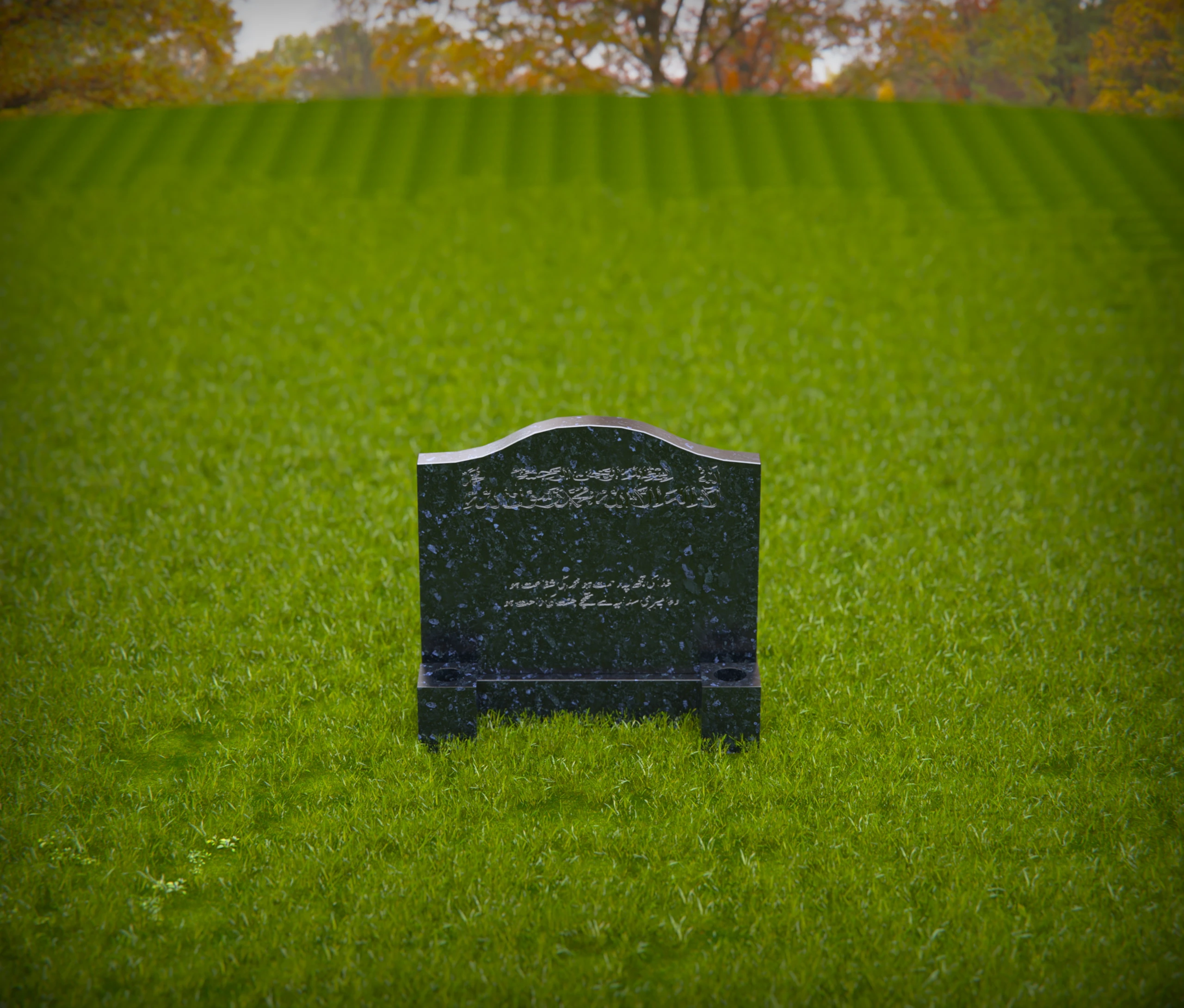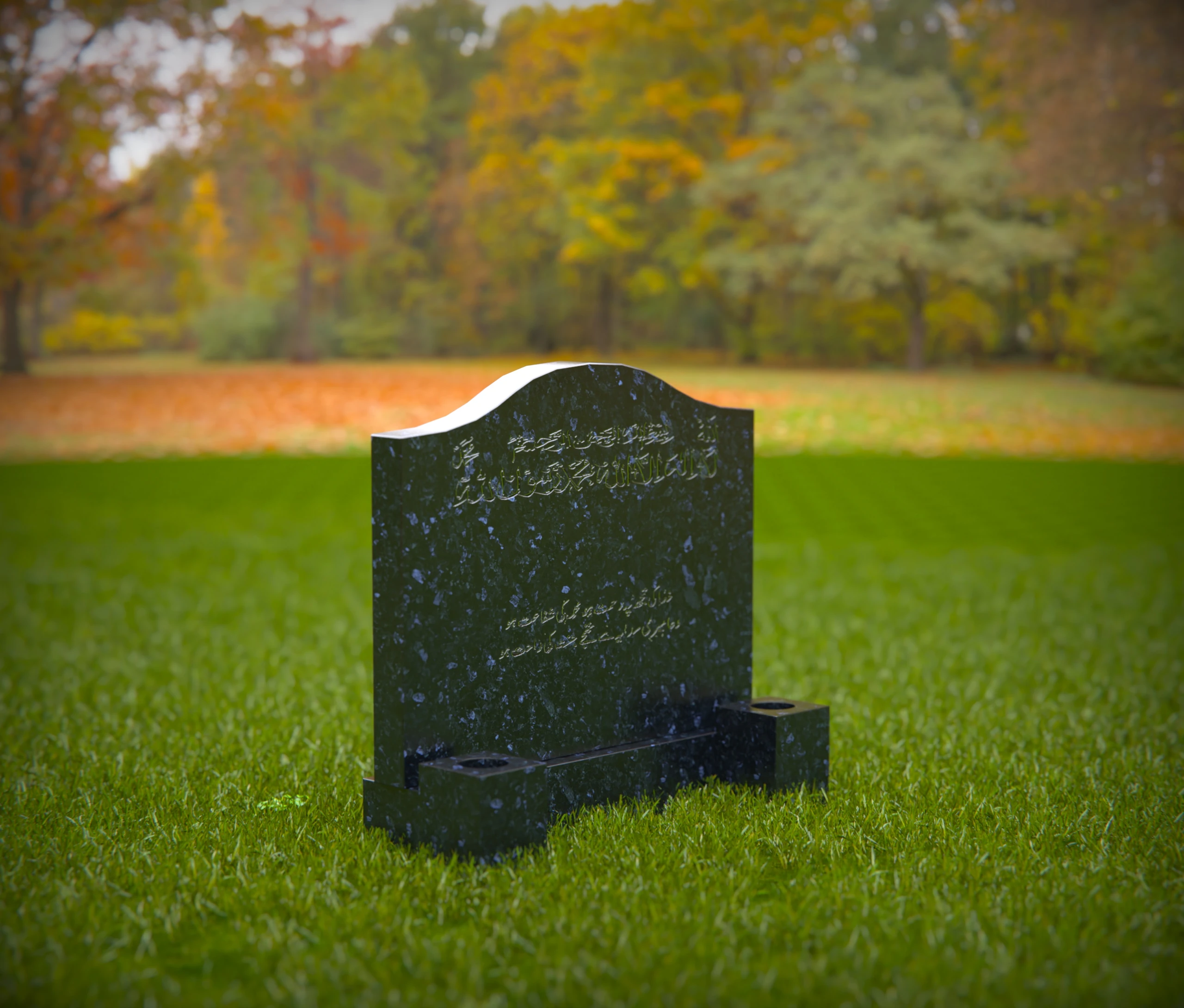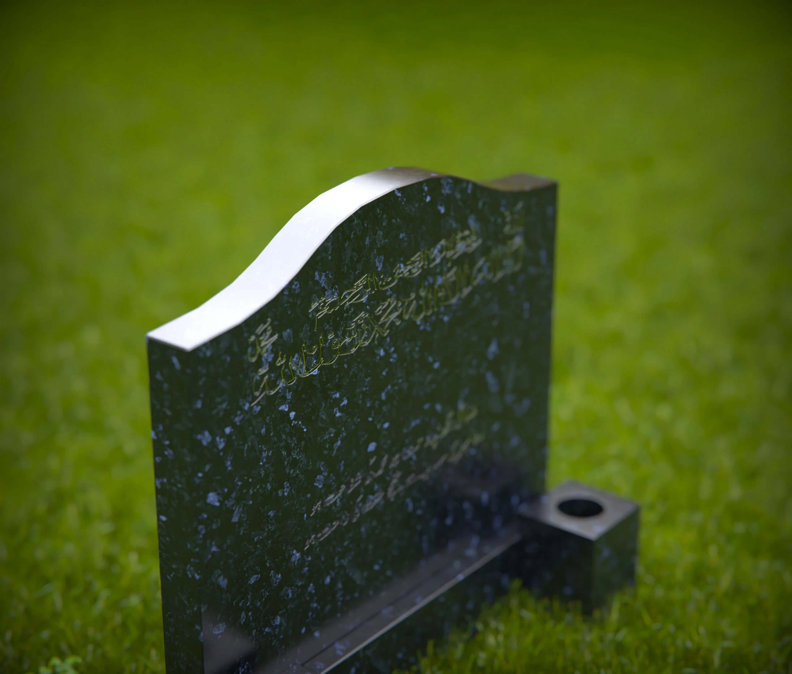 Una lápida islámica elegante y bien diseñada con una inscripción en árabe, que honra la fe y el recuerdo. Esta lápida está situada en un cementerio tranquilo, proporcionando un homenaje digno y respetuoso al difunto. El entorno natural realza el ambiente solemne y espiritual.