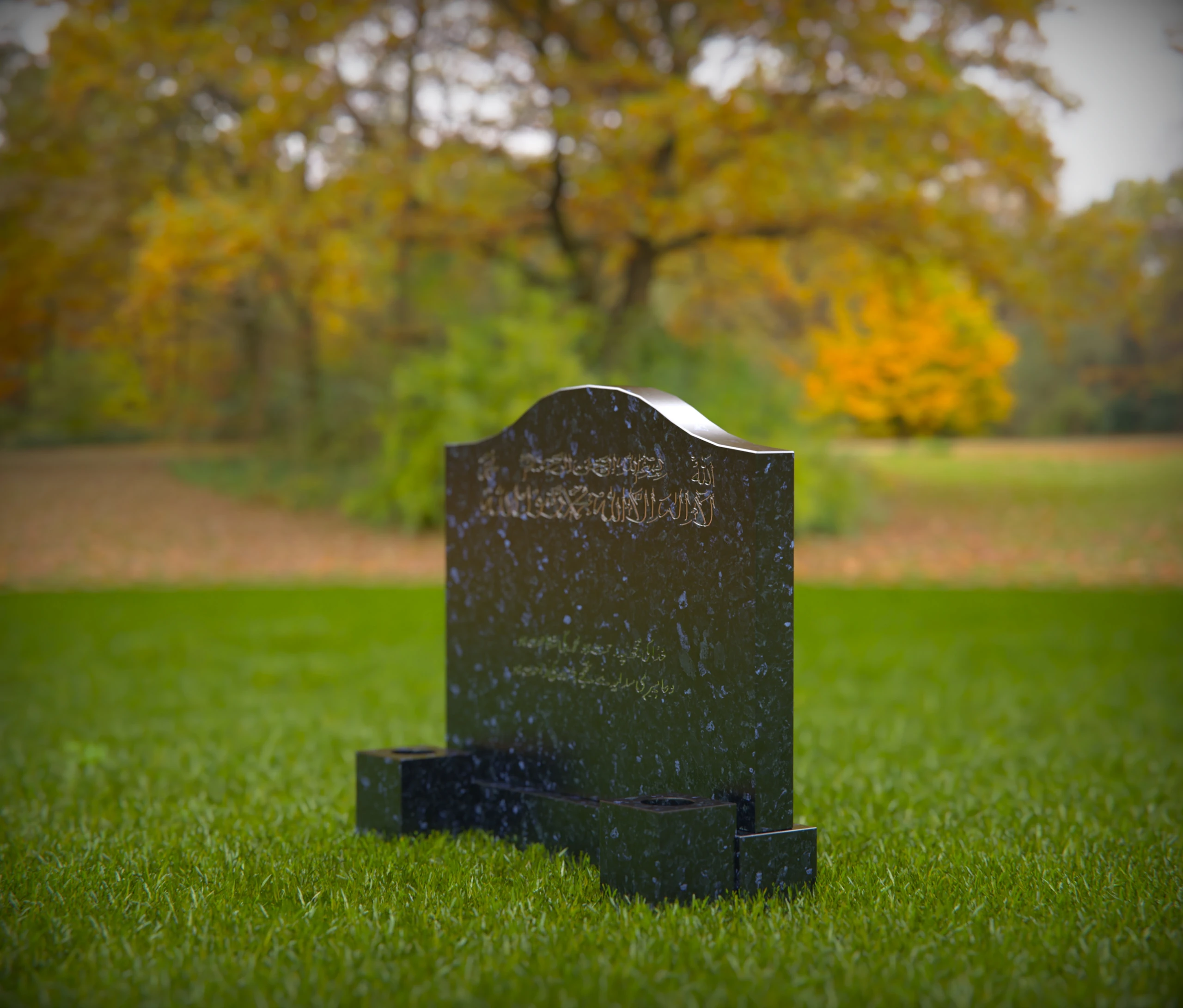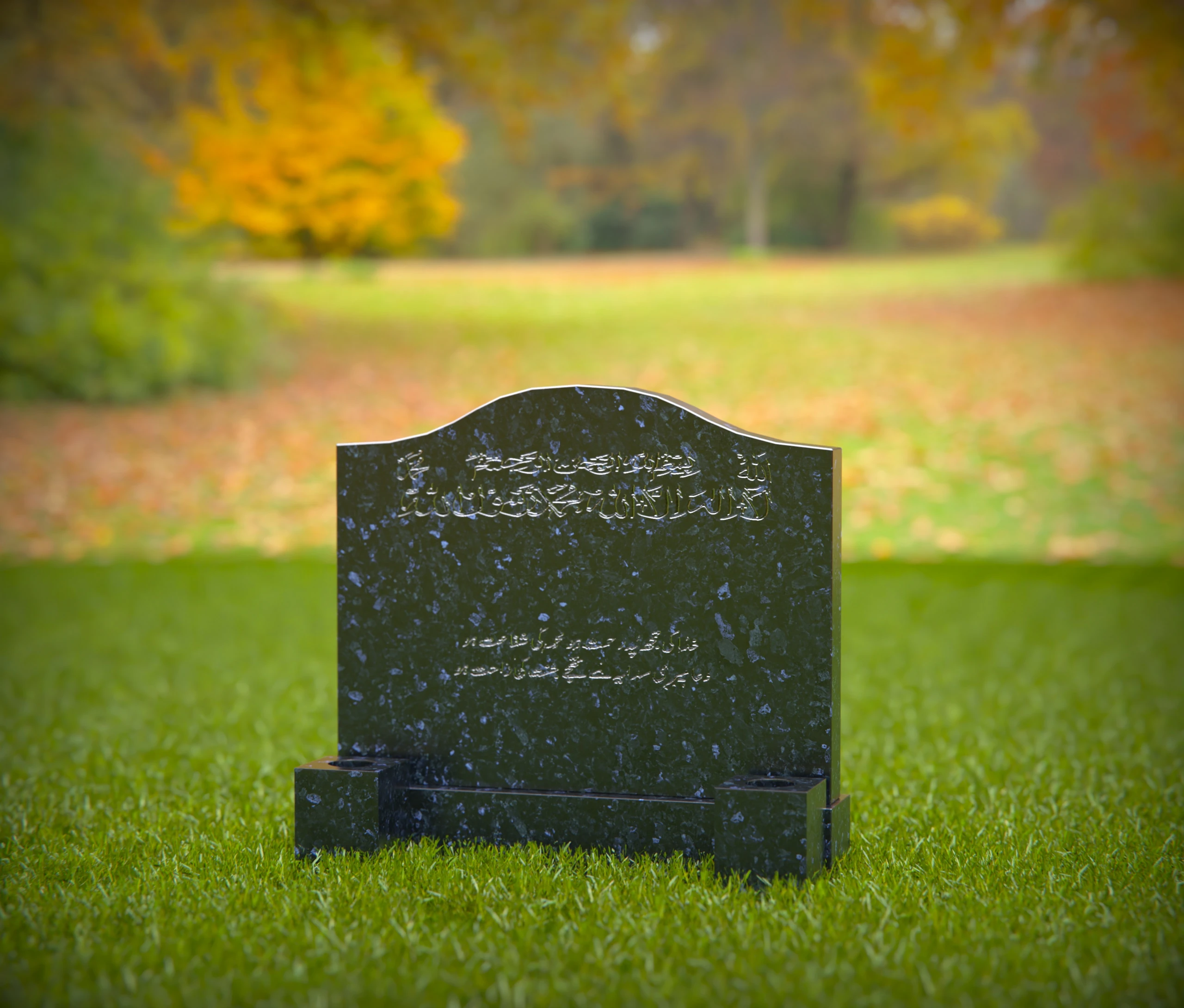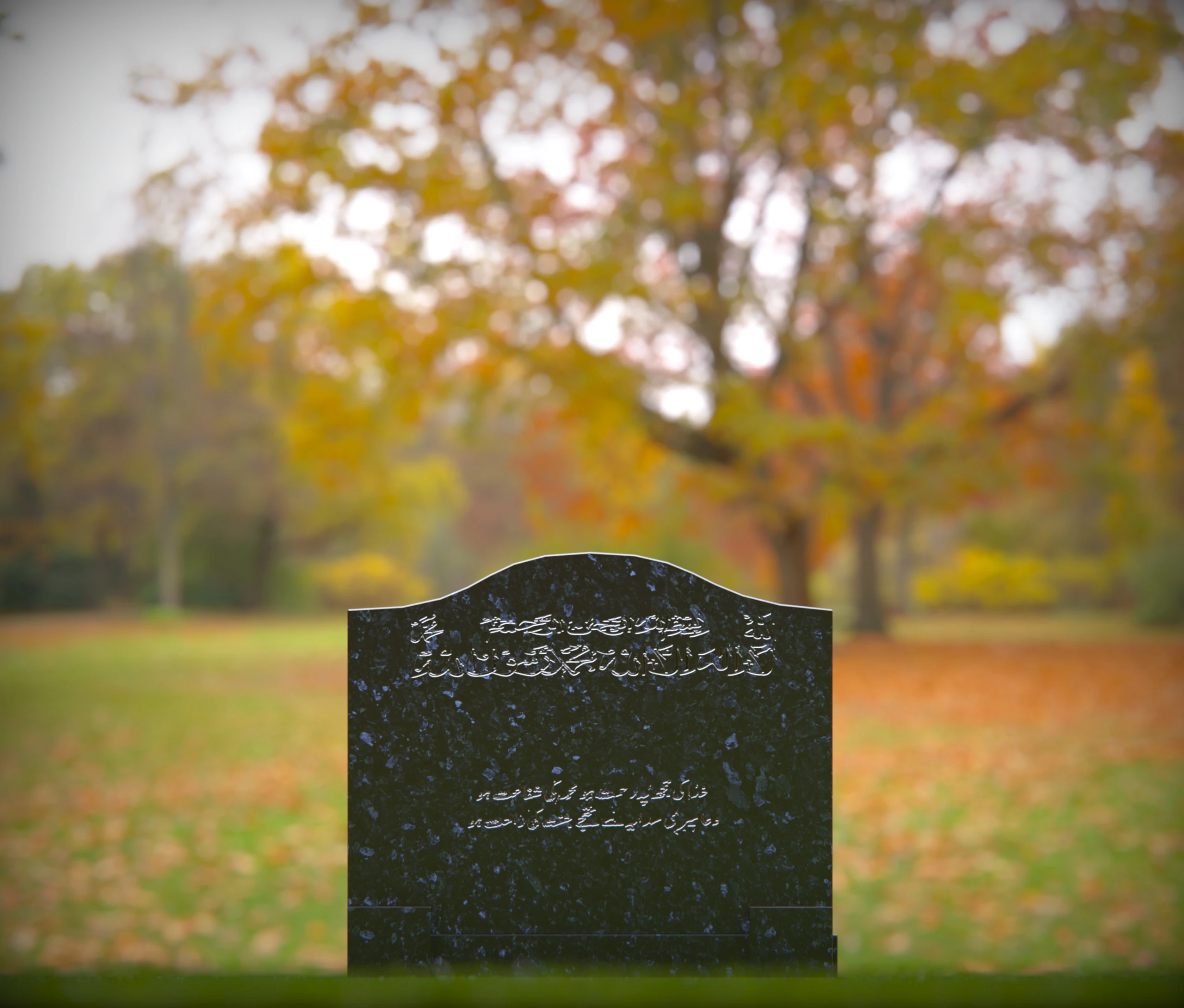 Una lápida islámica elegante y bien diseñada con una inscripción en árabe, que honra la fe y el recuerdo. Esta lápida está situada en un cementerio tranquilo, proporcionando un homenaje digno y respetuoso al difunto. El entorno natural realza el ambiente solemne y espiritual.