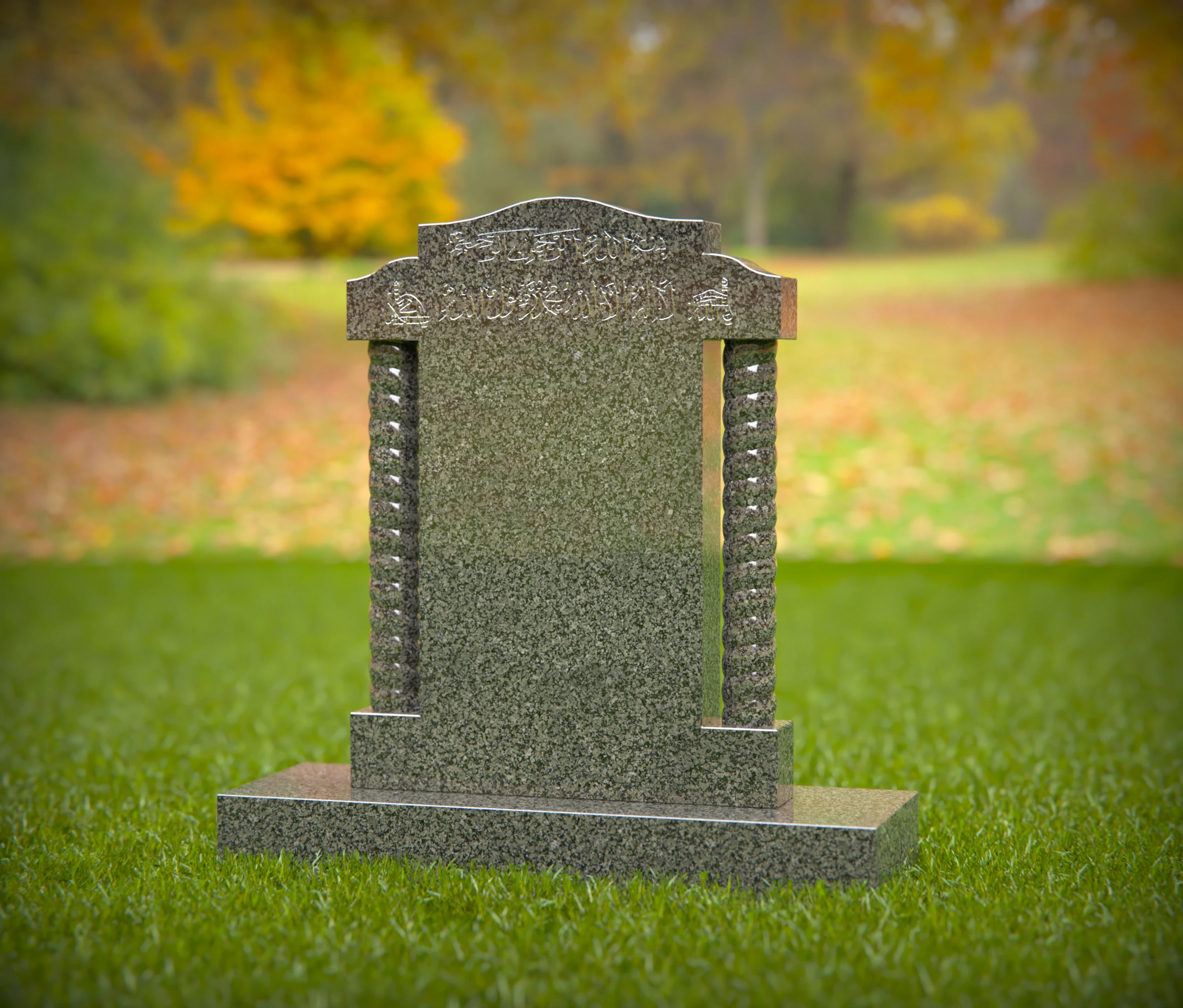 Una hermosa lápida conmemorativa islámica diseñada con una elegante estructura de estilo de pilar e intrincada inscripción en árabe. Esta digna lápida se encuentra en un tranquilo cementerio, simbolizando fe, recuerdo y devoción. El pacífico entorno natural realza el ambiente solemne y espiritual del lugar de descanso.
