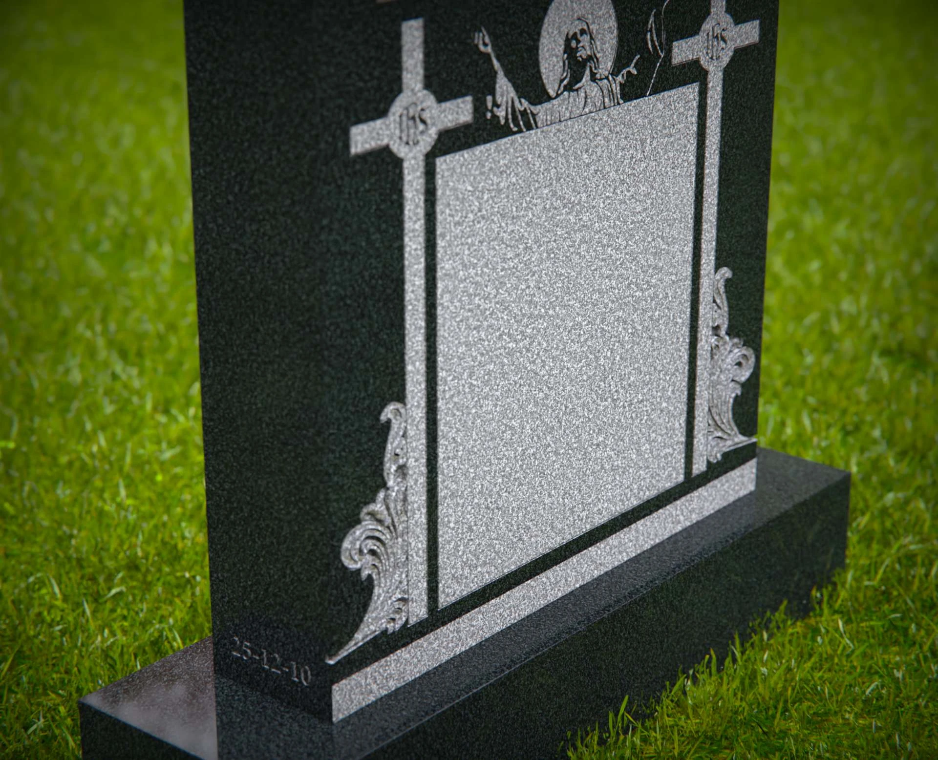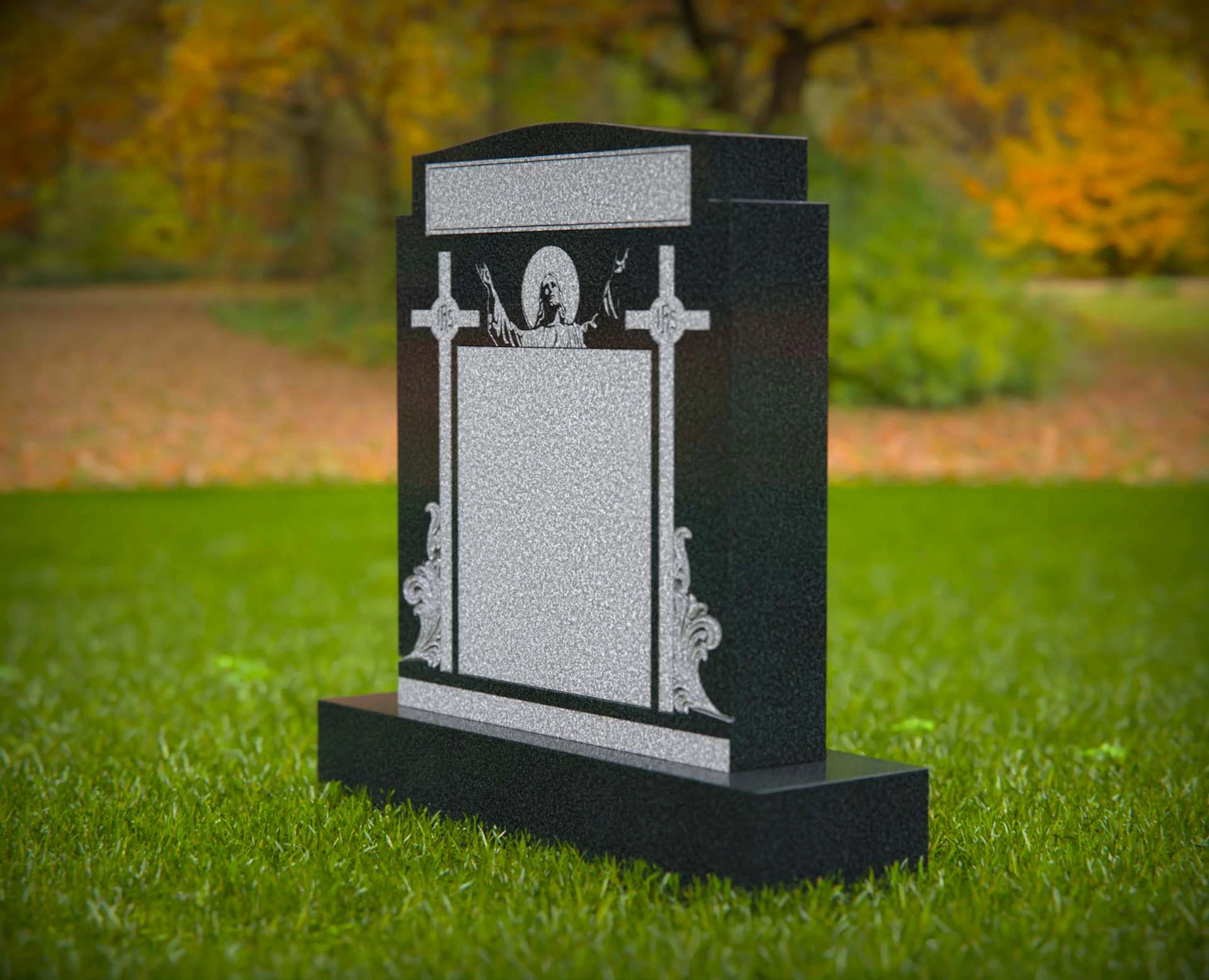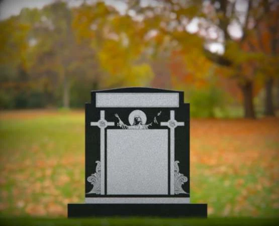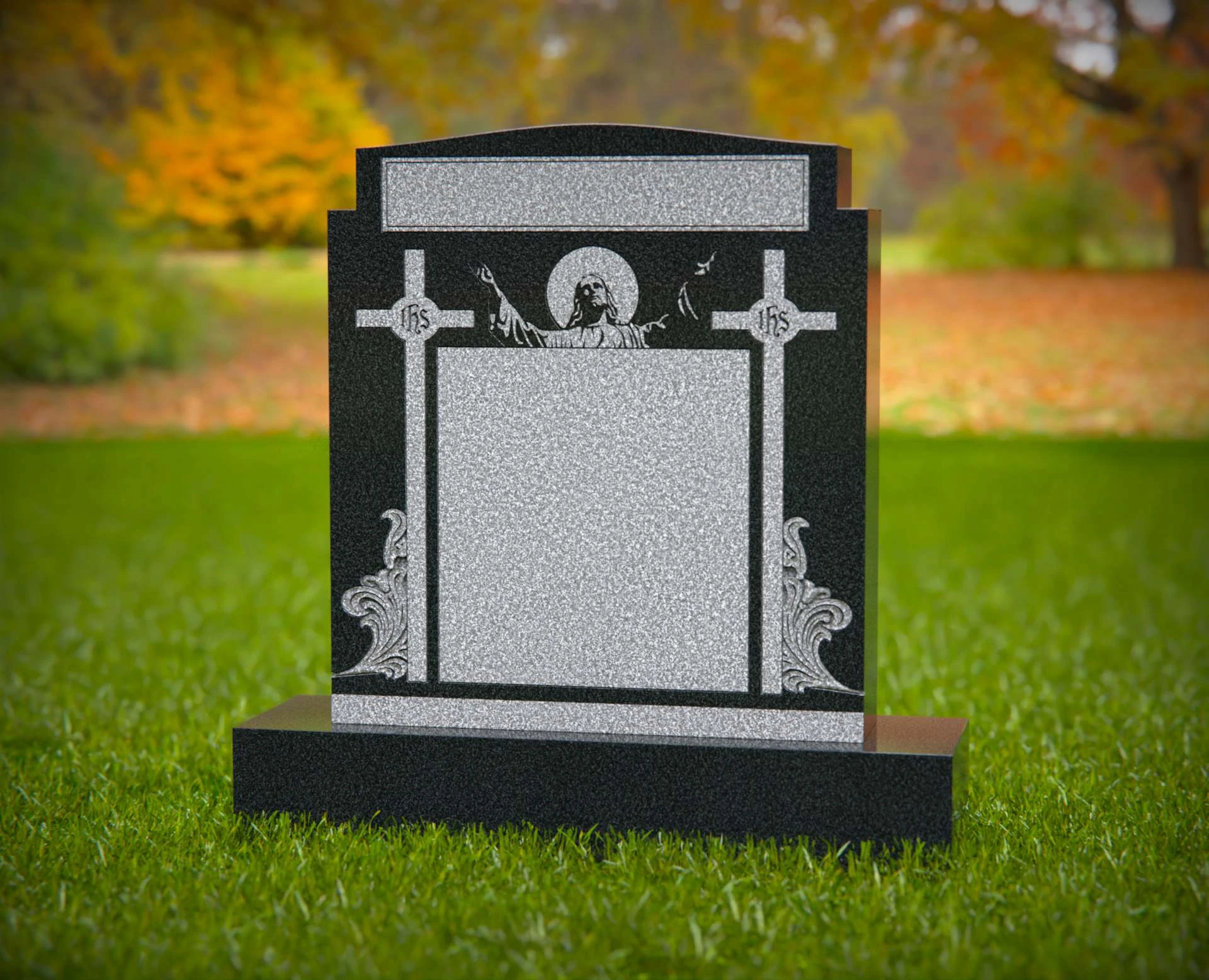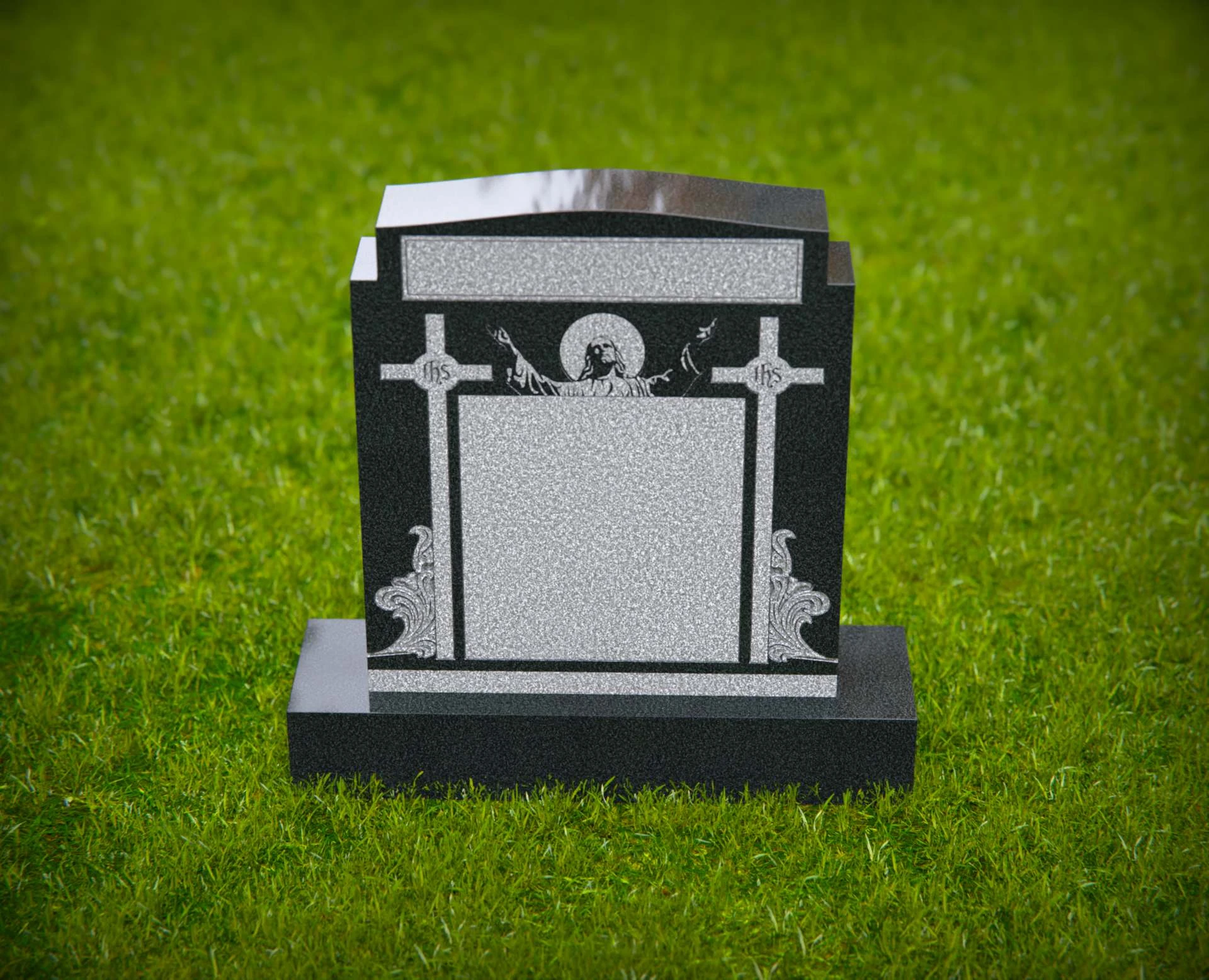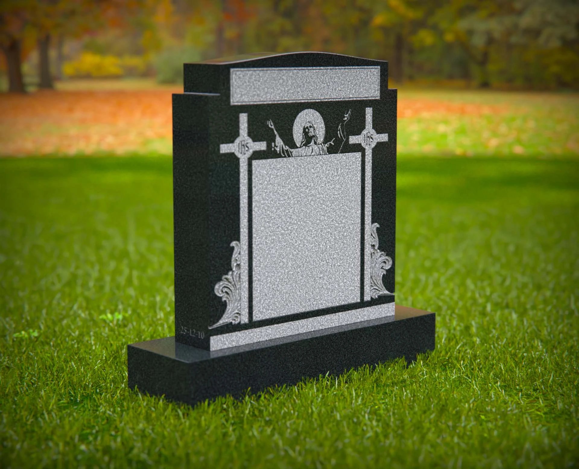 Una hermosa lápida cristiana detallada que presenta una representación grabada de Jesucristo con las manos extendidas, simbolizando la fe y la guía divina. Las dos cruces, adornadas con las inscripciones "IHS", añaden a la significancia espiritual de este memorial. Con detalles ornamentales, esta lápida proporciona un tributo sagrado e imperecedero a un ser querido. Perfecto para discusiones sobre diseños de lápidas religiosas y tradiciones de entierro cristianas.