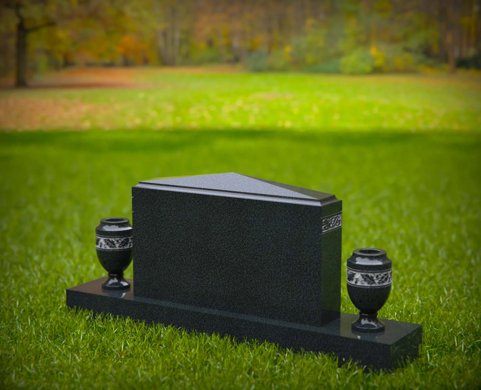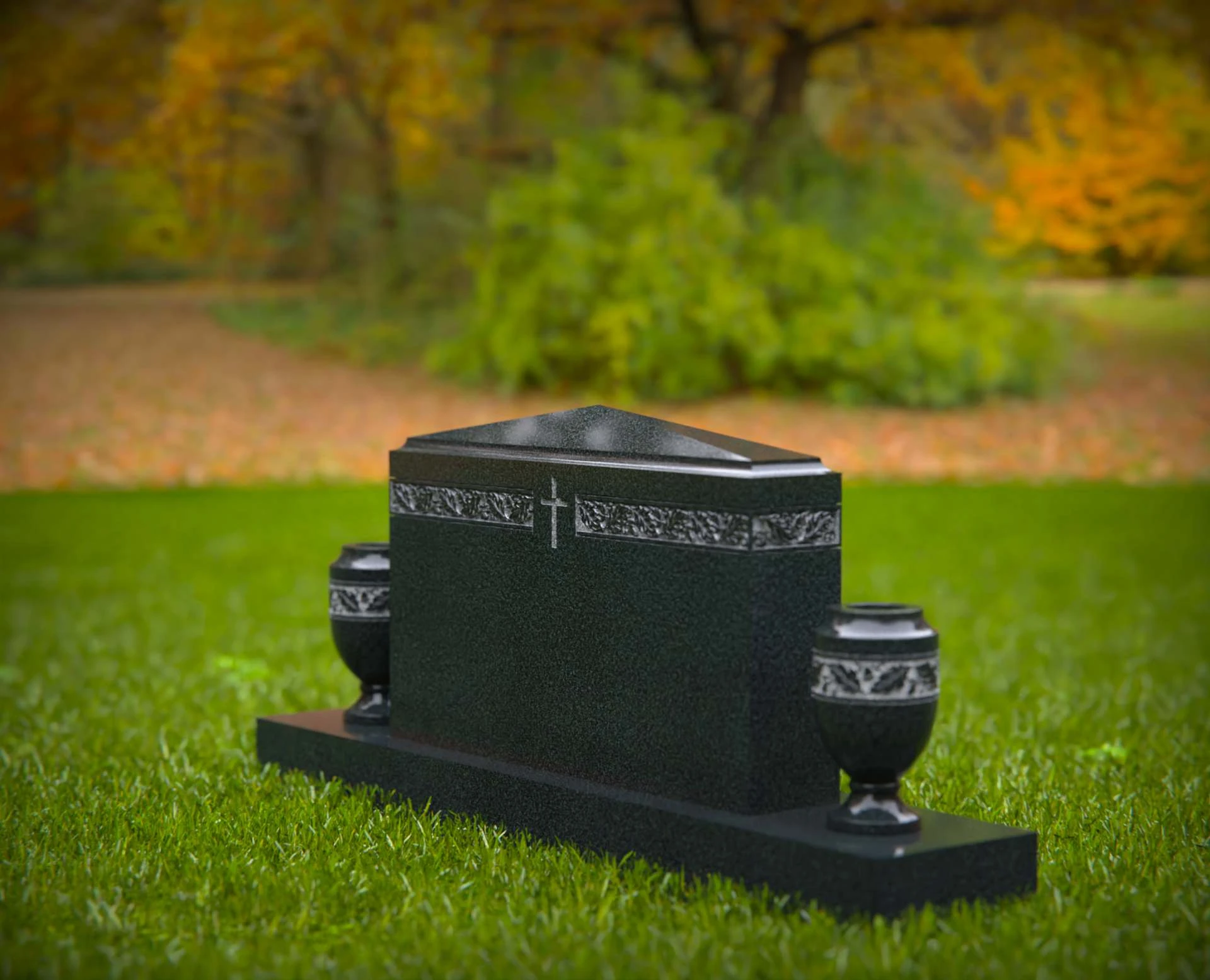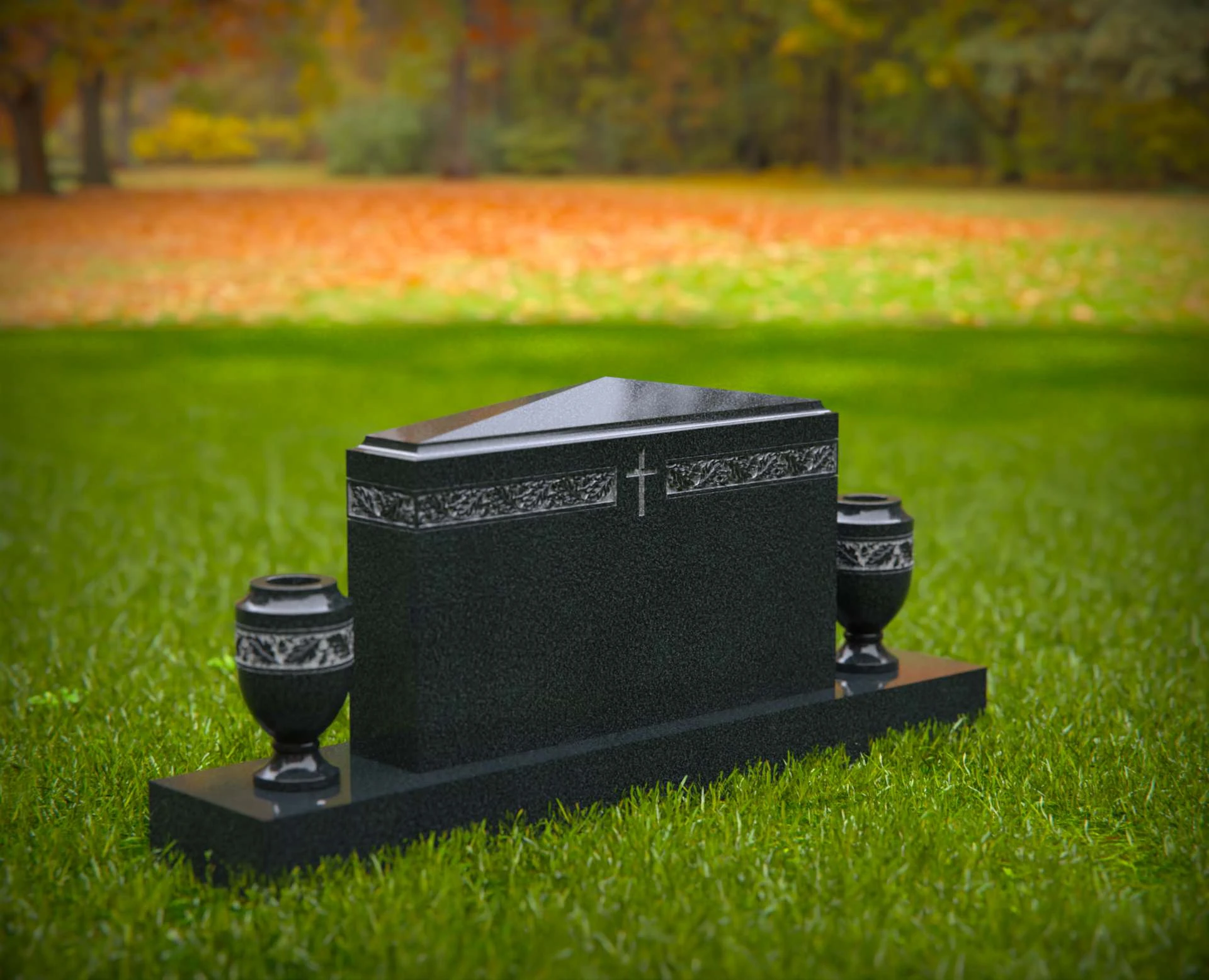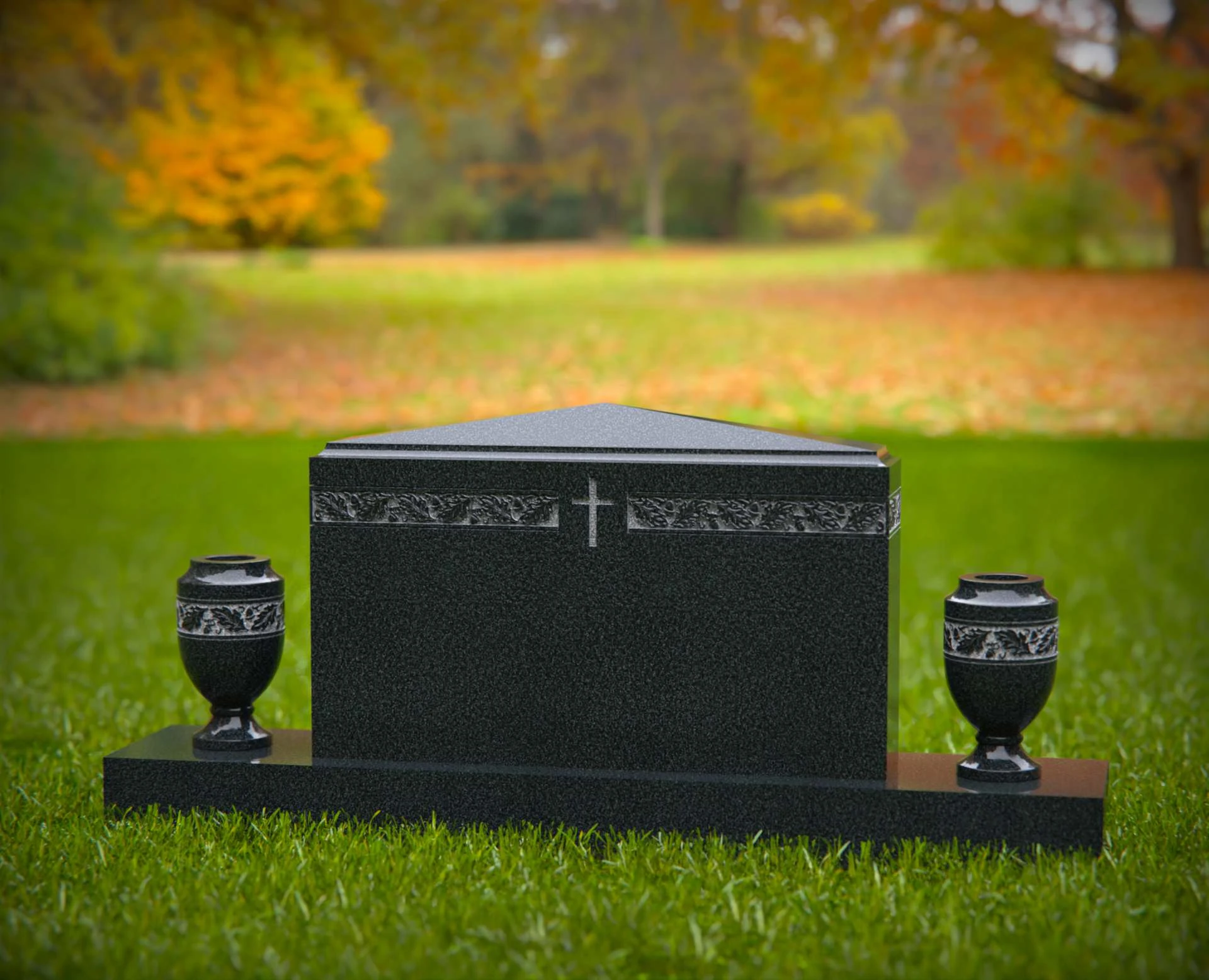 Una hermosa lápida conmemorativa inclinada que presenta una cruz grabada y patrones florales decorativos. Acompañada de dos elegantes jarrones, esta lápida proporciona un homenaje eterno a un ser querido. El diseño único añade un toque distinguido, reflejando fe, recuerdo y paz eterna. Situado en un sereno paisaje de cementerio, este monumento es ideal para discusiones sobre estilos de lápidas cristianas y monumentos personalizados.