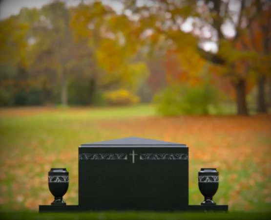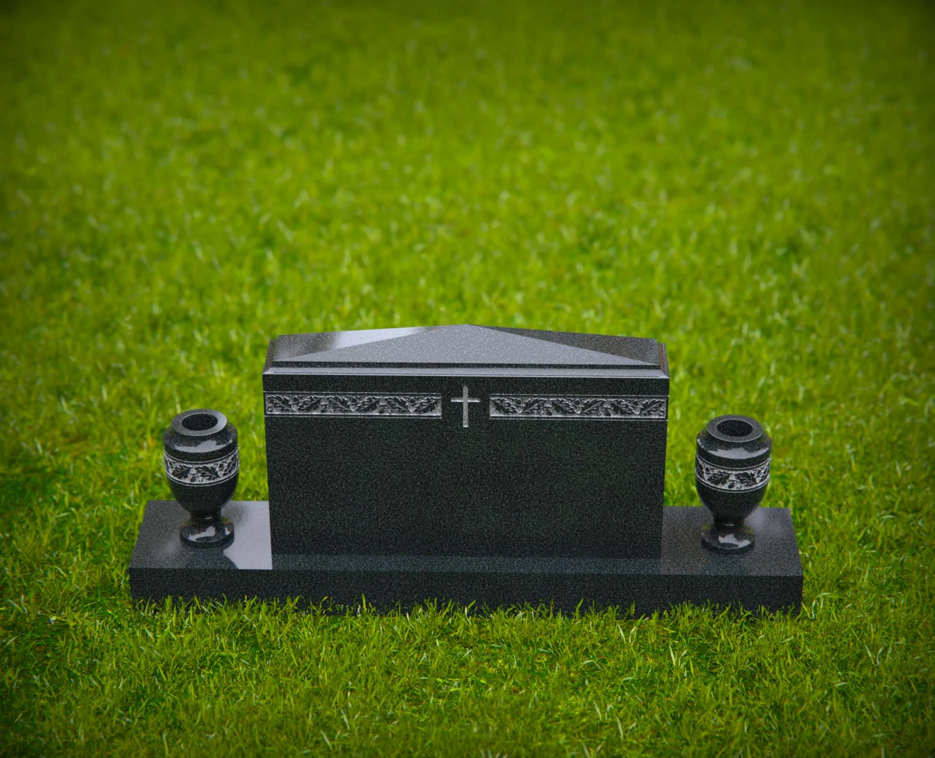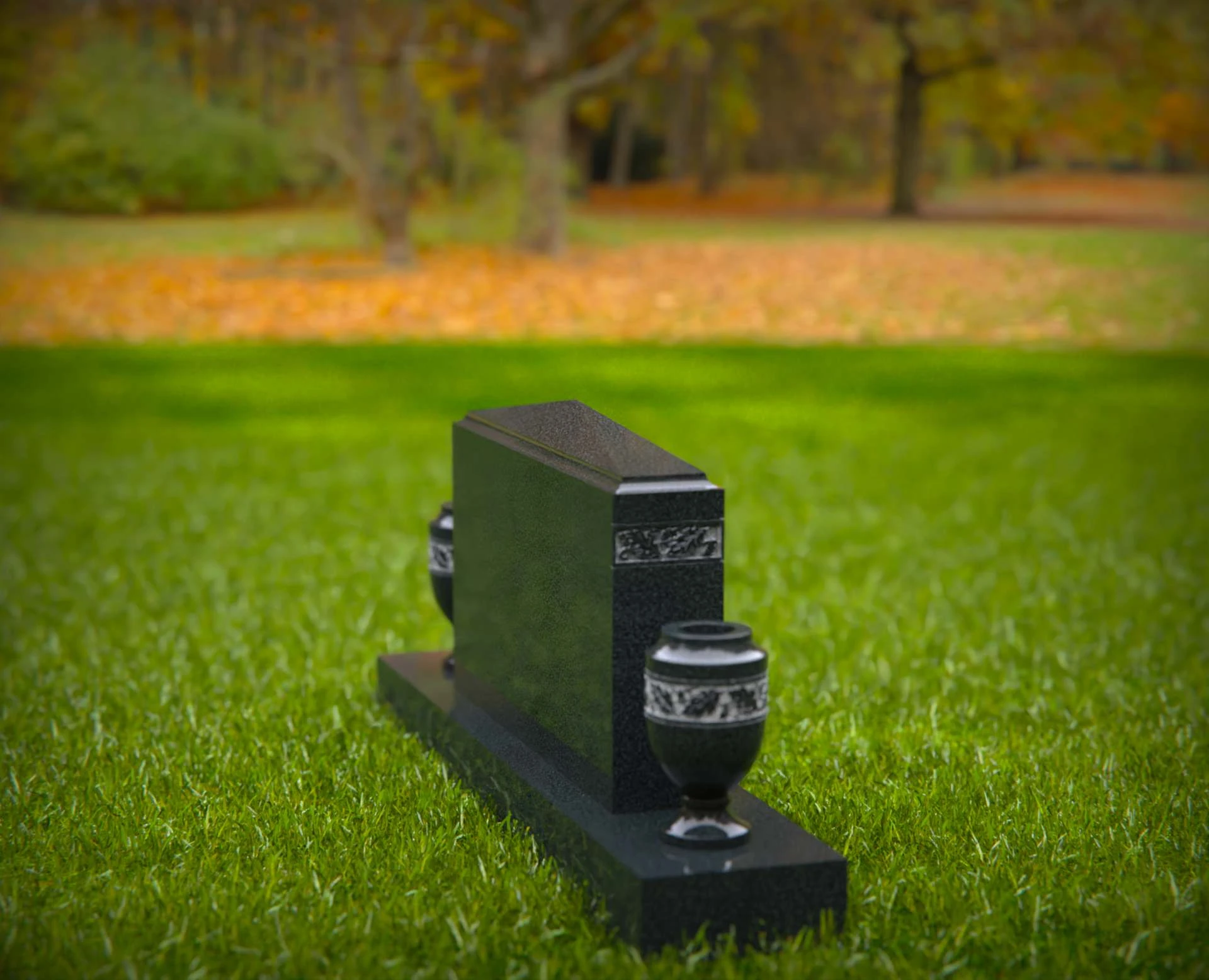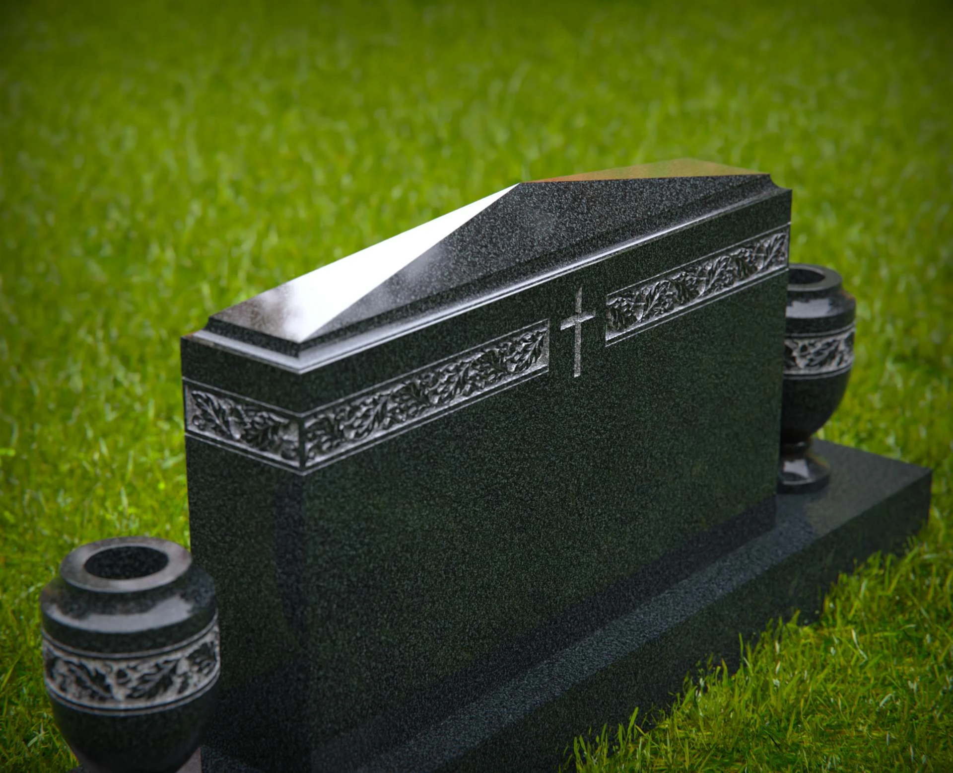 Una hermosa lápida conmemorativa inclinada que presenta una cruz grabada y patrones florales decorativos. Acompañada de dos elegantes jarrones, esta lápida proporciona un homenaje eterno a un ser querido. El diseño único añade un toque distinguido, reflejando fe, recuerdo y paz eterna. Situado en un sereno paisaje de cementerio, este monumento es ideal para discusiones sobre estilos de lápidas cristianas y monumentos personalizados.