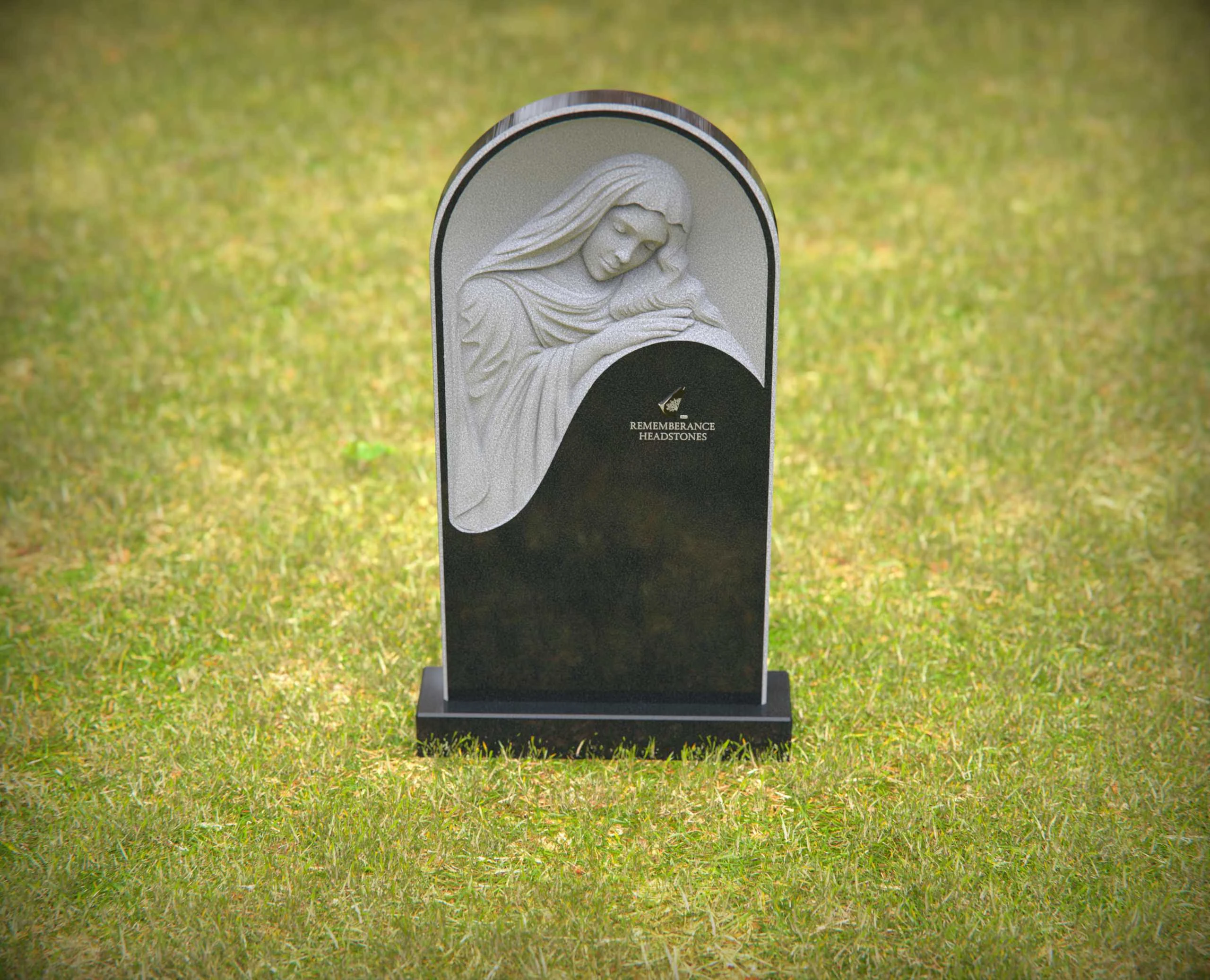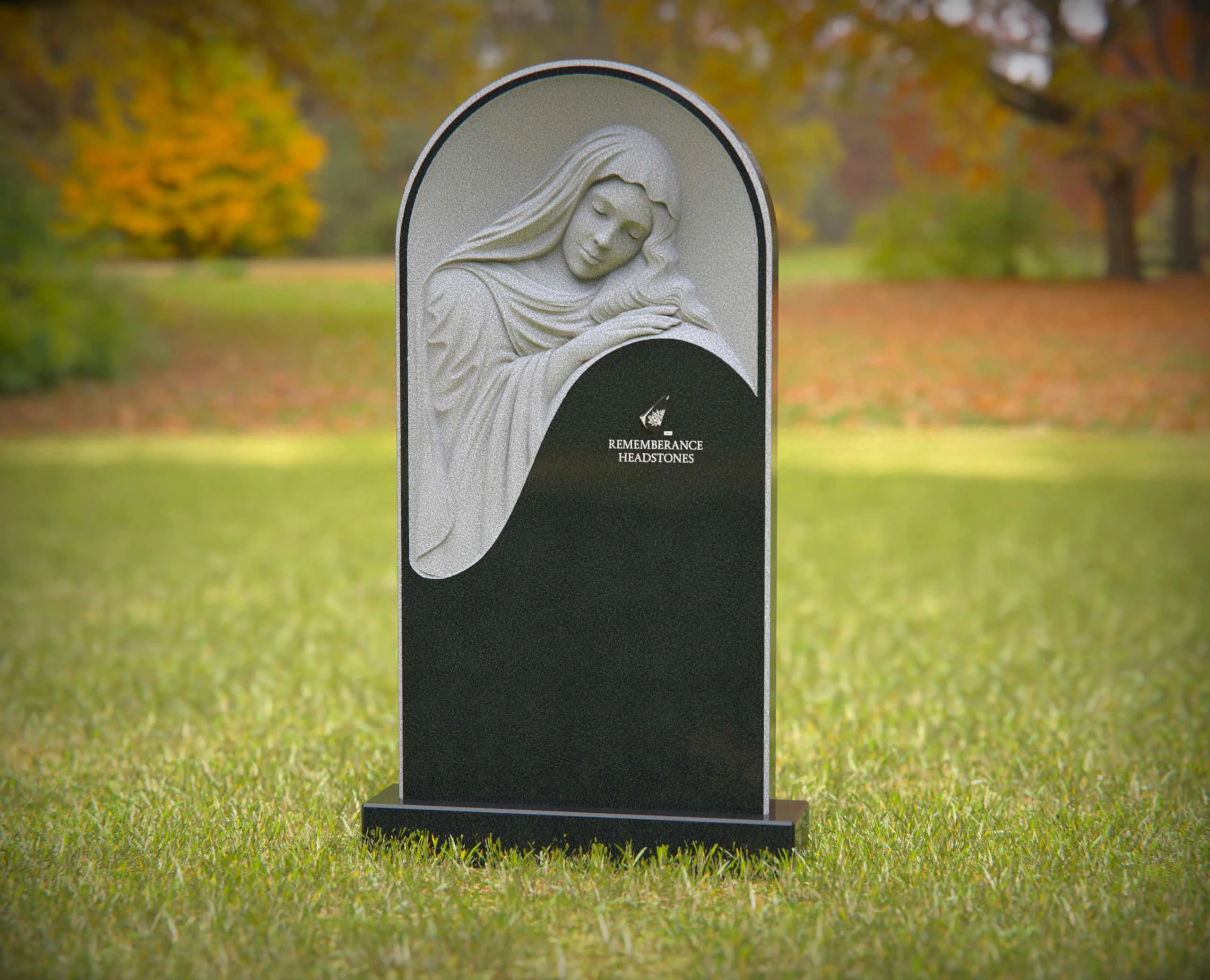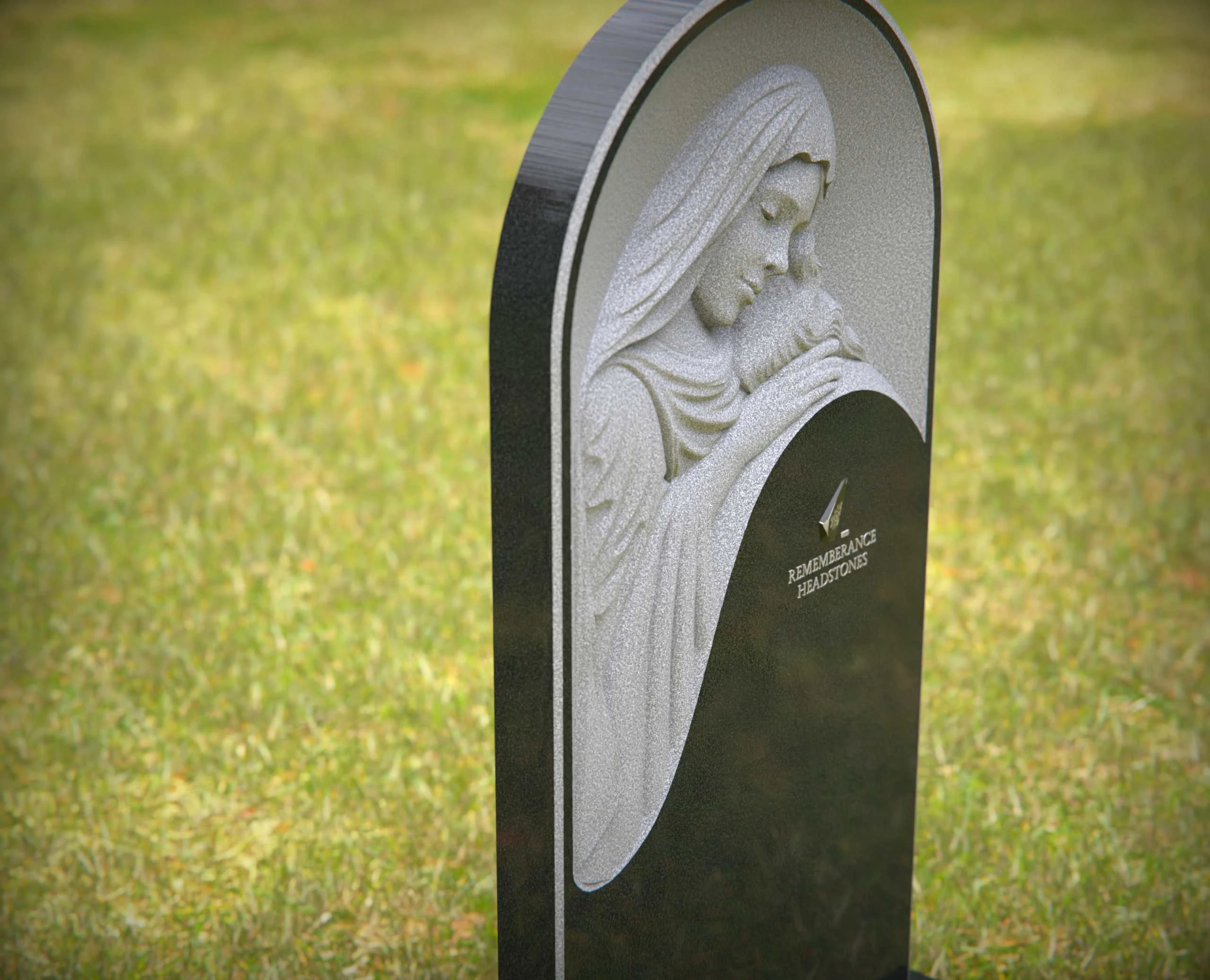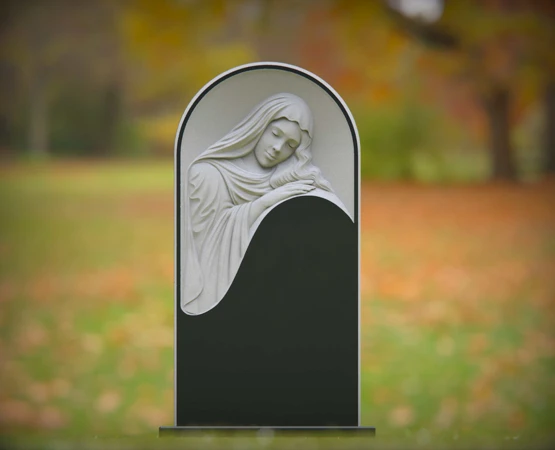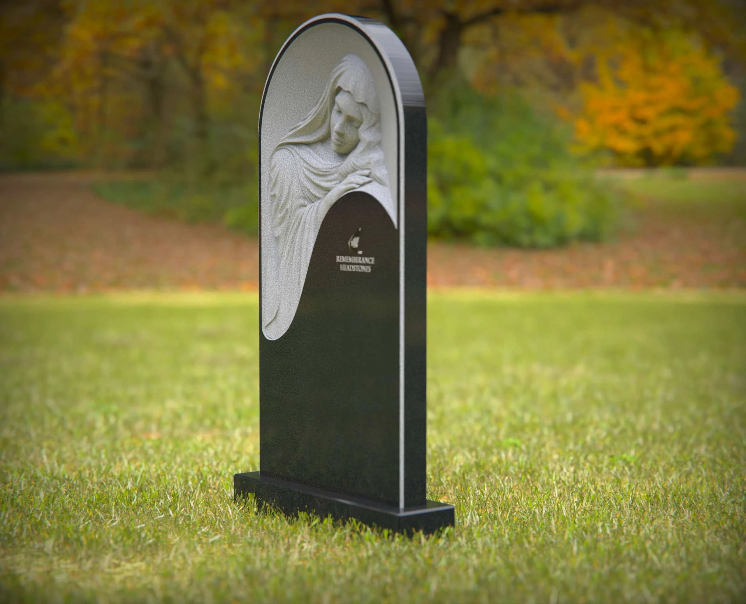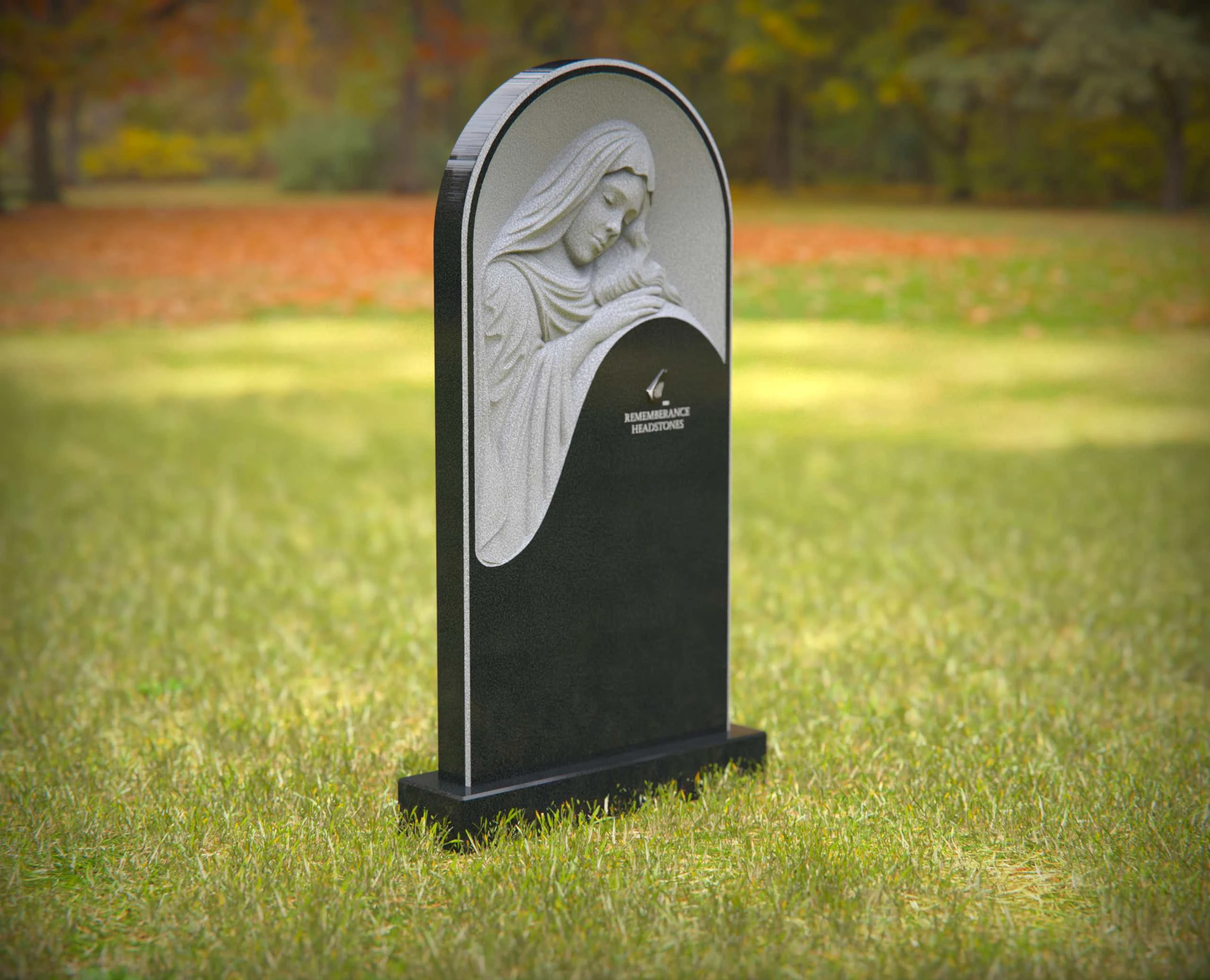 This timeless granite headstone features a serene engraving of a religious figure, symbolizing peace and eternal rest. The design incorporates smooth edges and a polished finish, perfect for honoring and remembering a loved one. Crafted with durable materials to withstand the elements, this headstone is an elegant addition to any memorial site.