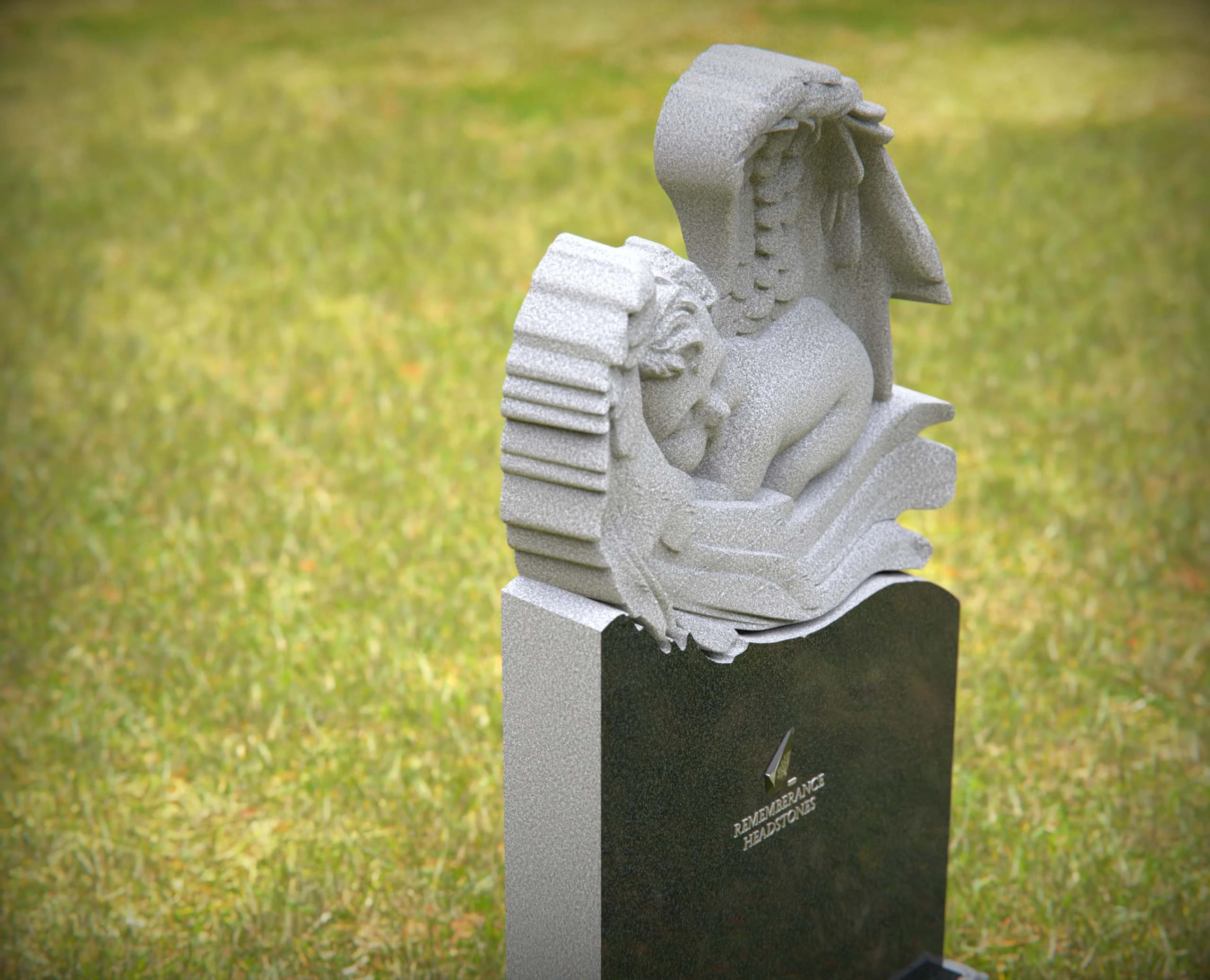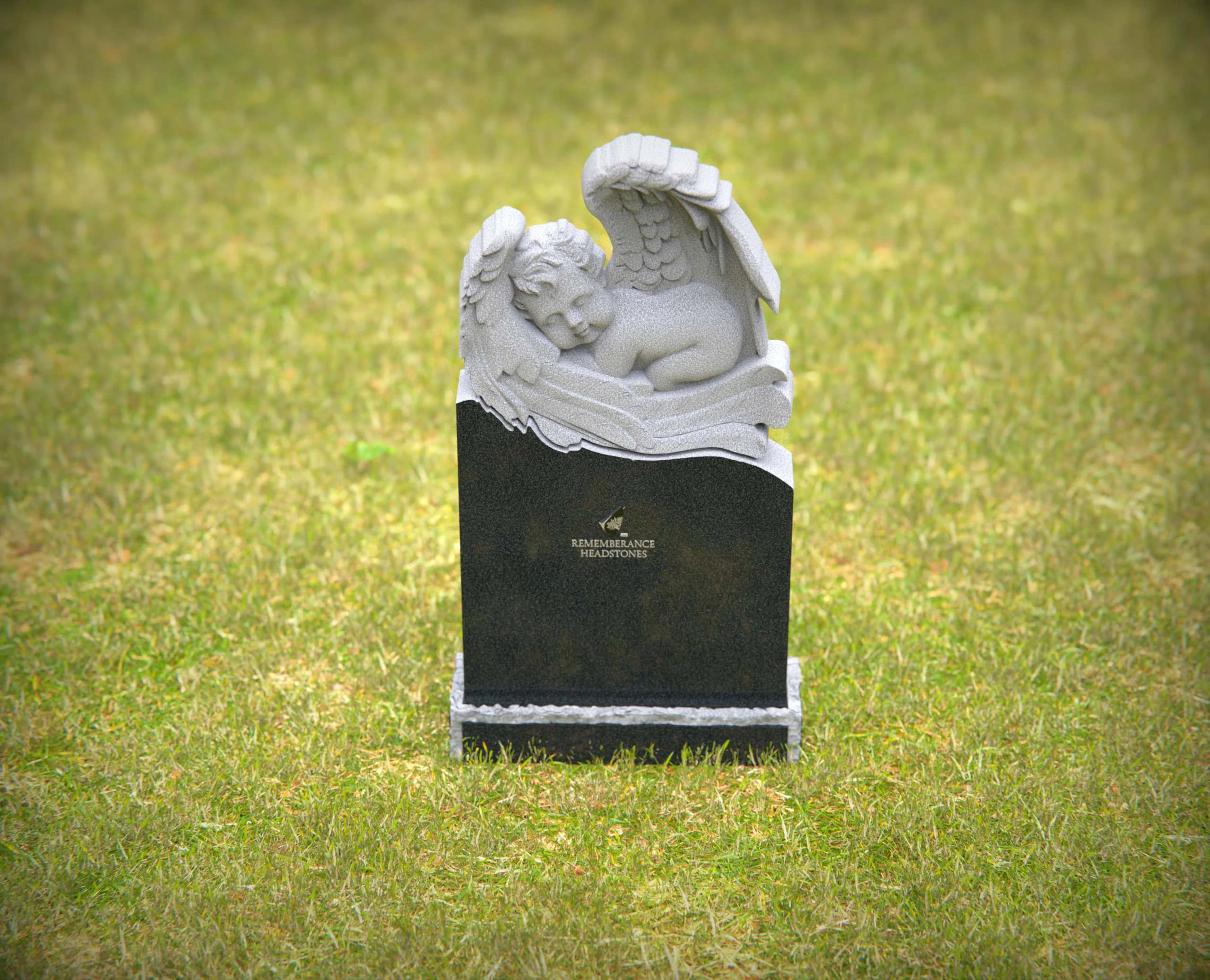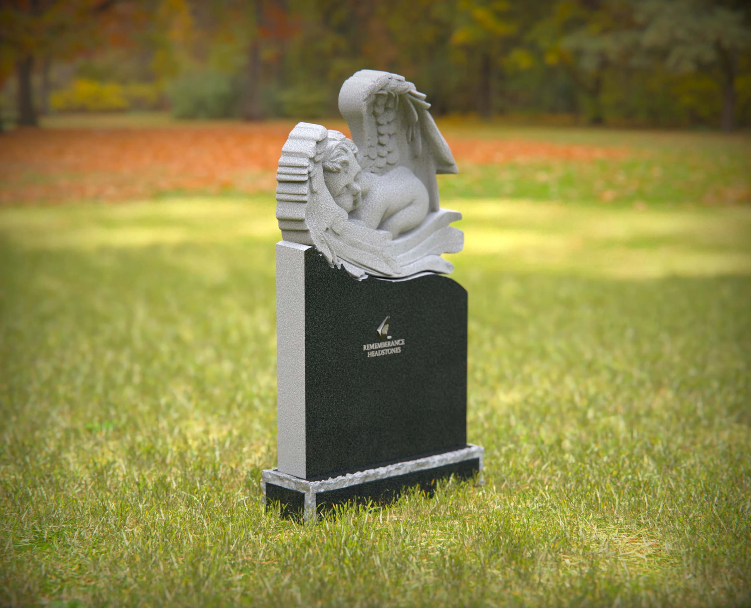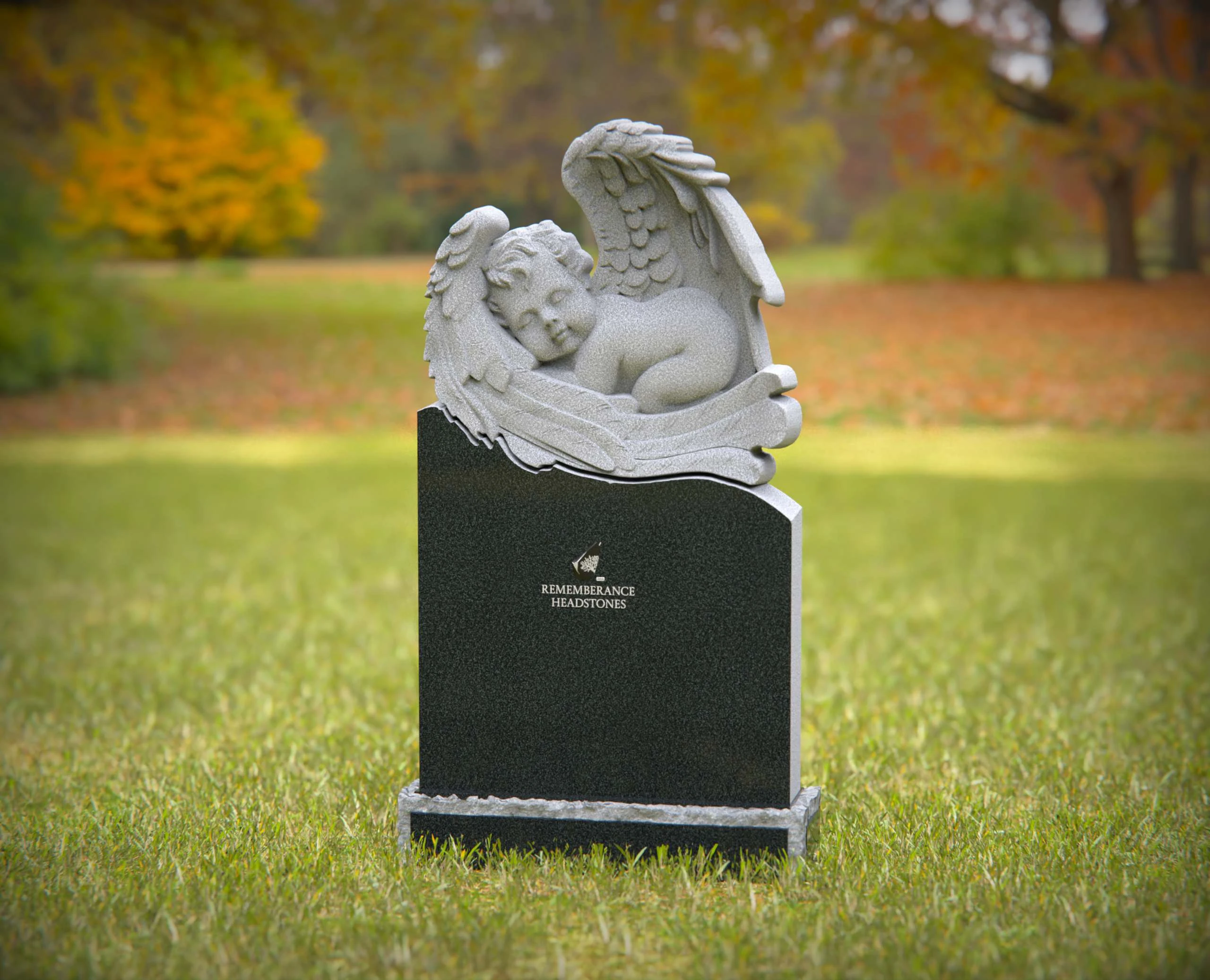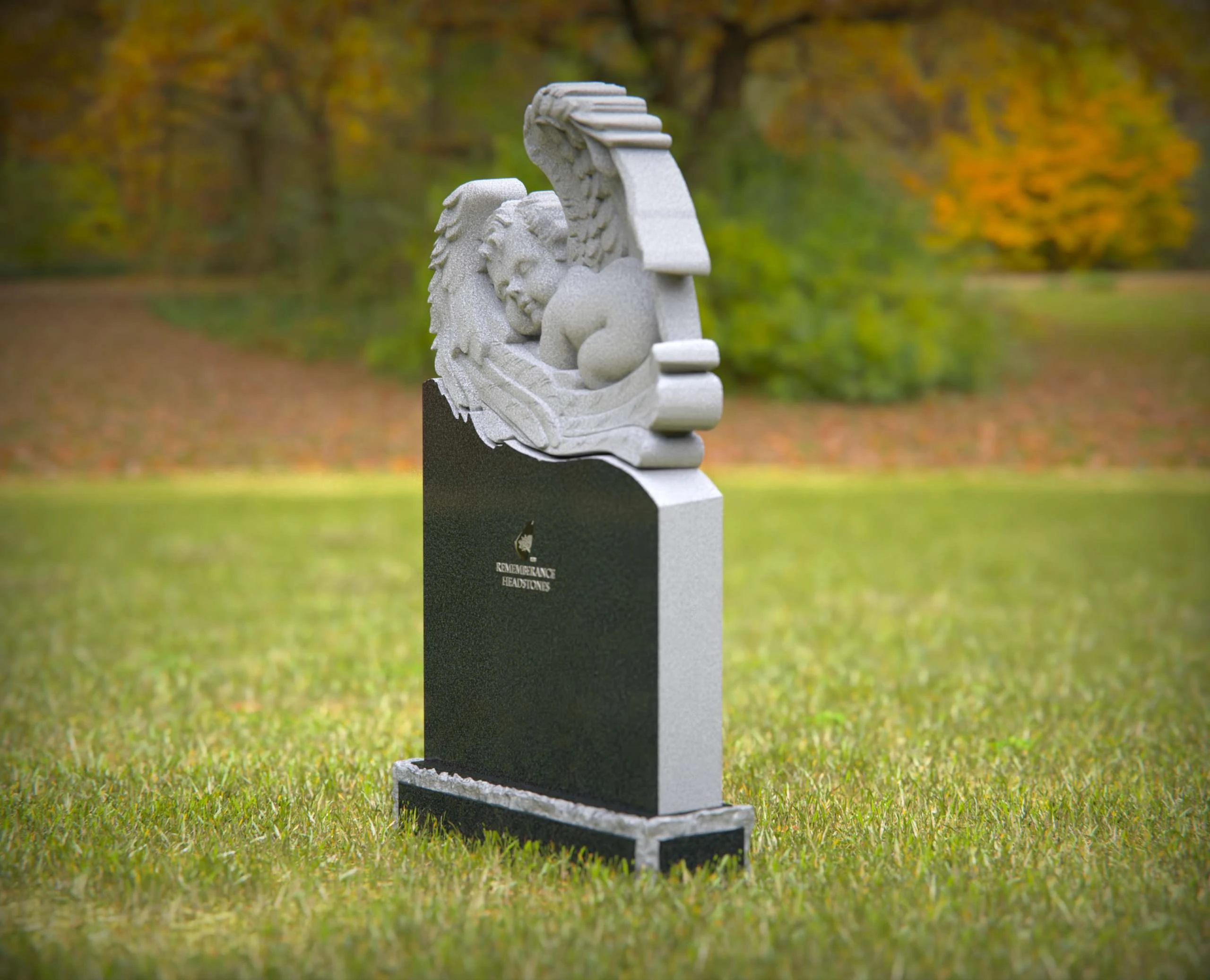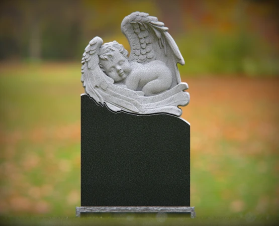 This touching memorial features a red granite upright headstone, with a gracefully sculpted sleeping angel resting on top. The angel's peaceful pose symbolizes eternal rest and protection, offering comfort and serenity. The polished granite surface provides space for personal inscriptions, making it a meaningful and lasting tribute to a loved one. Beautifully crafted, this headstone captures both elegance and sentiment in its design.