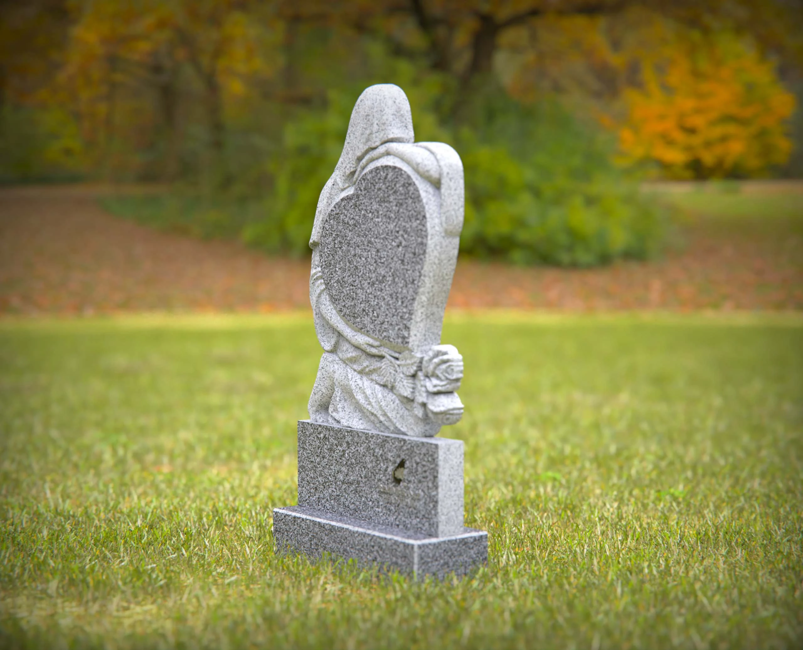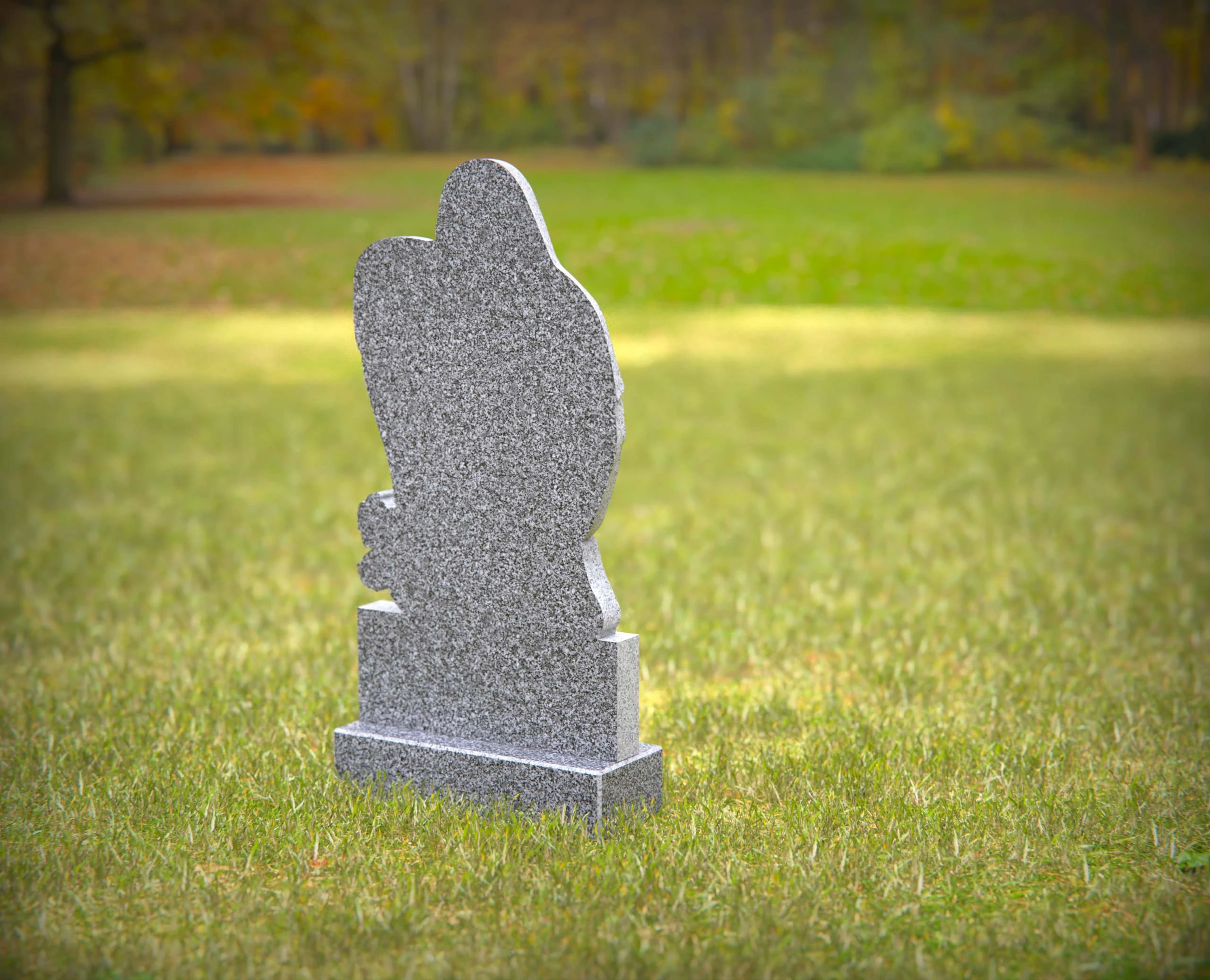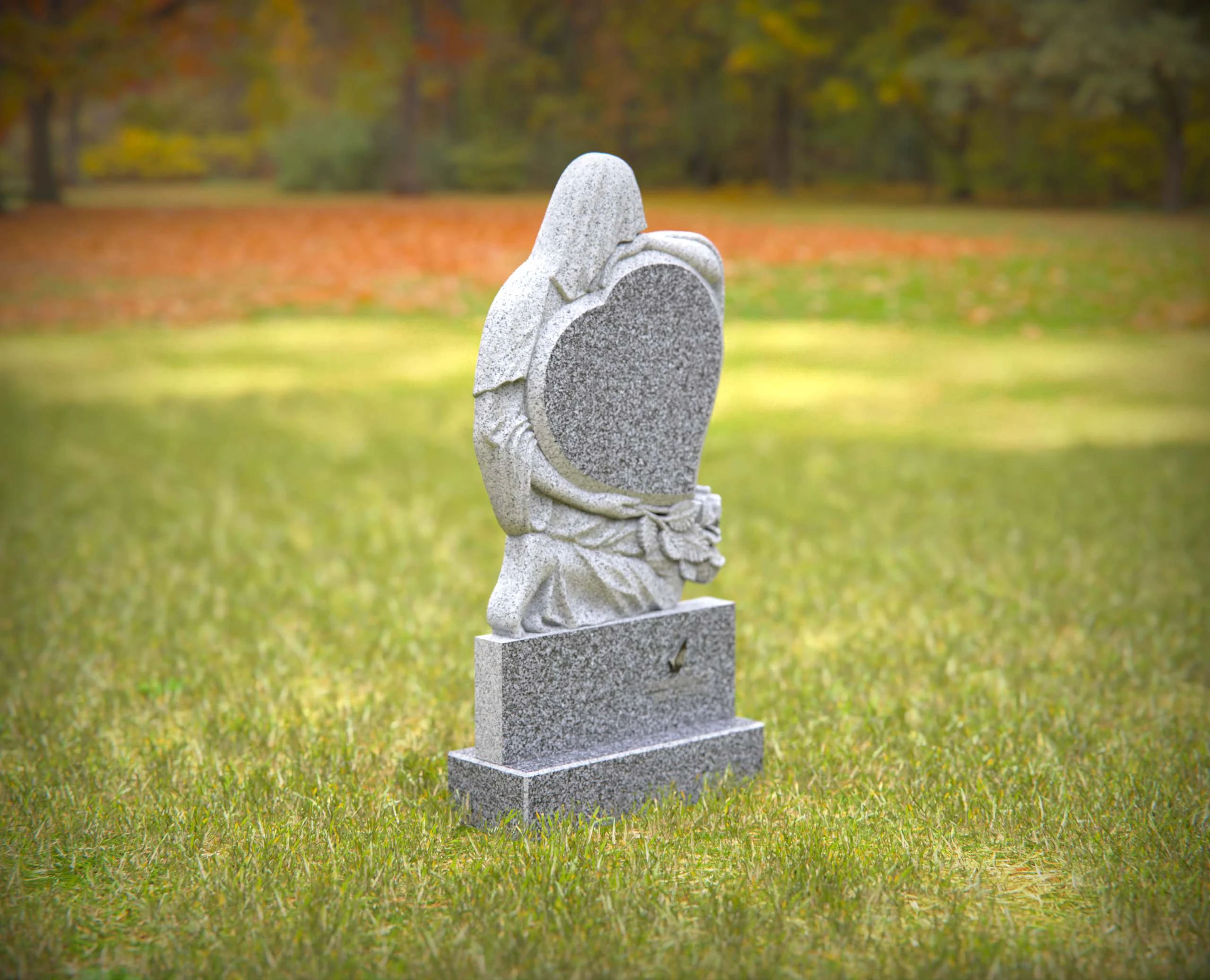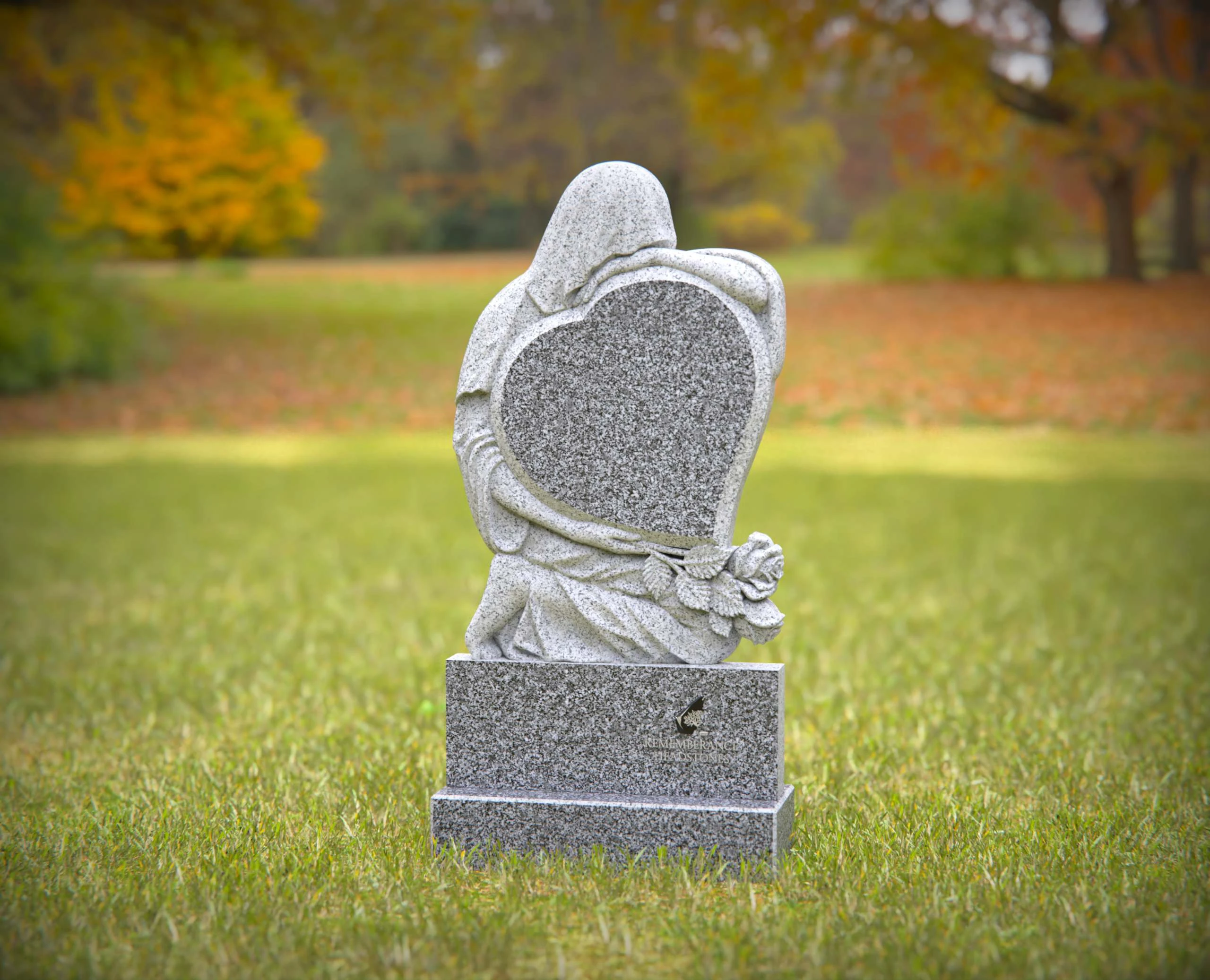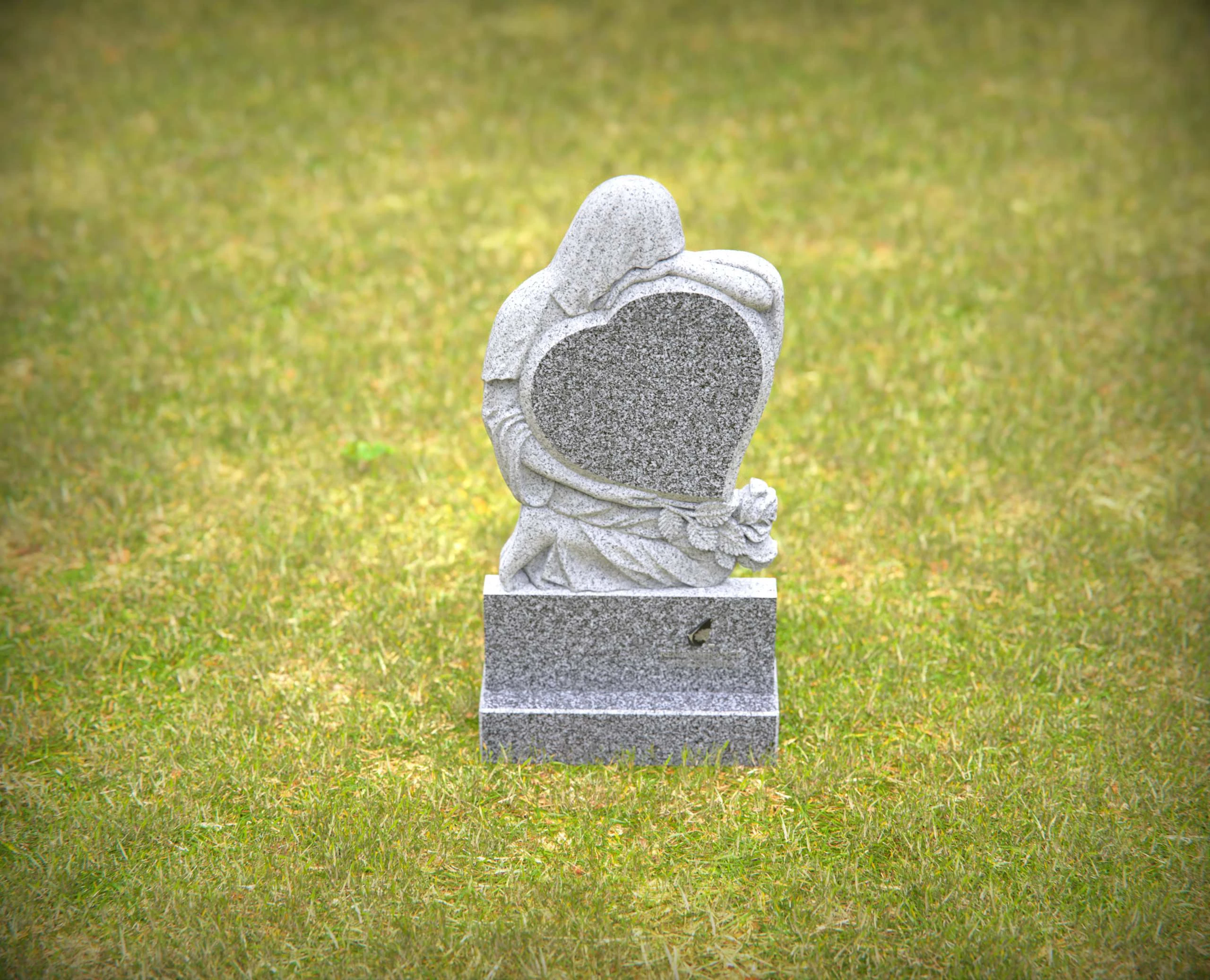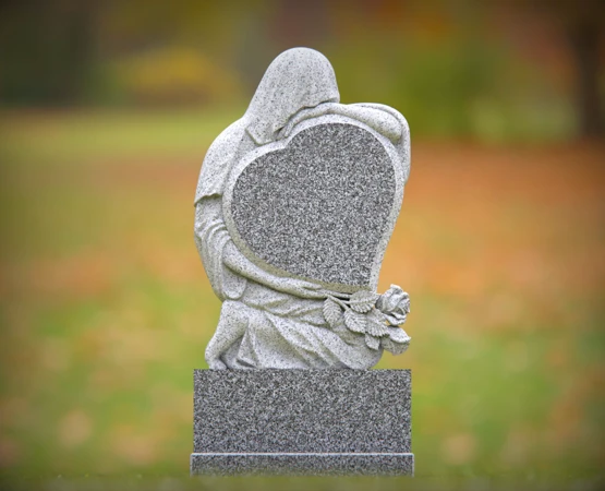 A touching memorial featuring a heart-shaped granite design embraced by a serene angel sculpture. This elegant and durable headstone is a beautiful way to commemorate your loved one’s life. Custom engraving options available to personalize the tribute.