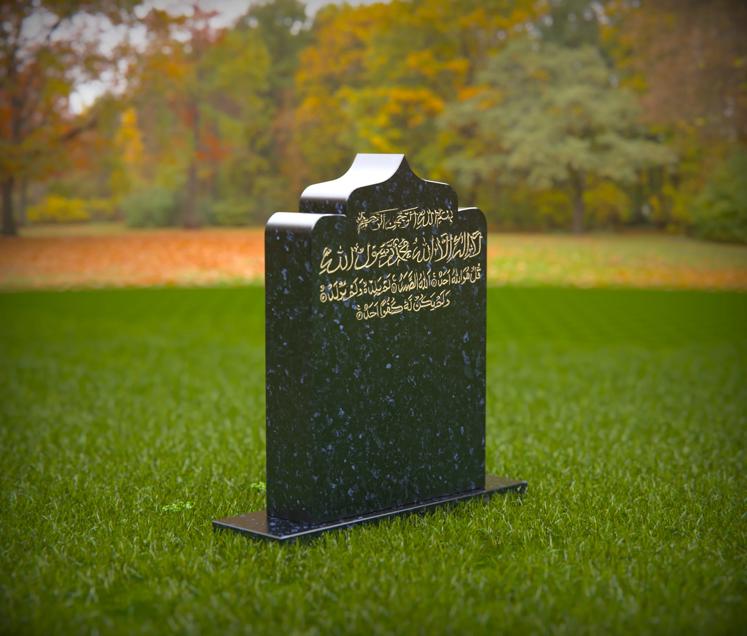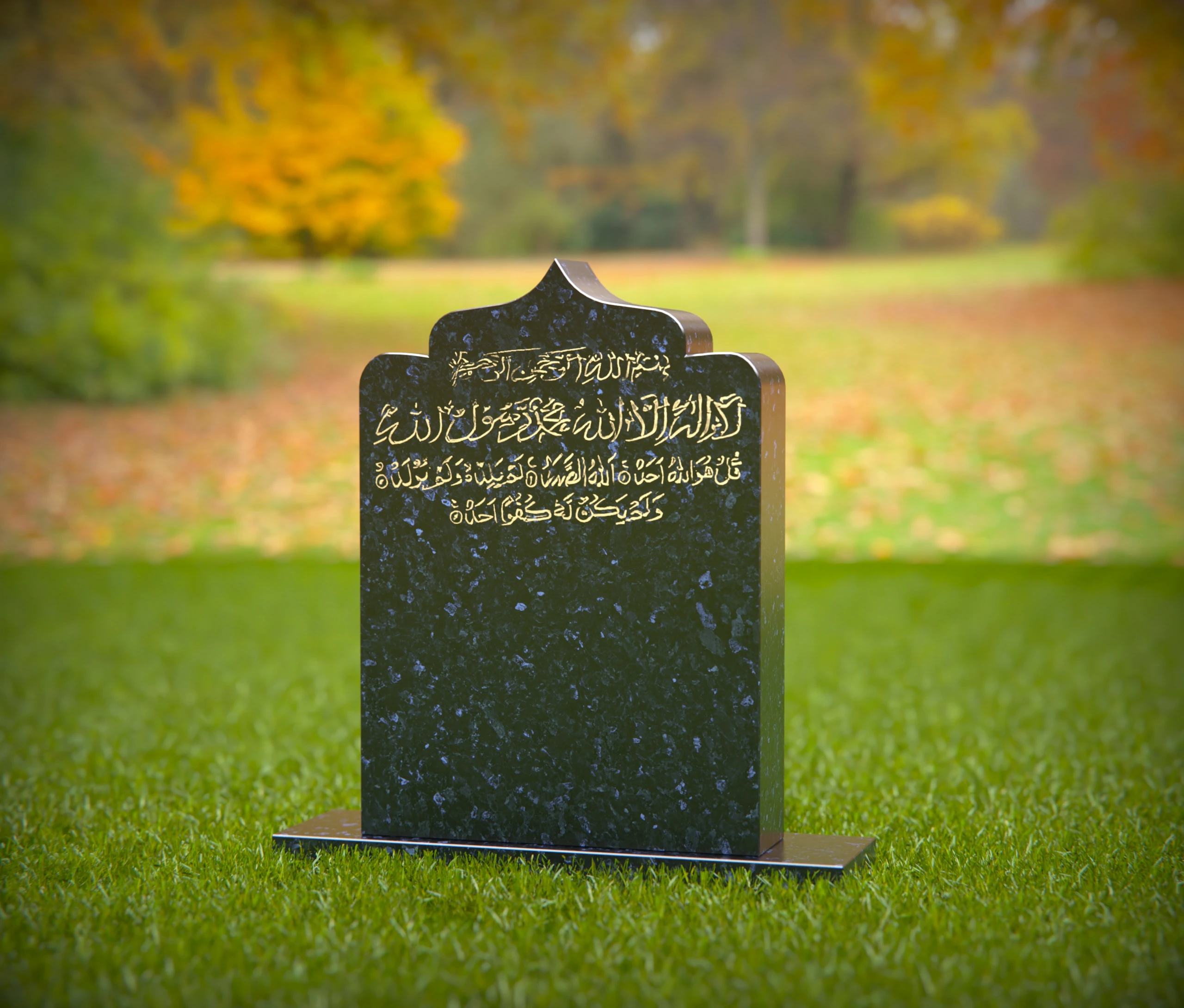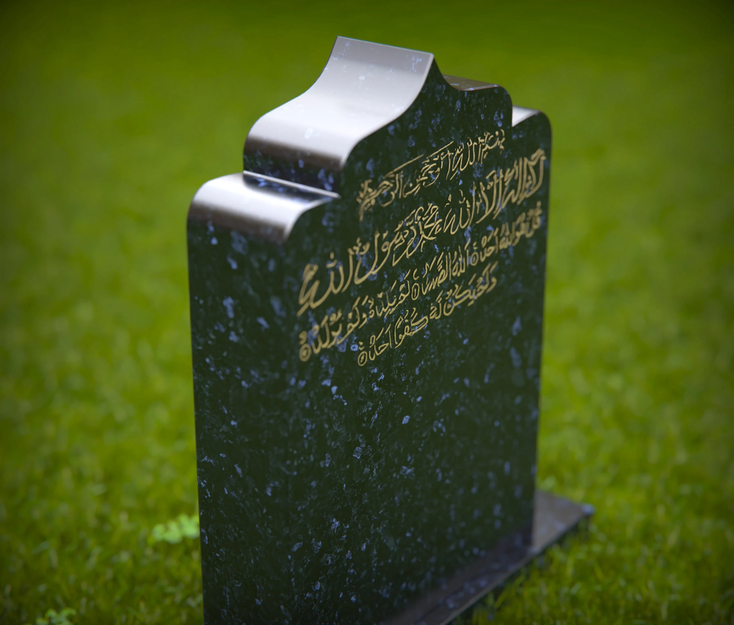 A beautifully designed Islamic gravestone featuring intricate Arabic calligraphy, symbolizing faith, devotion, and remembrance. This dignified memorial stands in a peaceful cemetery, offering a respectful tribute to the departed. The natural surroundings enhance the solemn and spiritual ambiance of the resting place.