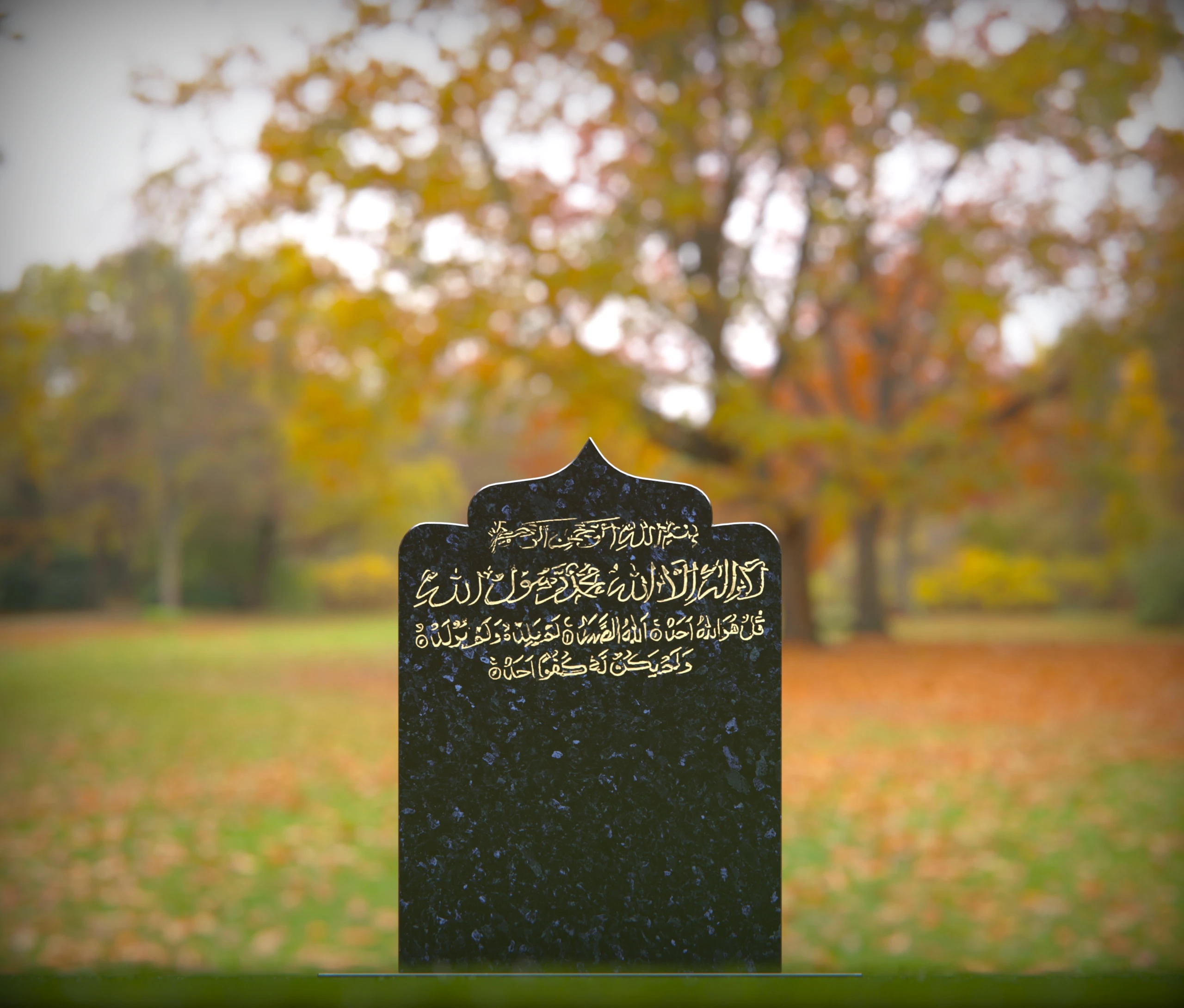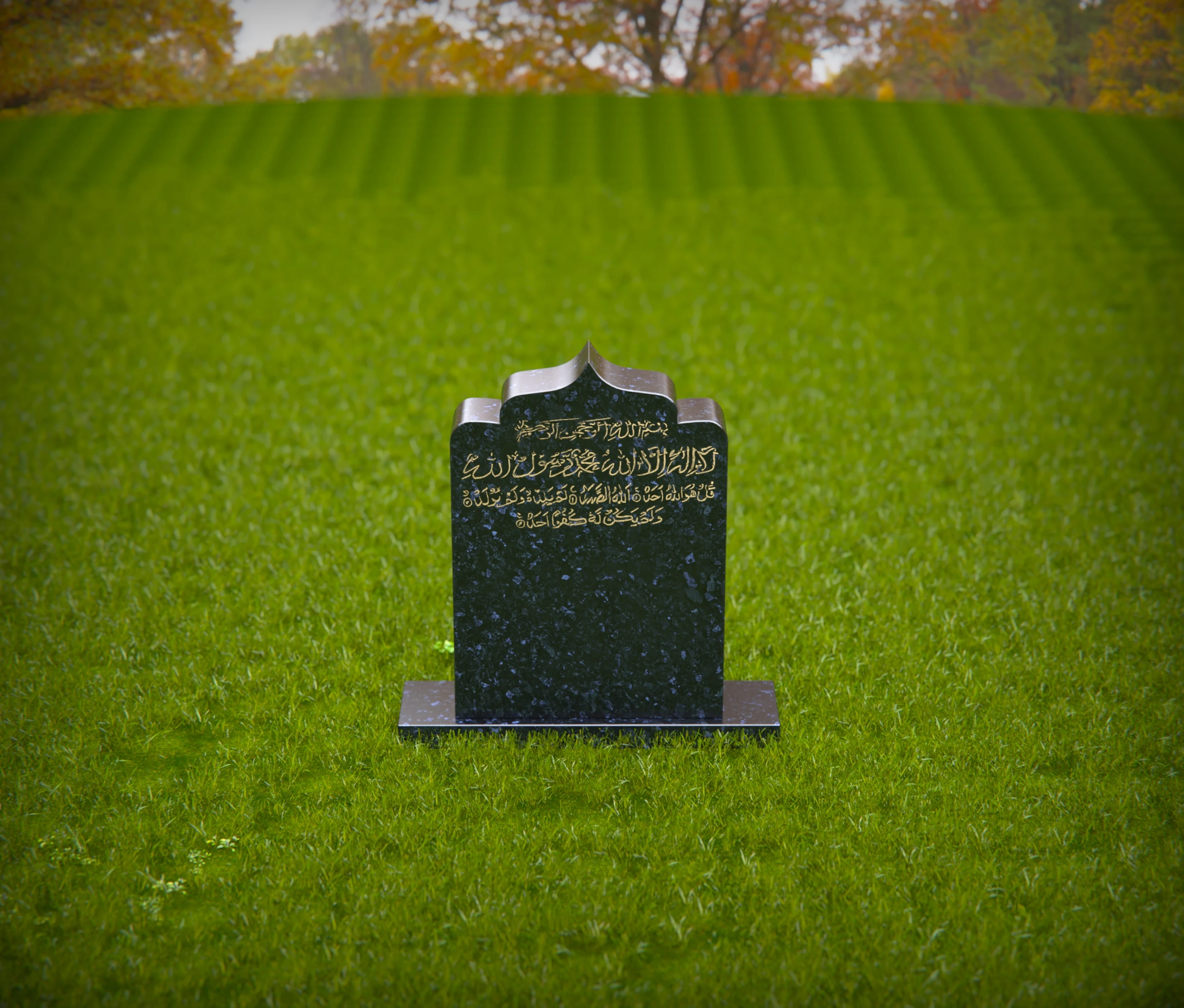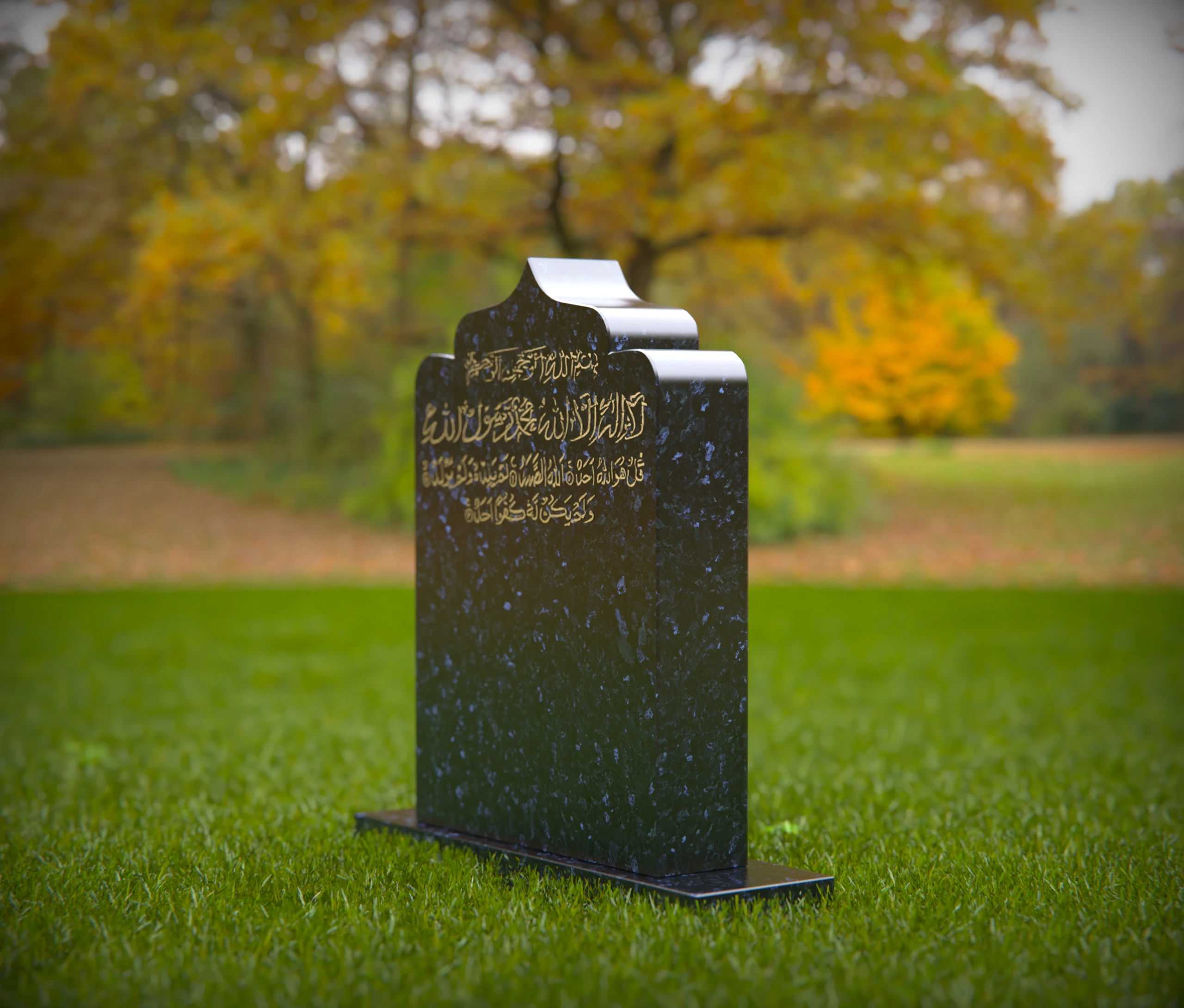 A beautifully designed Islamic gravestone featuring intricate Arabic calligraphy, symbolizing faith, devotion, and remembrance. This dignified memorial stands in a peaceful cemetery, offering a respectful tribute to the departed. The natural surroundings enhance the solemn and spiritual ambiance of the resting place.