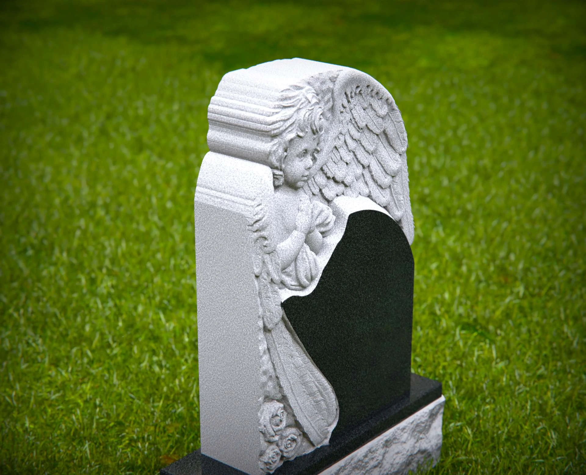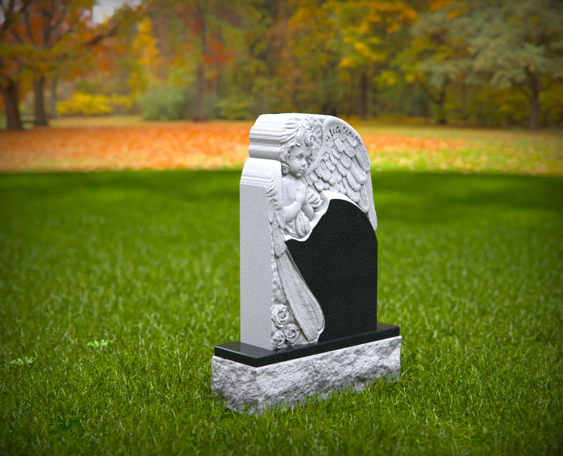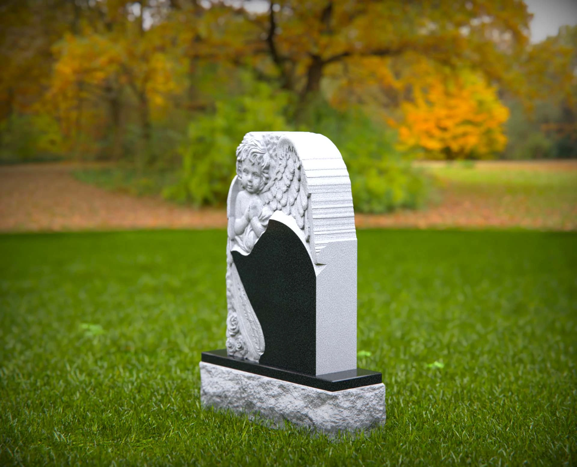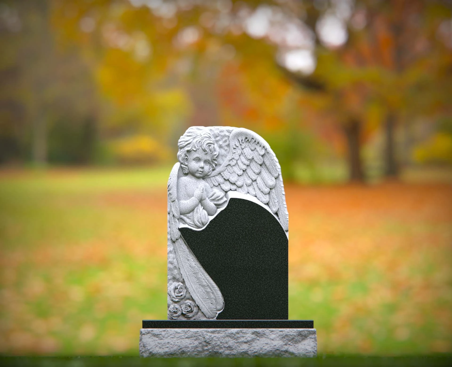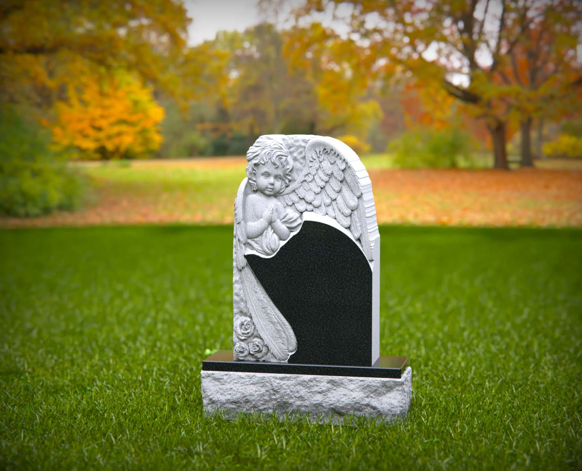 A beautifully crafted children’s memorial headstone featuring a peaceful angel with detailed wings embracing a heart-shaped plaque. This touching gravestone symbolizes love, protection, and remembrance, providing a heartfelt tribute to a cherished child. Set in a serene cemetery, the tranquil background enhances the atmosphere of reflection and honor.