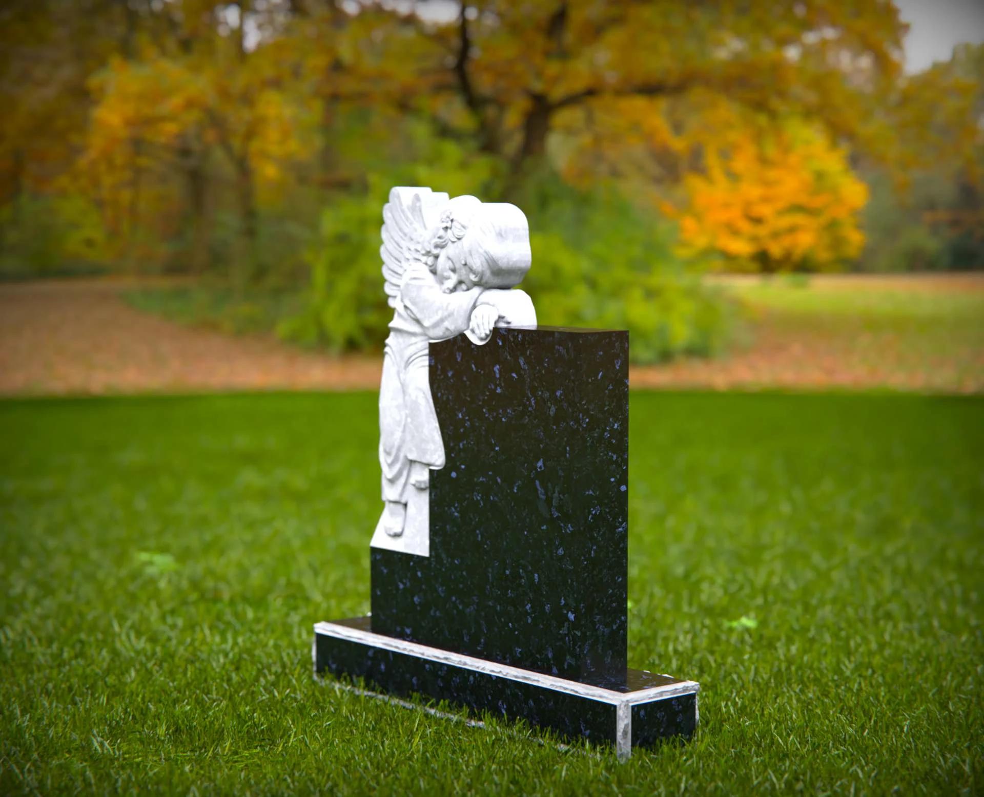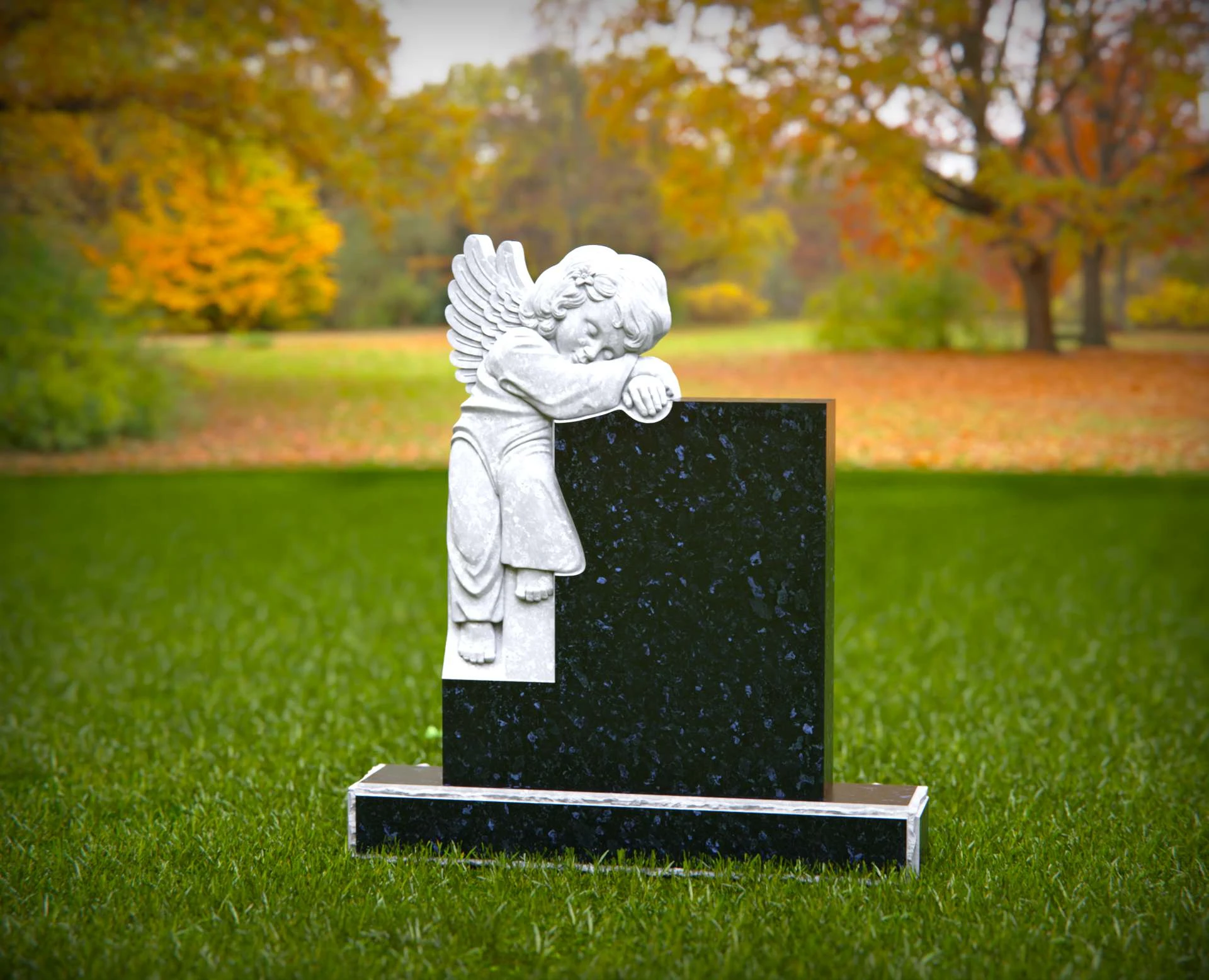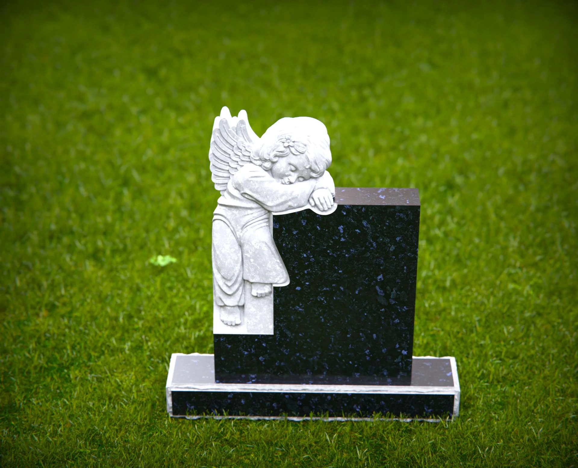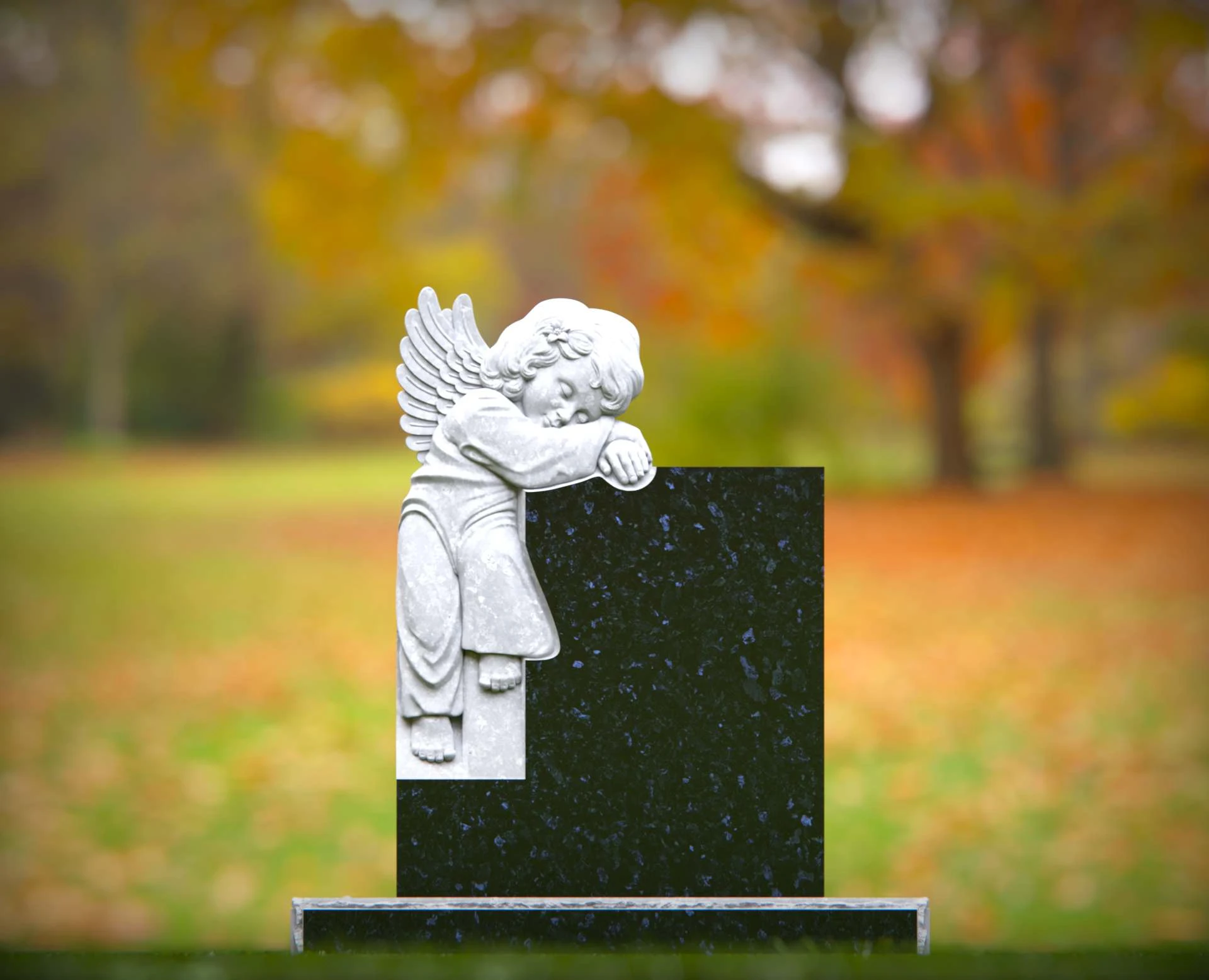 A beautifully crafted children’s memorial headstone featuring a peaceful sleeping angel resting on the plaque, symbolizing love, protection, and eternal peace. This touching gravestone provides a heartfelt tribute to a cherished child, set in a serene cemetery with a tranquil natural background enhancing the atmosphere of remembrance and reflection.
