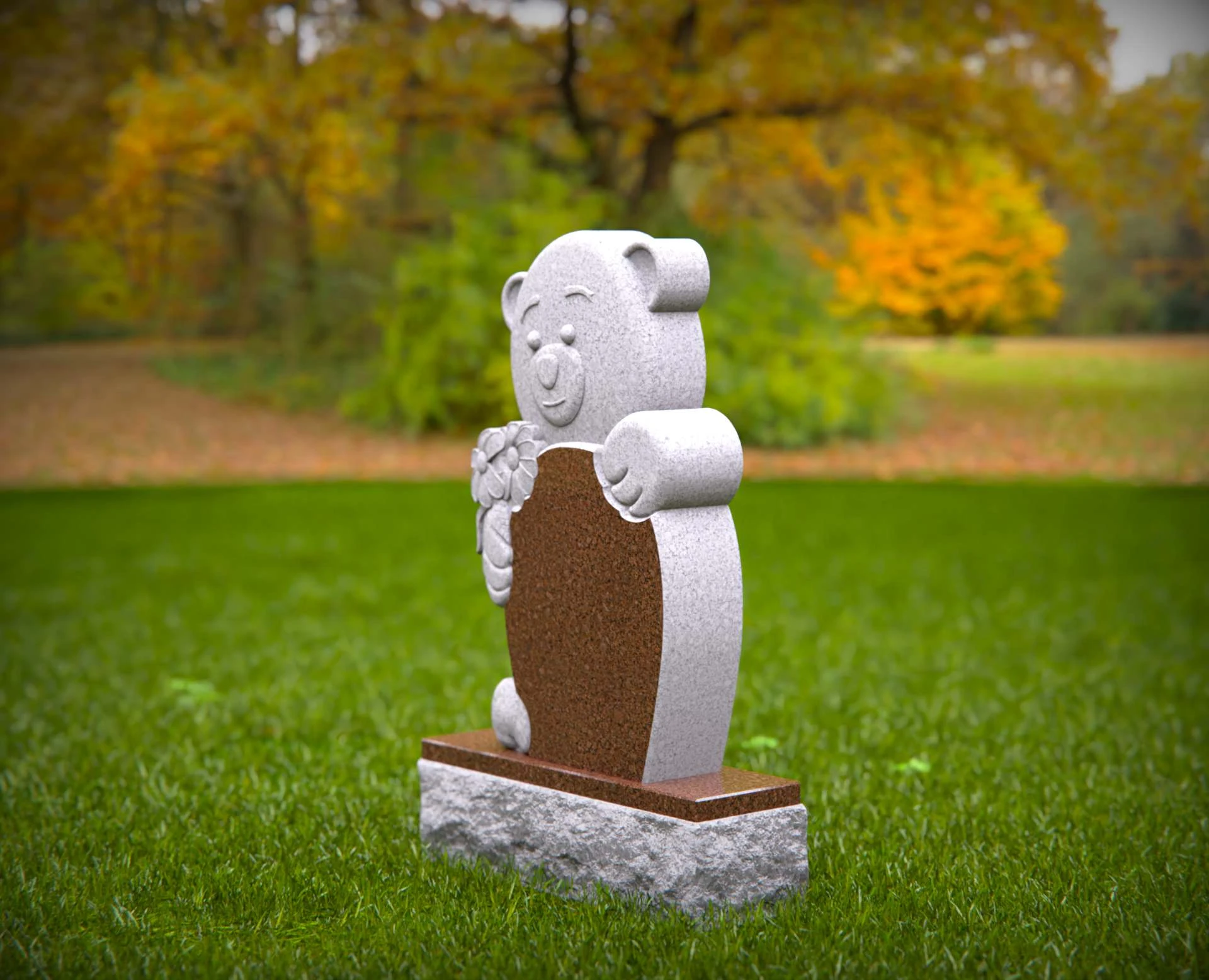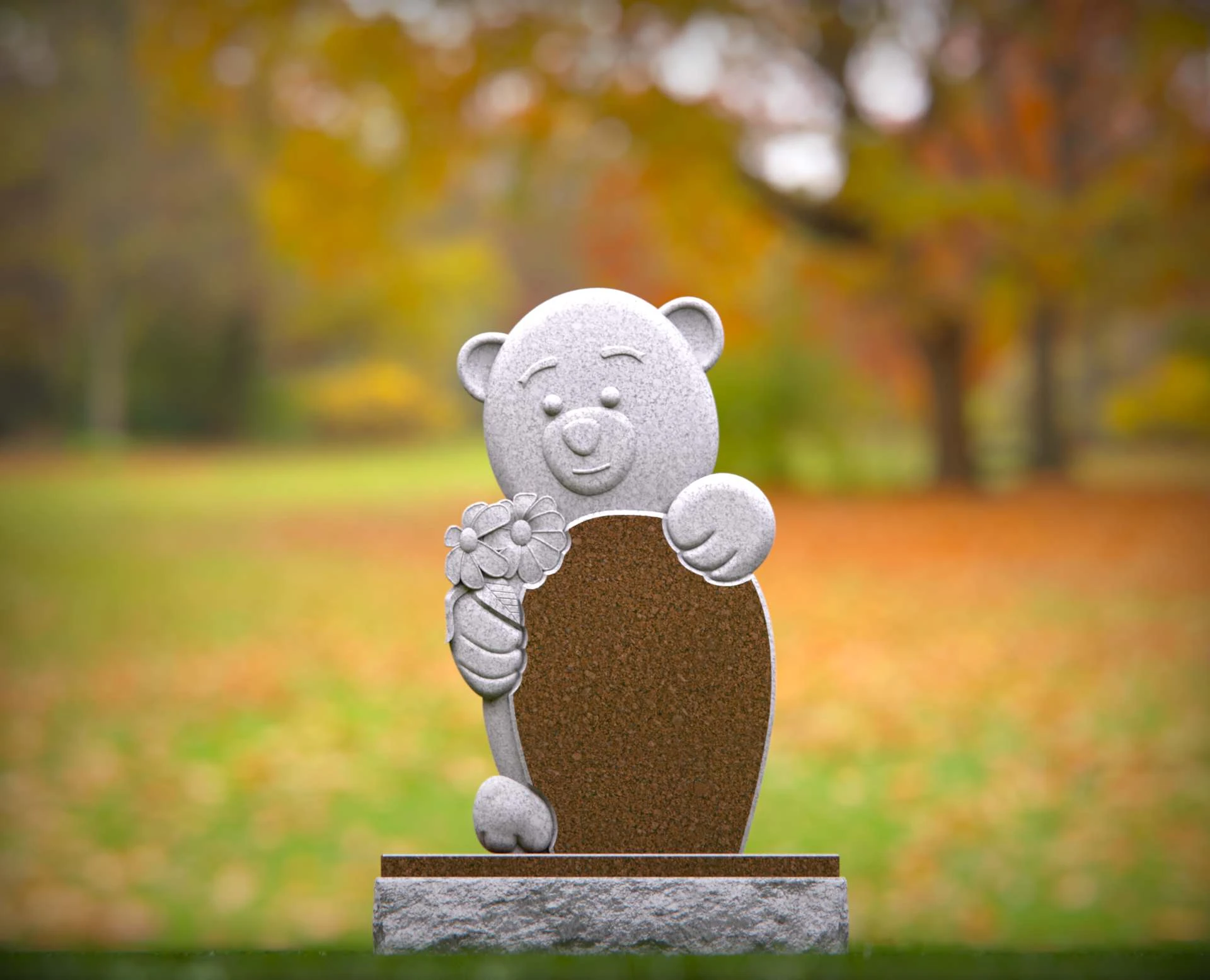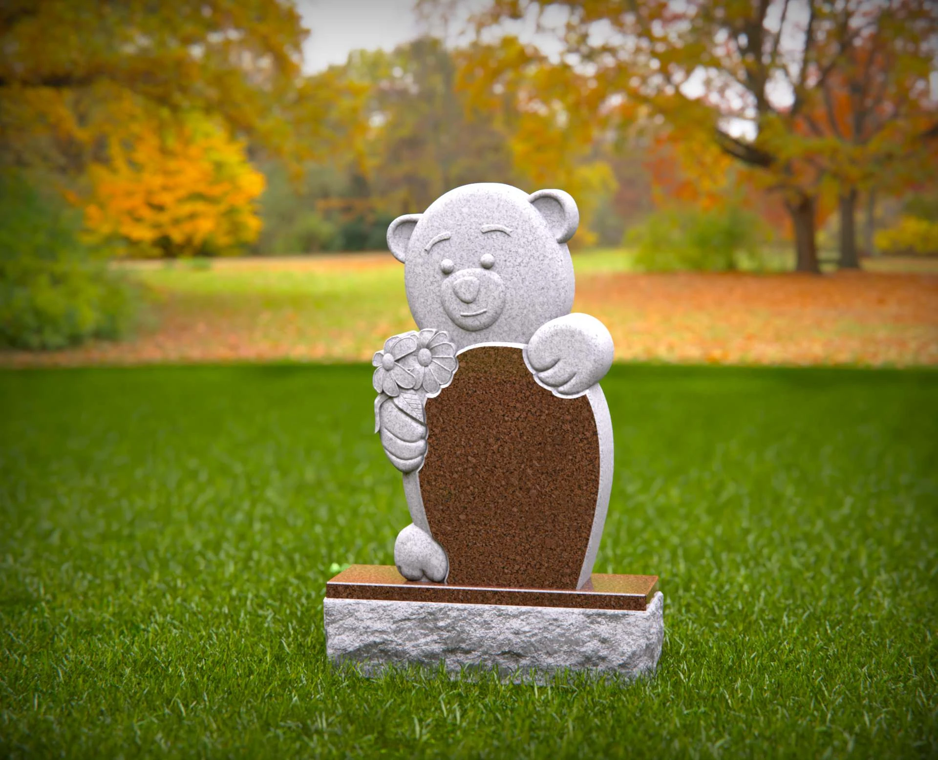 A heartwarming teddy bear memorial headstone featuring a carved teddy bear holding flowers. This beautifully designed headstone is perfect for honoring the memory of a beloved child or a cherished loved one. Made from durable granite, it offers a lasting tribute filled with warmth and love.