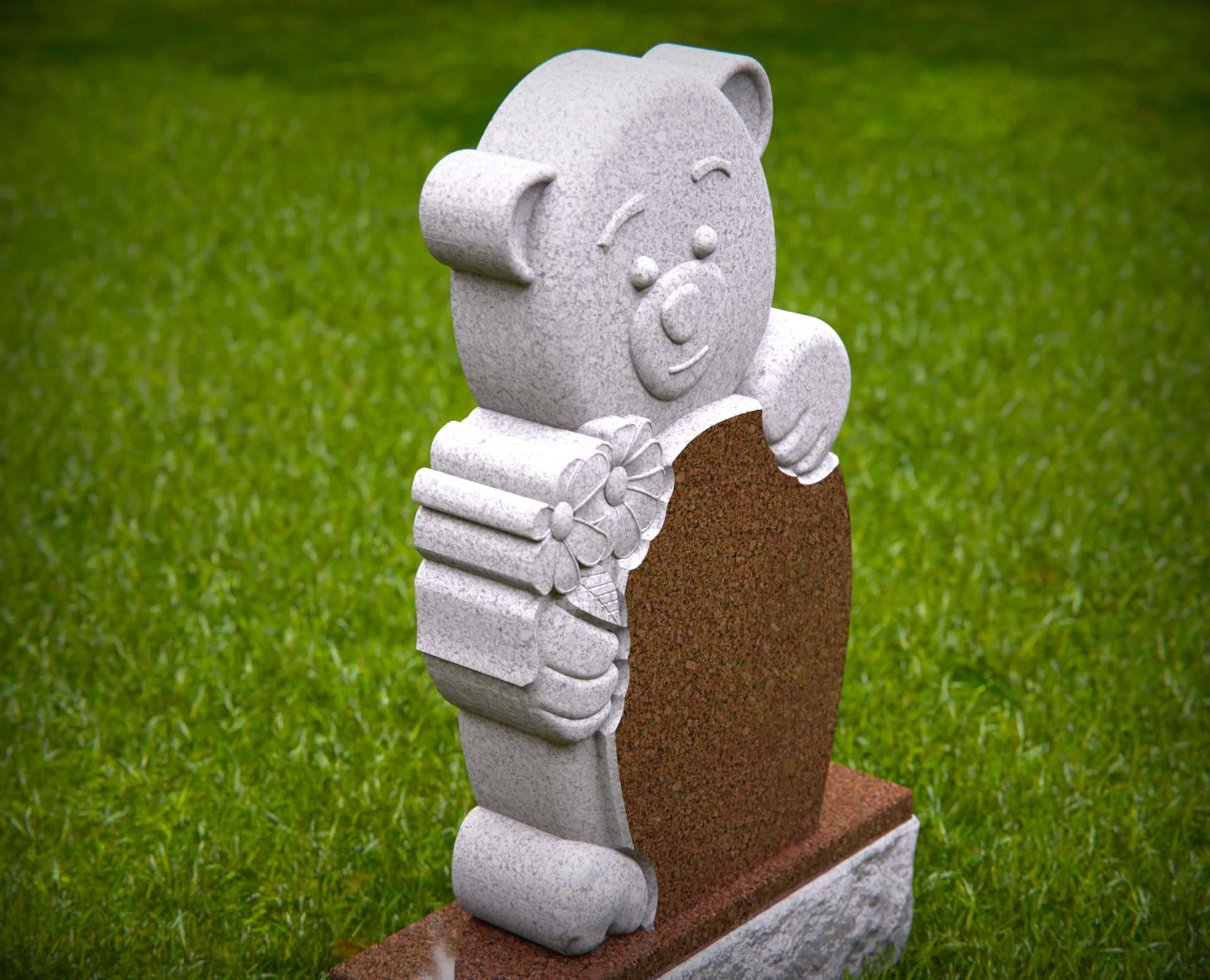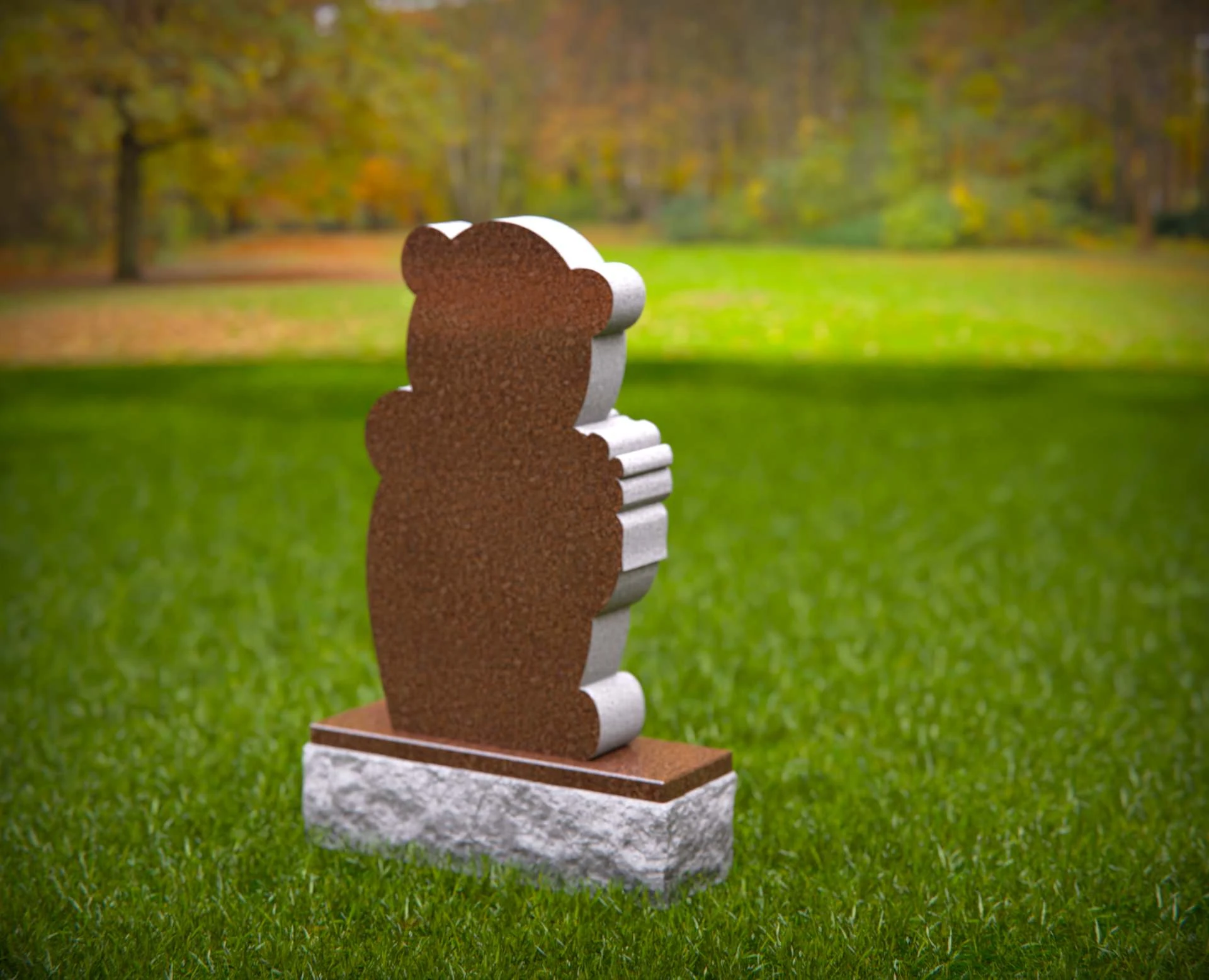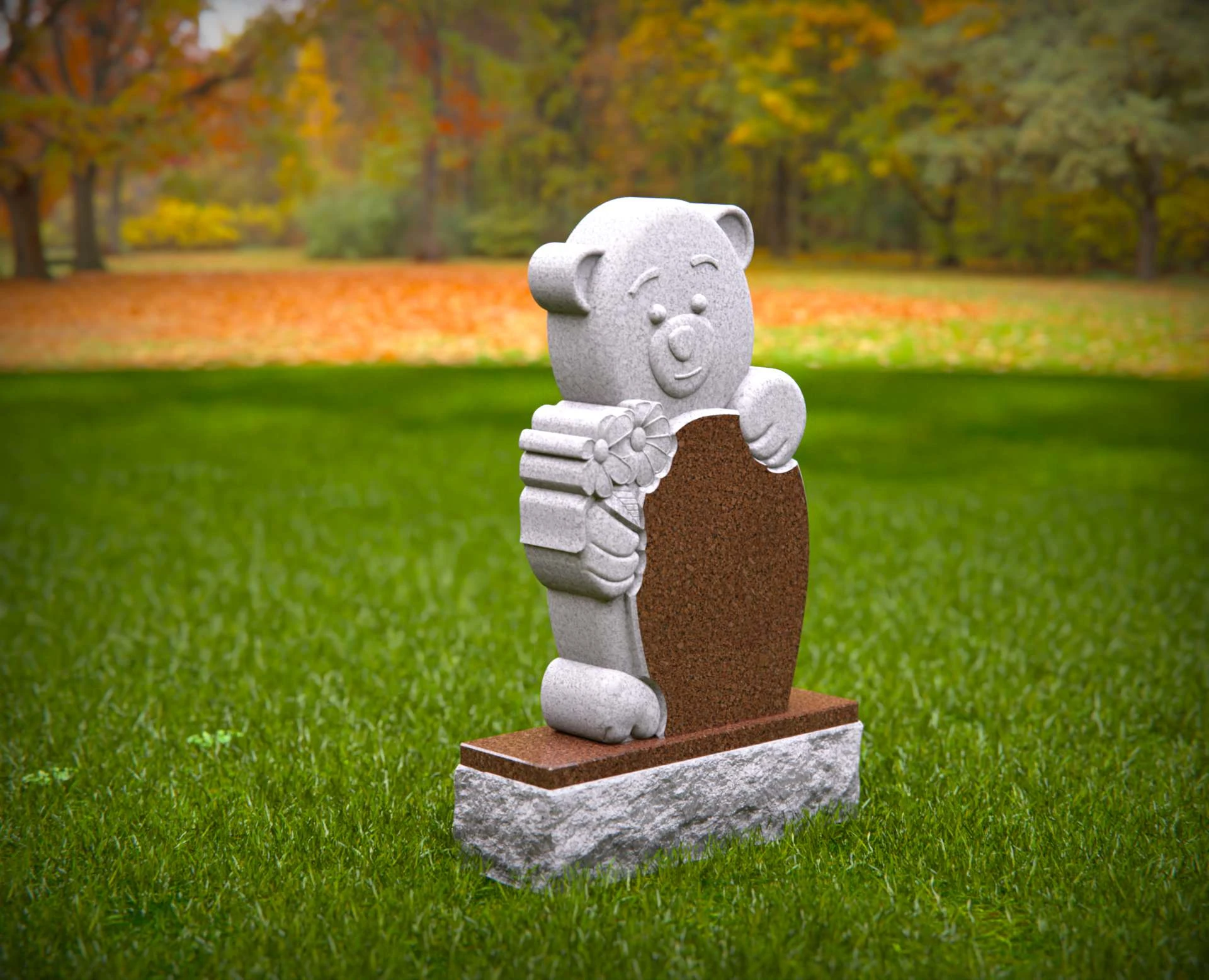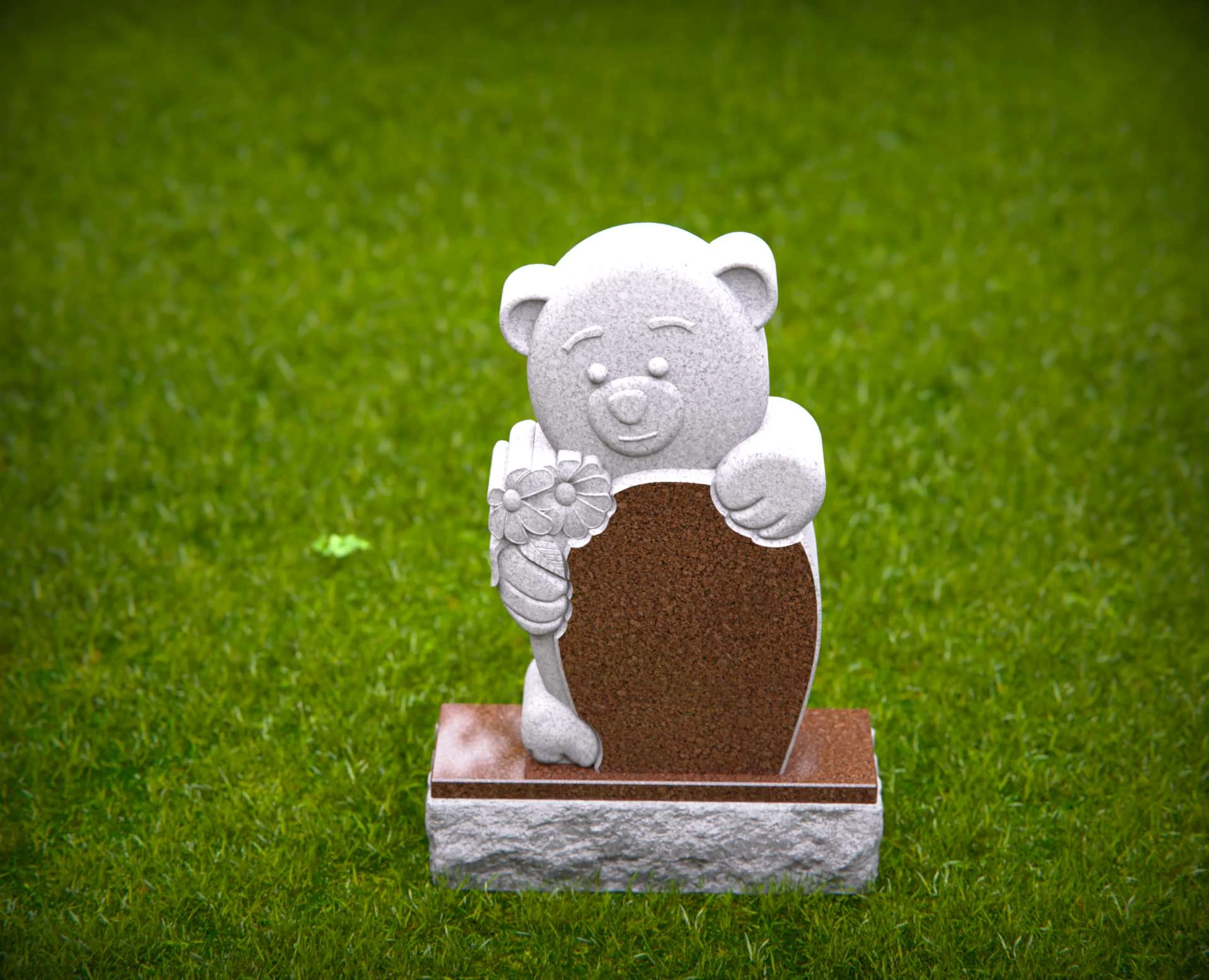 A heartwarming teddy bear memorial headstone featuring a carved teddy bear holding flowers. This beautifully designed headstone is perfect for honoring the memory of a beloved child or a cherished loved one. Made from durable granite, it offers a lasting tribute filled with warmth and love.