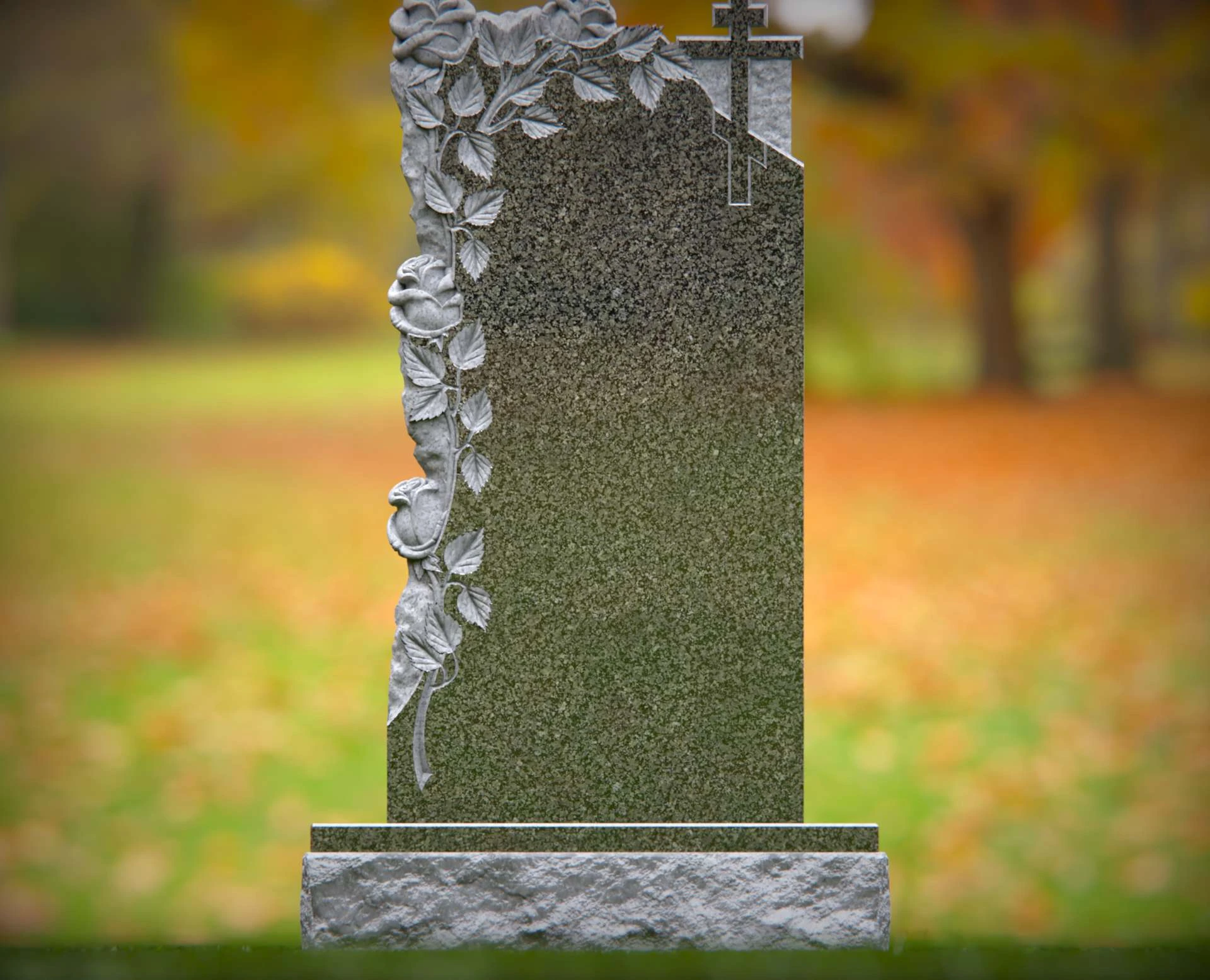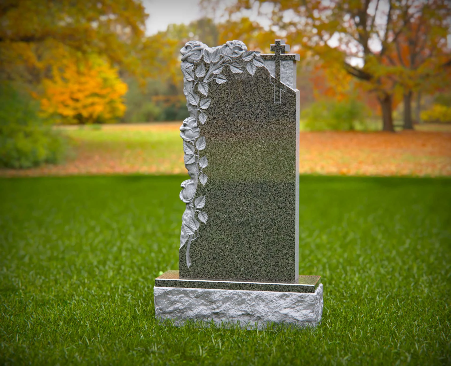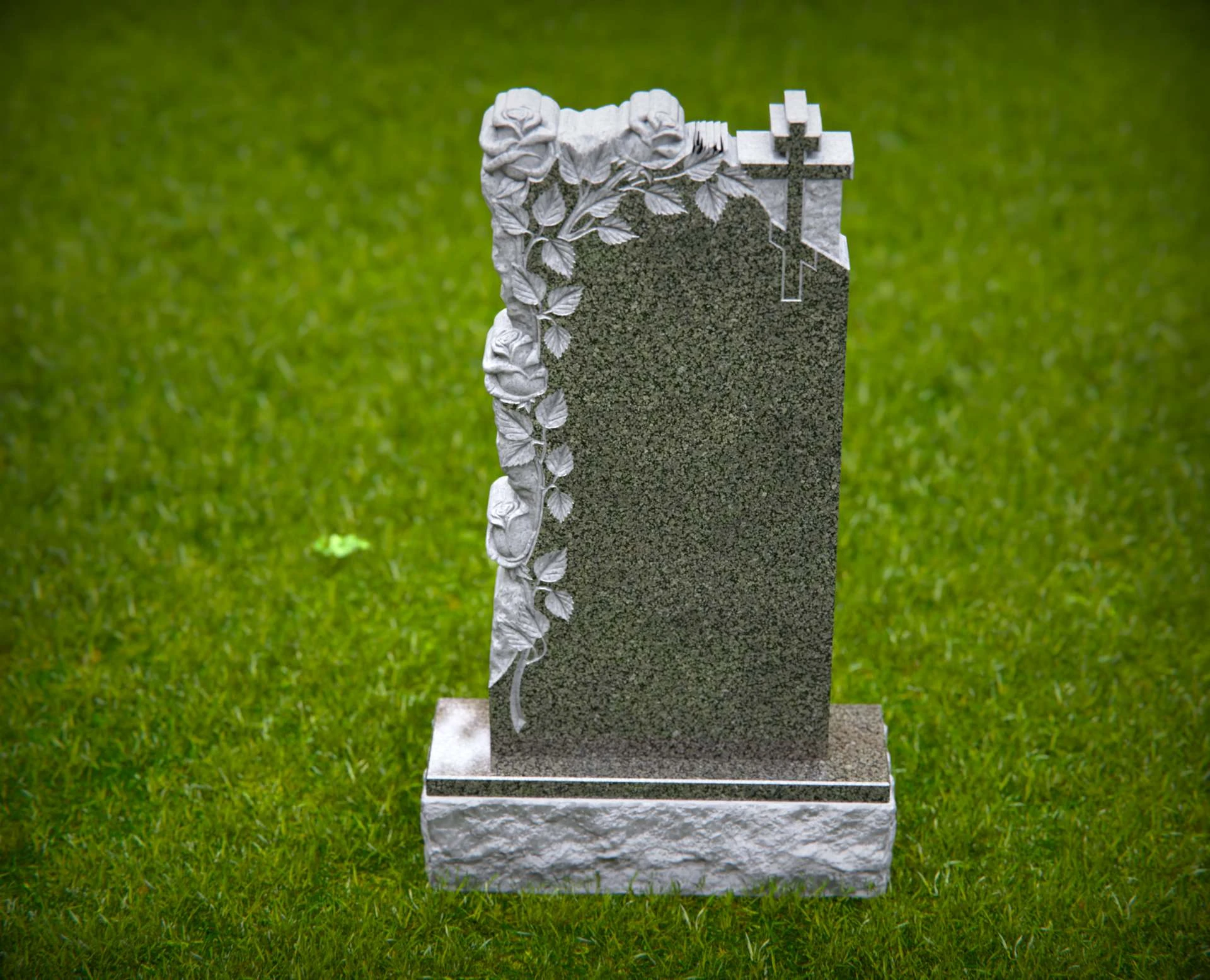 This beautifully crafted granite headstone features an intricate floral design with cascading roses and a delicate cross, symbolizing faith, love, and remembrance. The polished surface provides space for a meaningful inscription, ensuring a timeless tribute to a cherished life. Built from high-quality stone, this monument is designed for lasting durability and grace.