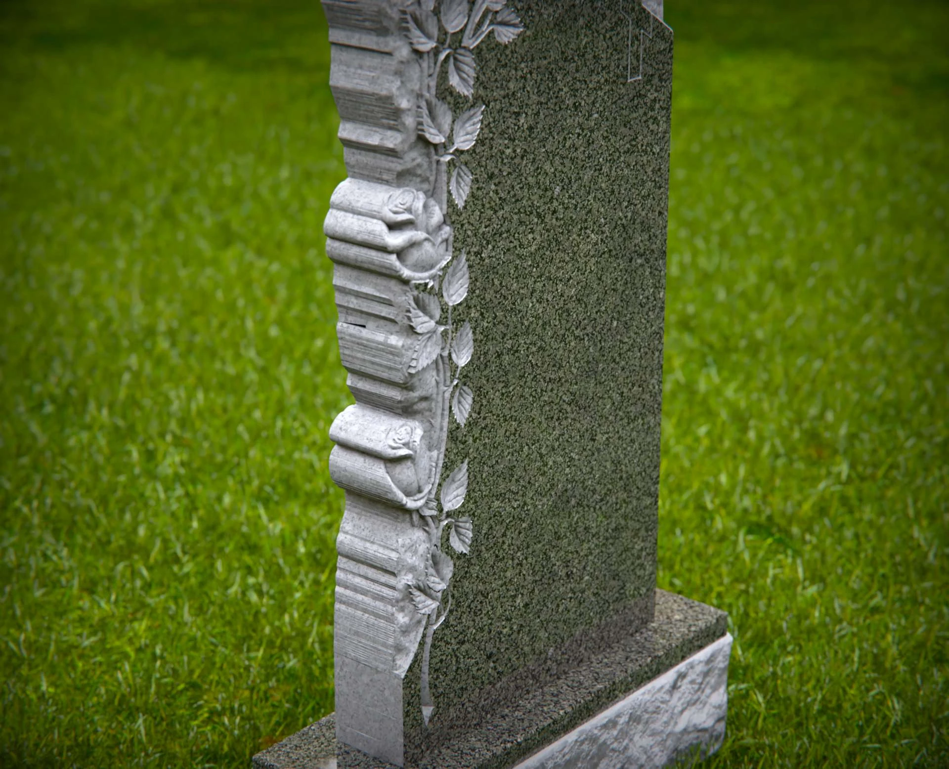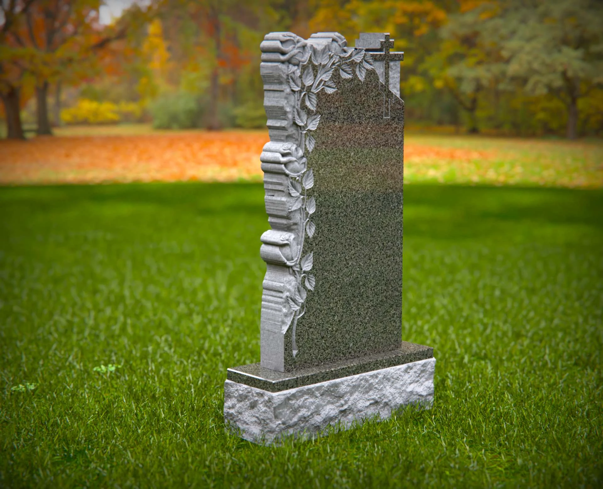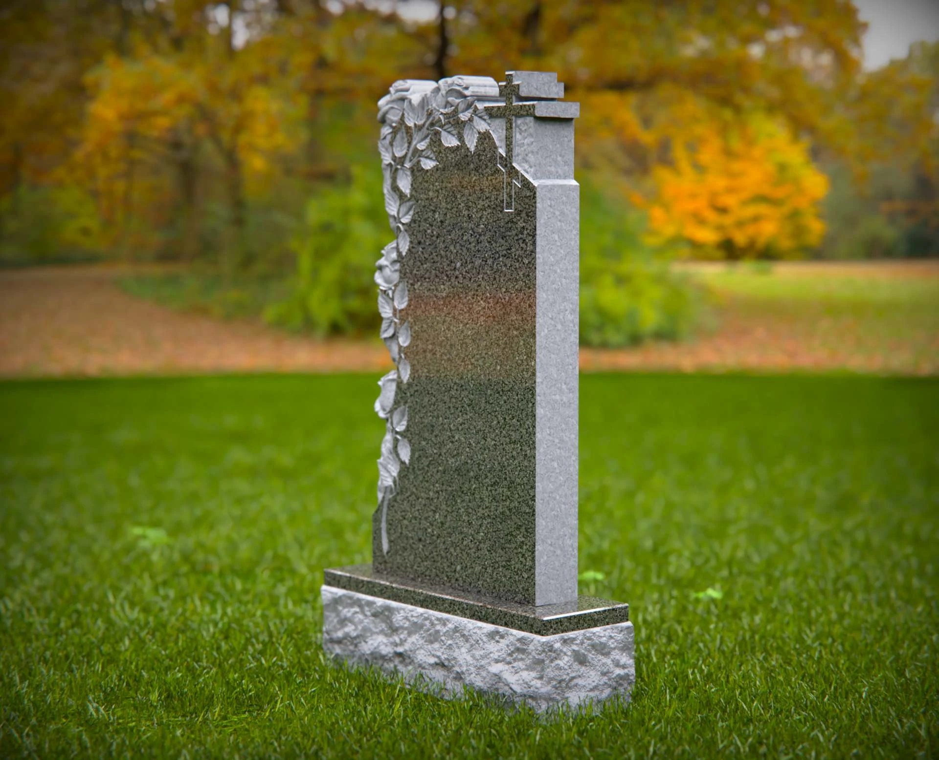 This beautifully crafted granite headstone features an intricate floral design with cascading roses and a delicate cross, symbolizing faith, love, and remembrance. The polished surface provides space for a meaningful inscription, ensuring a timeless tribute to a cherished life. Built from high-quality stone, this monument is designed for lasting durability and grace.