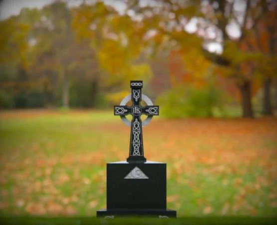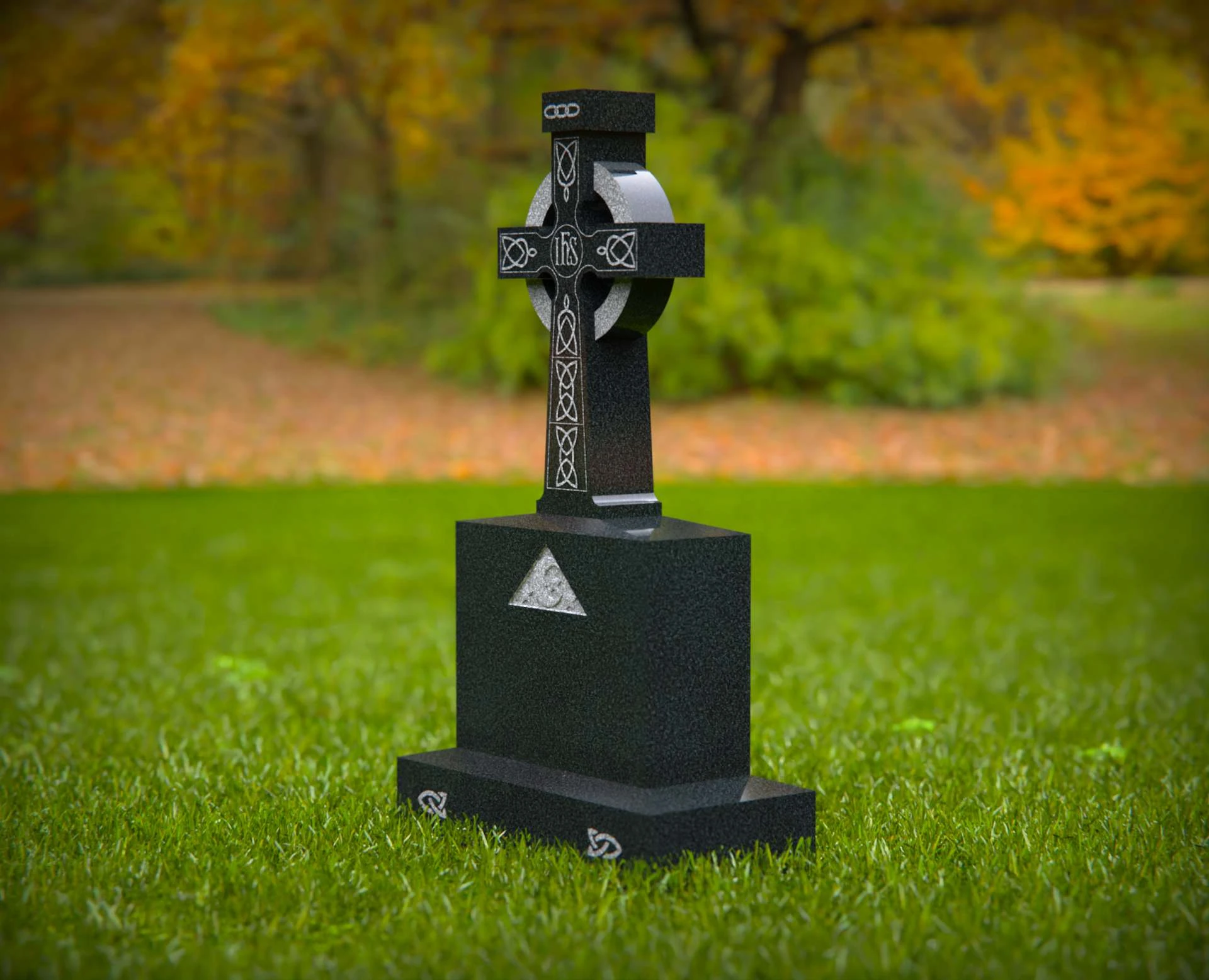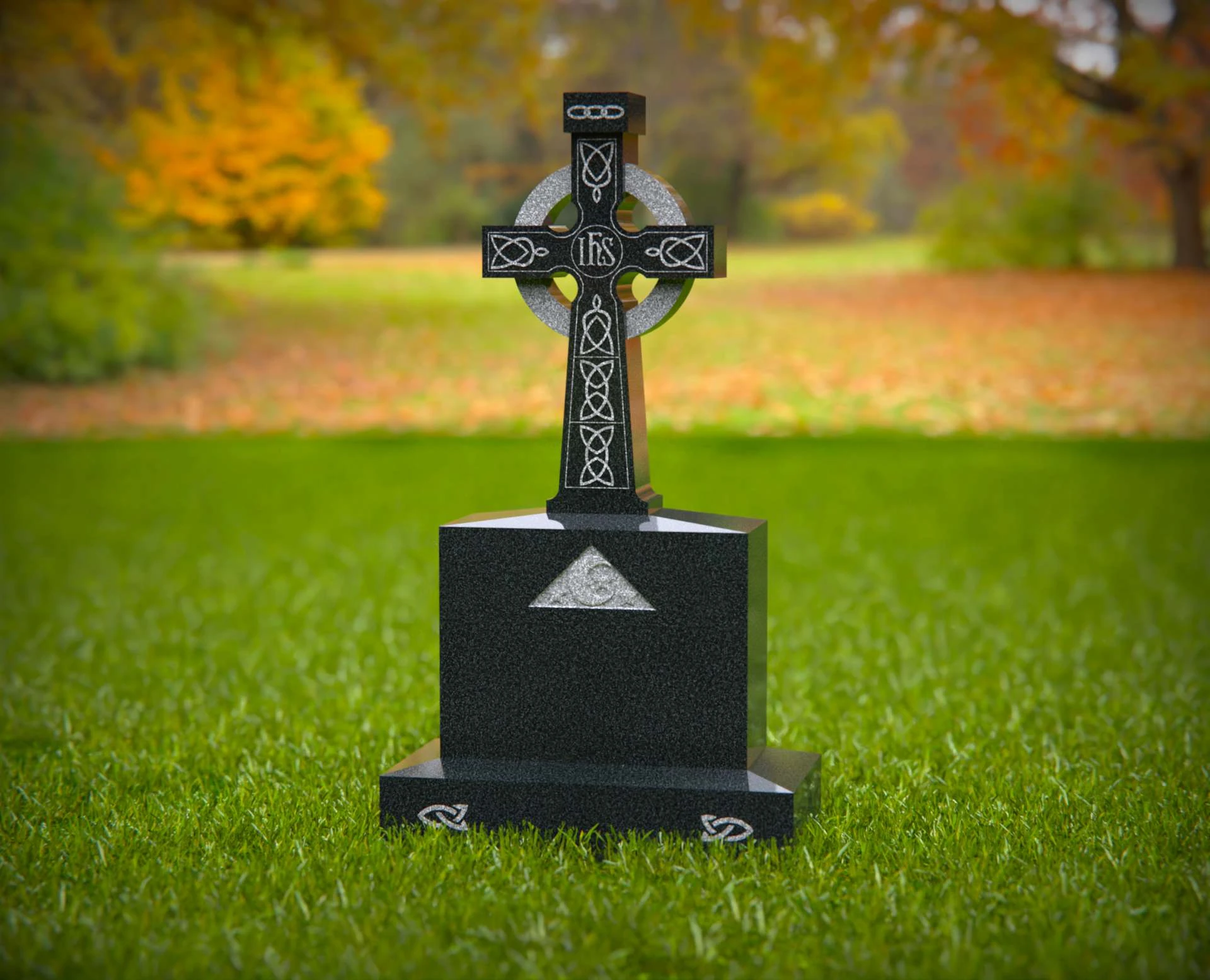 This stunning black granite headstone features a traditional Celtic cross design, adorned with intricate knotwork engravings and symbolic details. The polished surface highlights the beautifully crafted carvings, including the IHS Christogram, symbolizing faith and devotion. The solid granite base provides a dignified and enduring foundation, while additional Celtic symbols on the pedestal enhance its cultural and spiritual significance. This timeless memorial is a perfect tribute for those who cherished their Irish heritage and Christian faith.