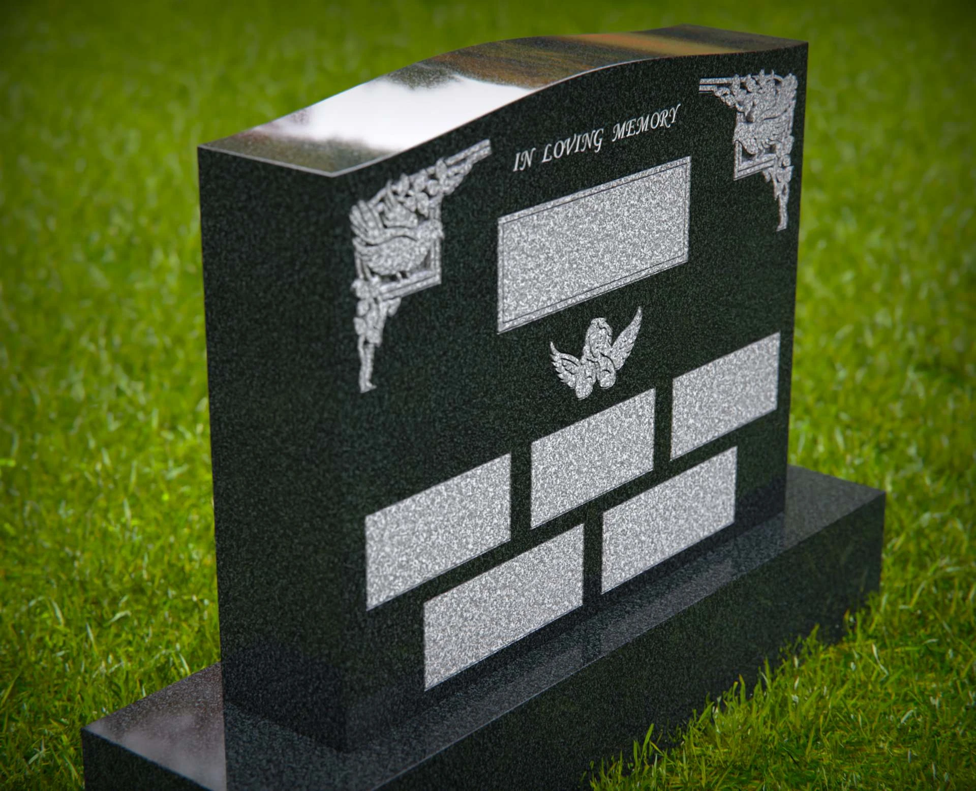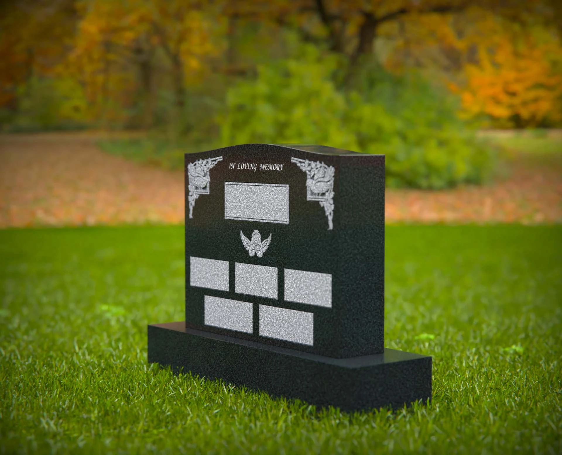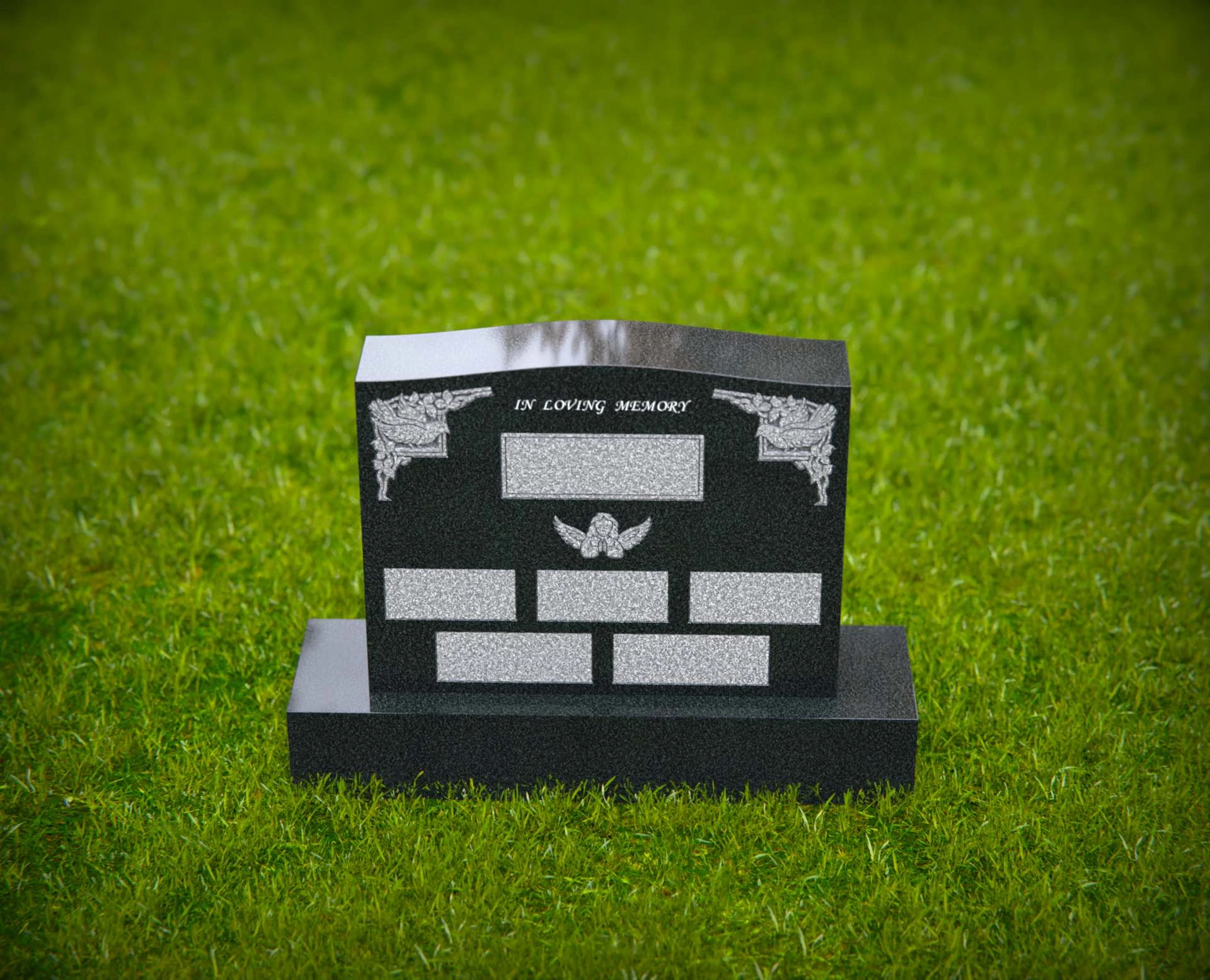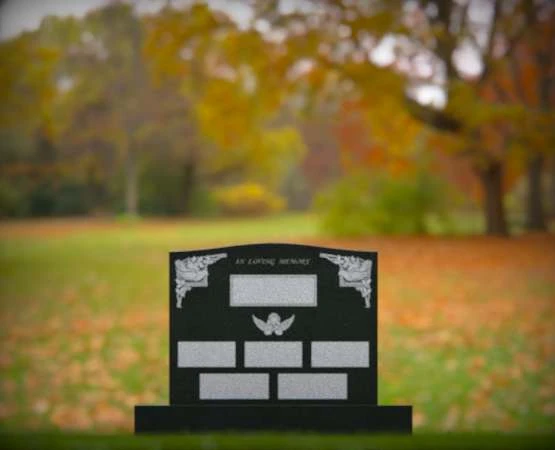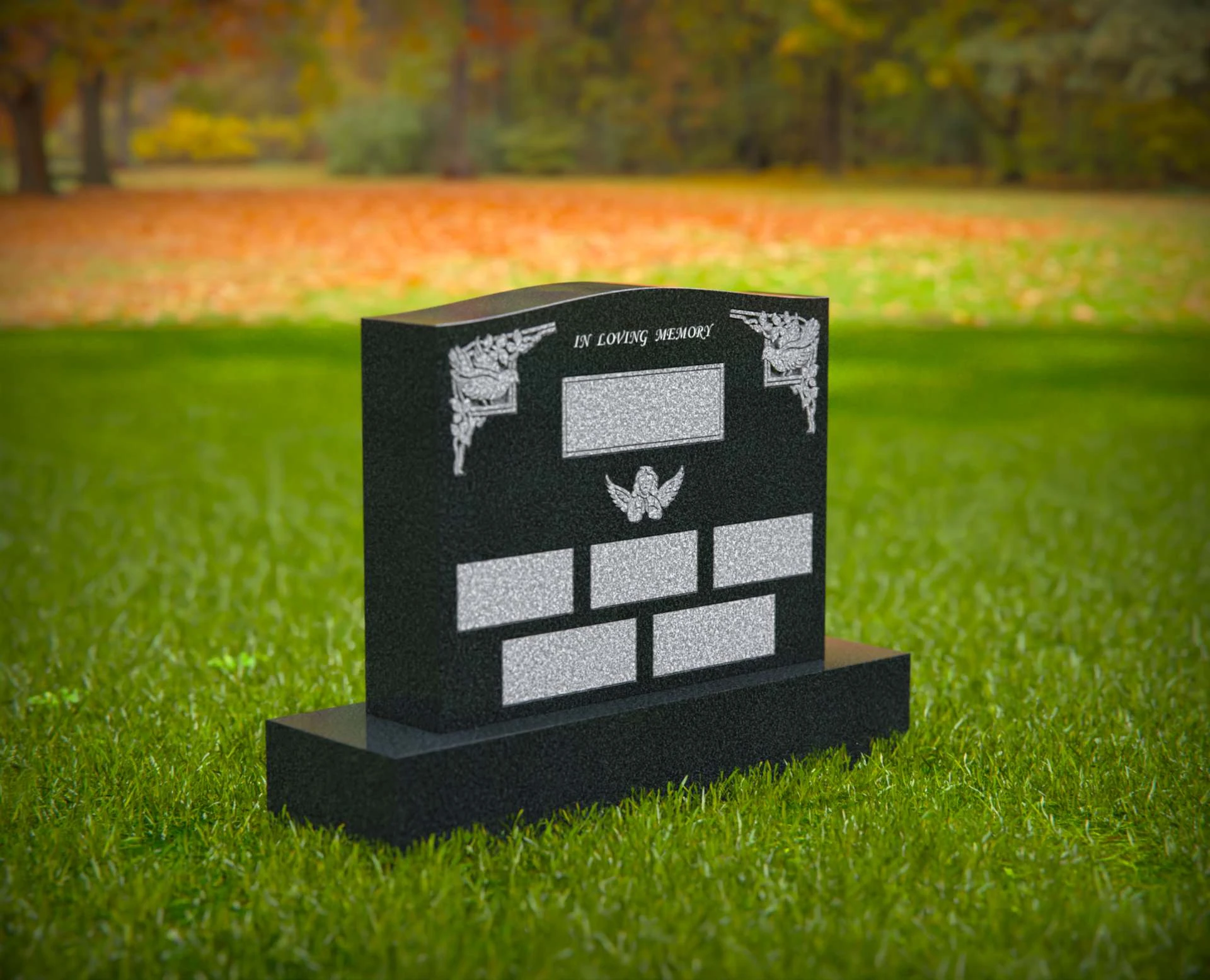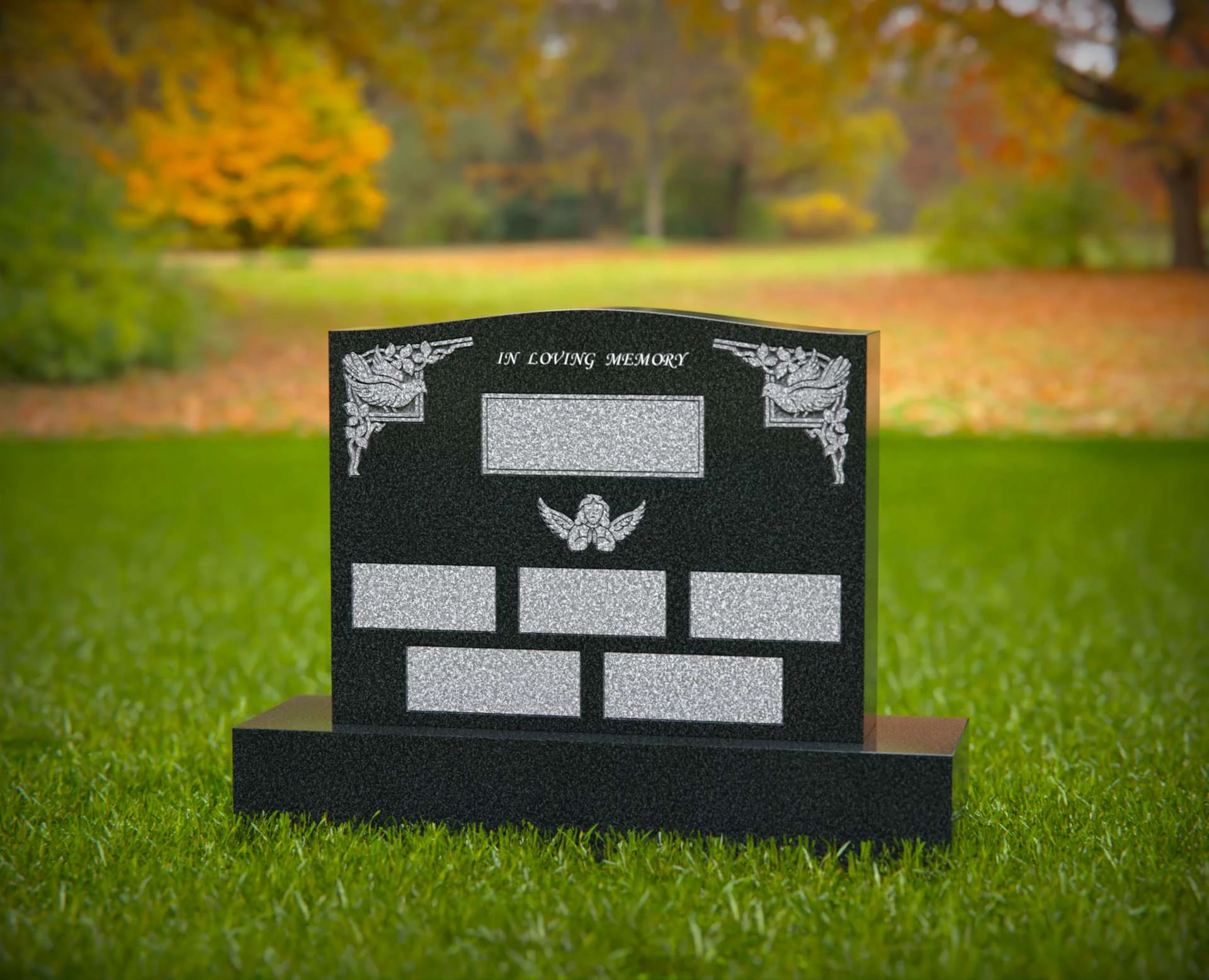 A beautifully designed memorial headstone featuring angelic and floral engravings, along with multiple customizable nameplates. The inscription "In Loving Memory" adds a heartfelt tribute to loved ones. Set in a peaceful cemetery, this gravestone offers a dignified and elegant way to honor those who have passed. Ideal for discussions on personalized gravestone designs and memorial traditions.