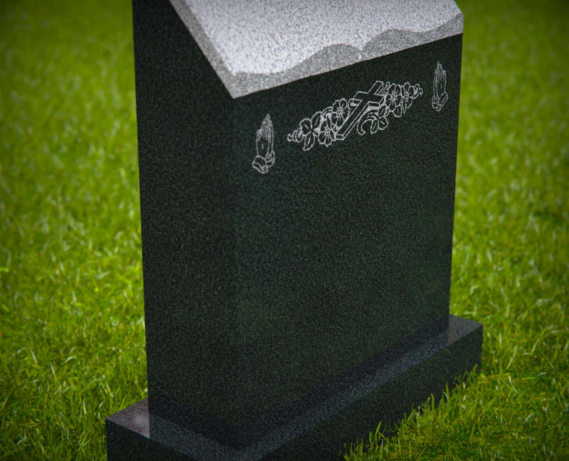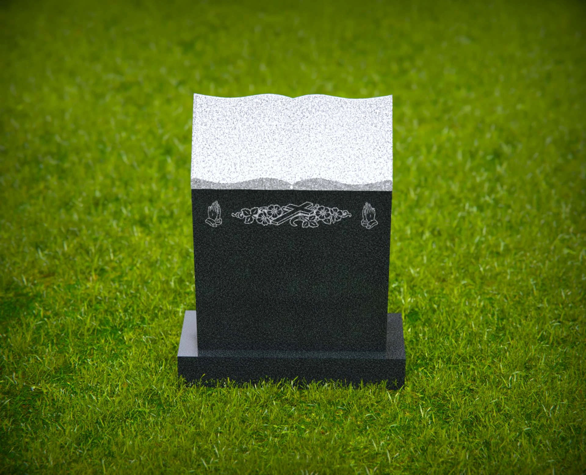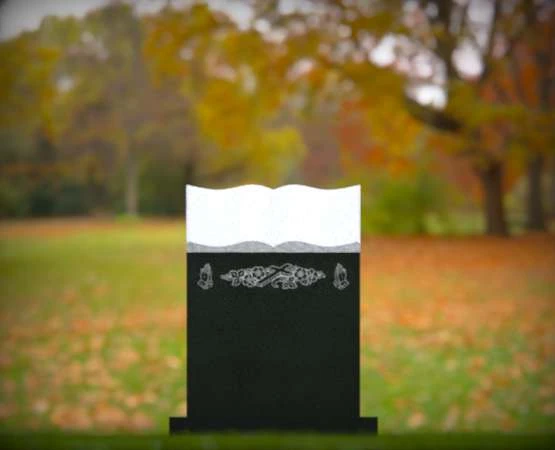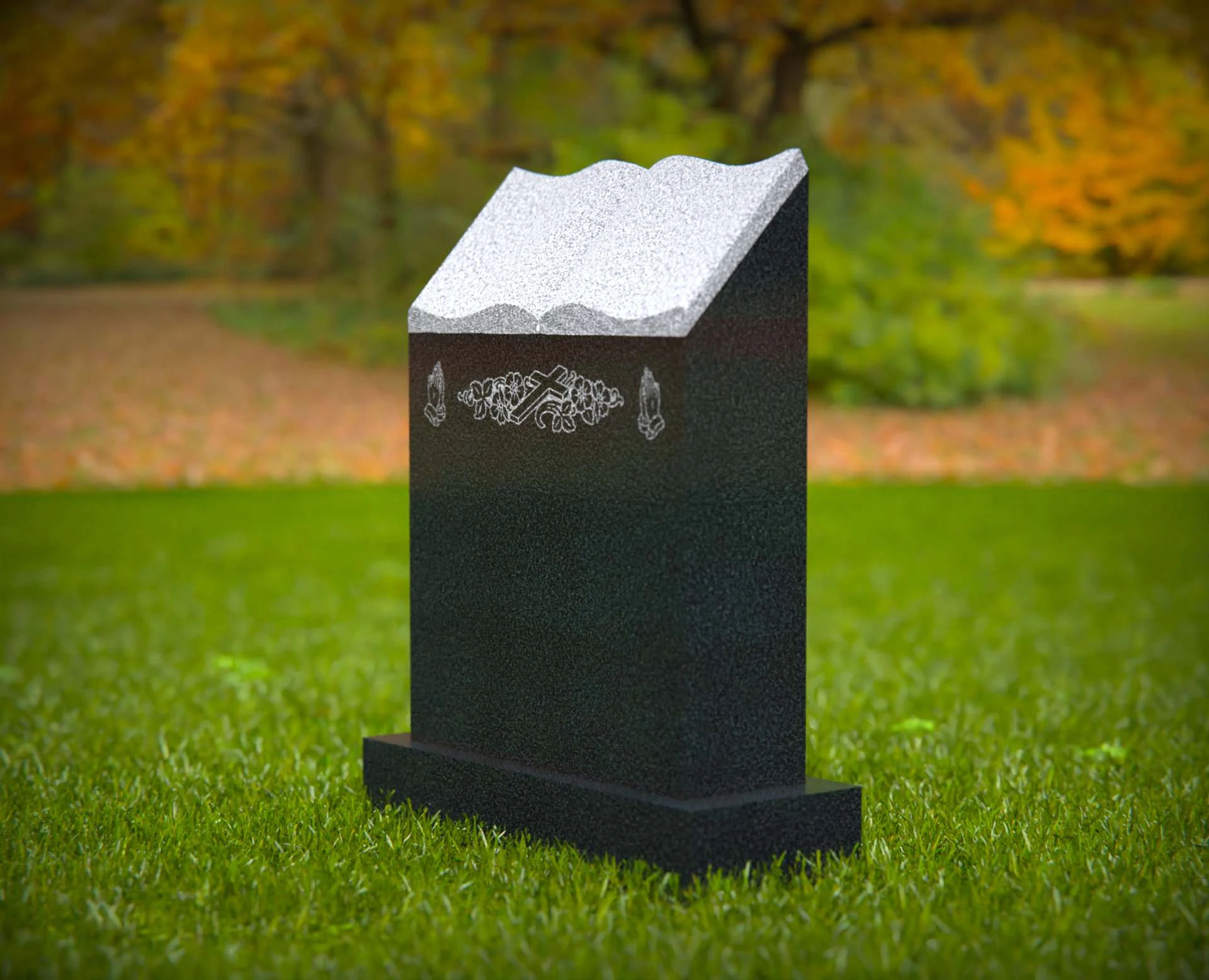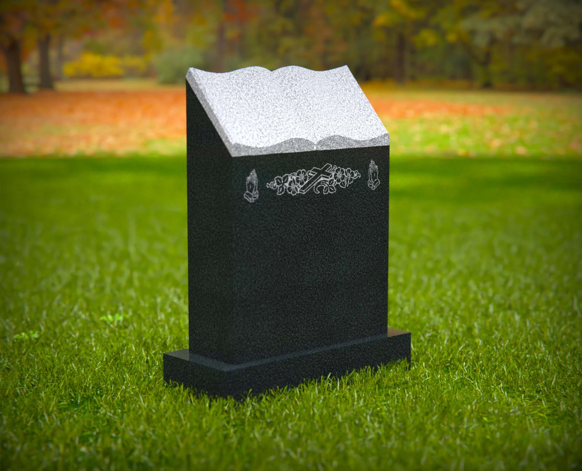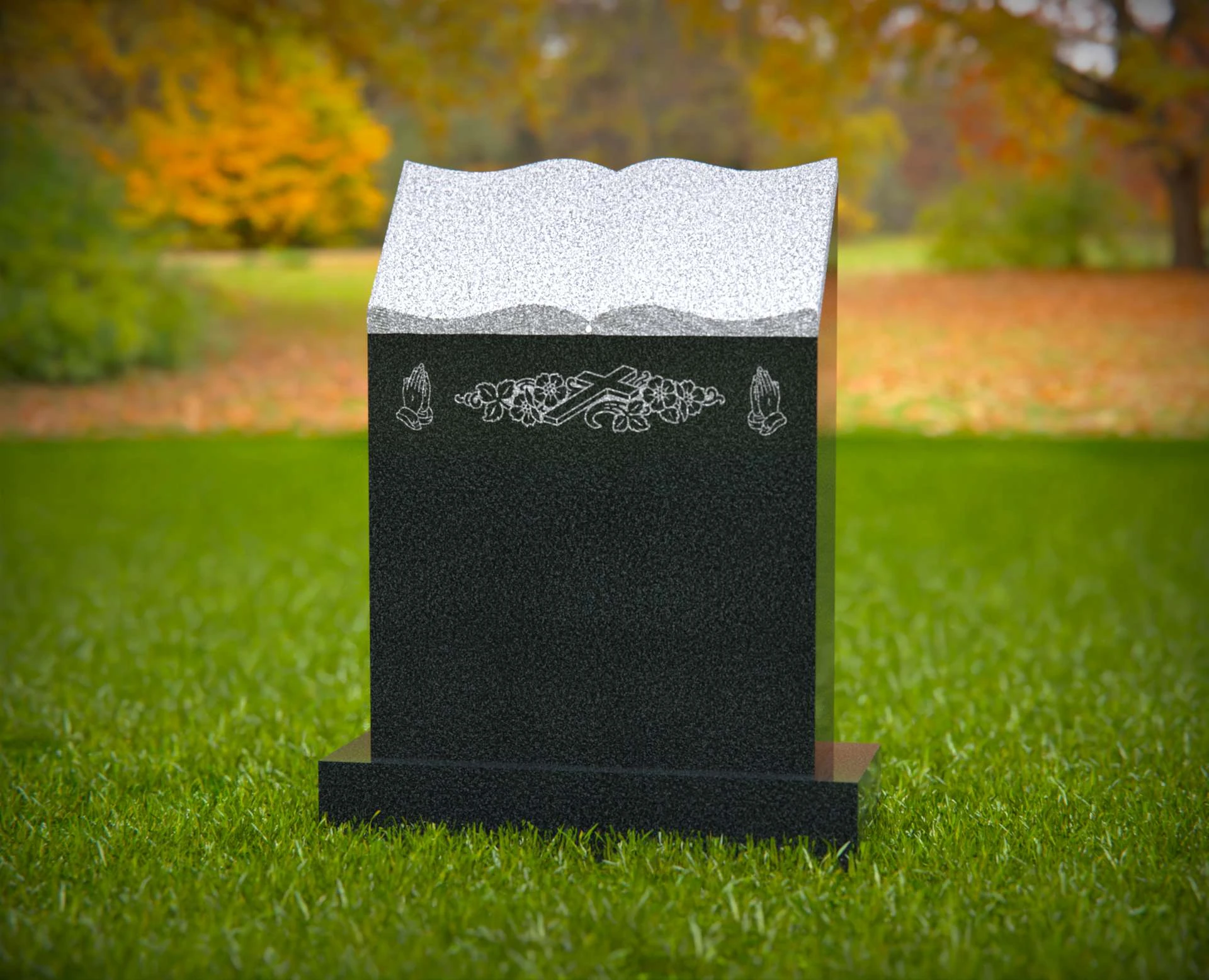 A unique book-shaped memorial headstone symbolizing knowledge, faith, and eternal remembrance. Featuring beautifully engraved religious elements, including a cross, floral designs, and praying hands, this gravestone serves as a meaningful tribute to a loved one. Set in a tranquil cemetery setting, it reflects devotion, peace, and spiritual legacy. Ideal for discussions on personalized gravestone designs and religious memorial traditions.