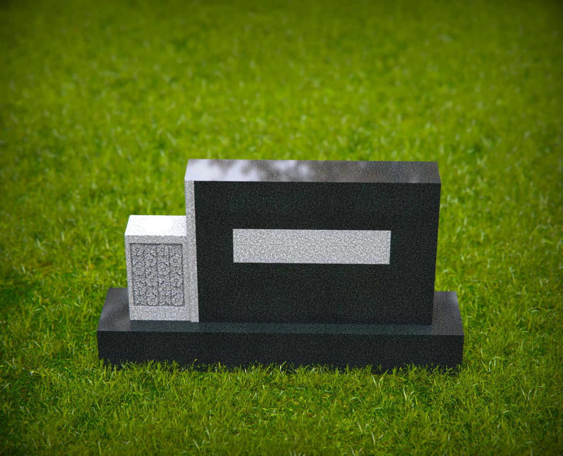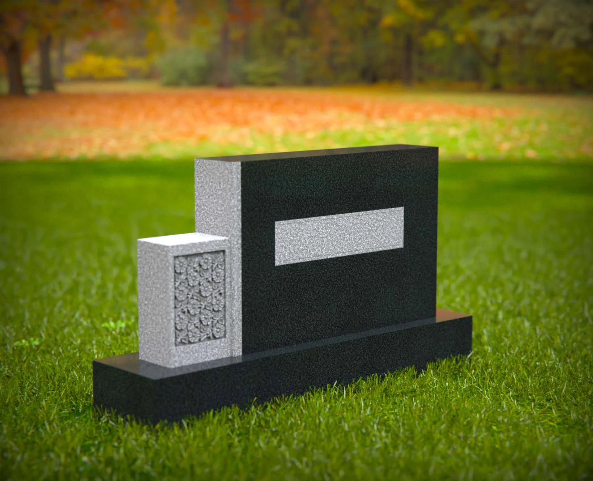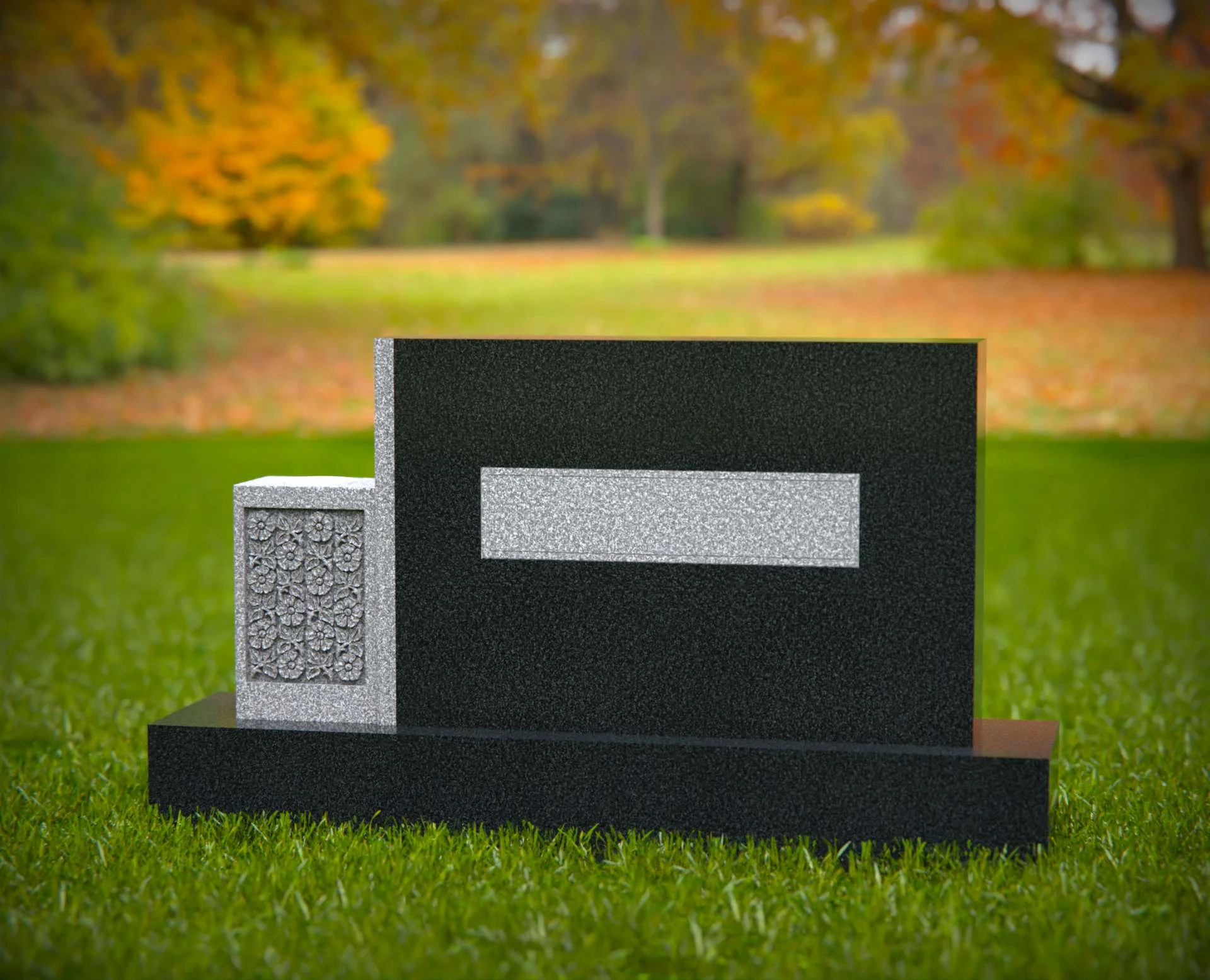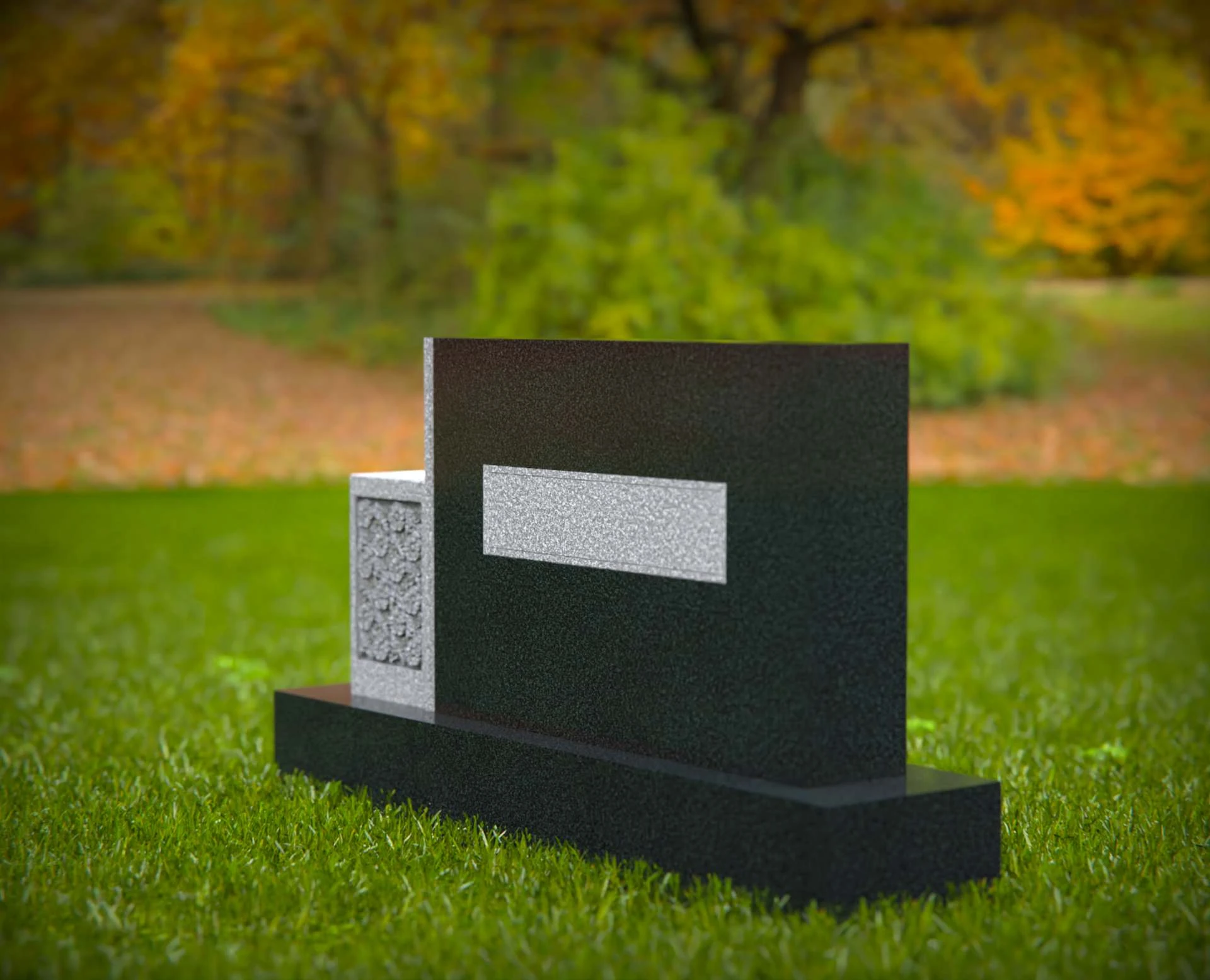 A contemporary memorial headstone featuring a sleek geometric design combined with a detailed floral engraving. The unique layout adds a modern yet timeless aesthetic, offering a distinguished tribute to a loved one. Set in a peaceful cemetery landscape, this gravestone symbolizes remembrance and elegance. Perfect for discussions on innovative gravestone designs and personalized memorial styles.