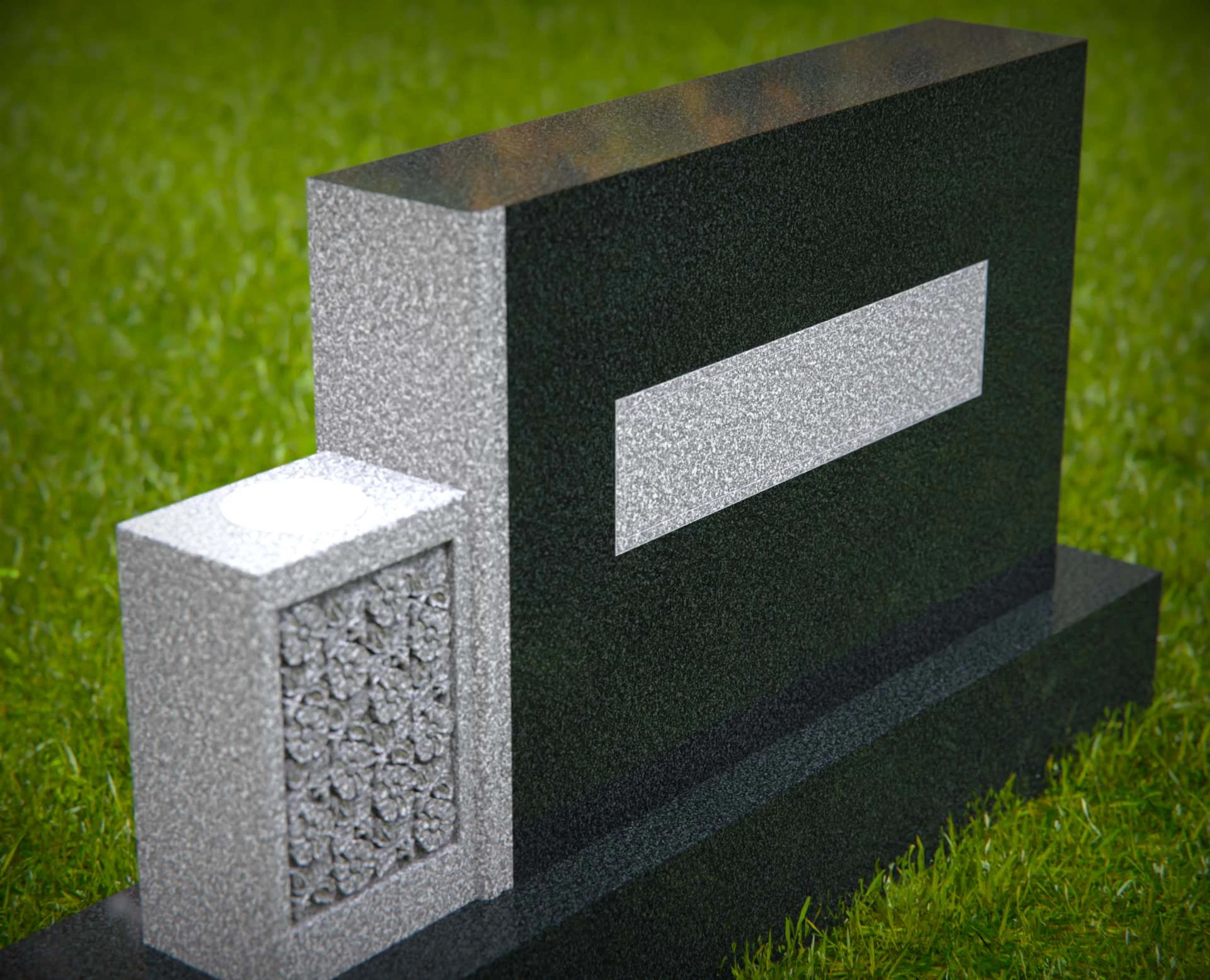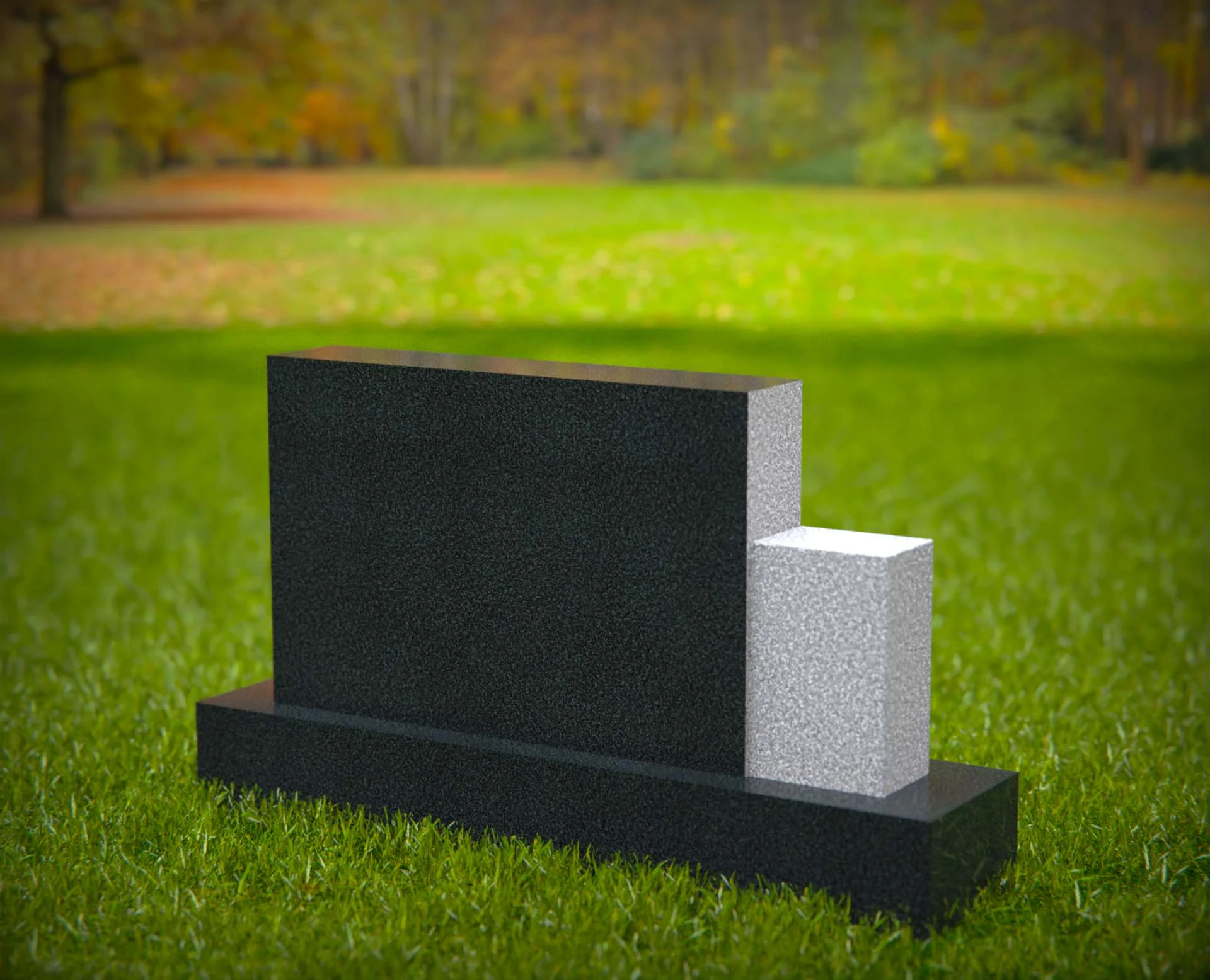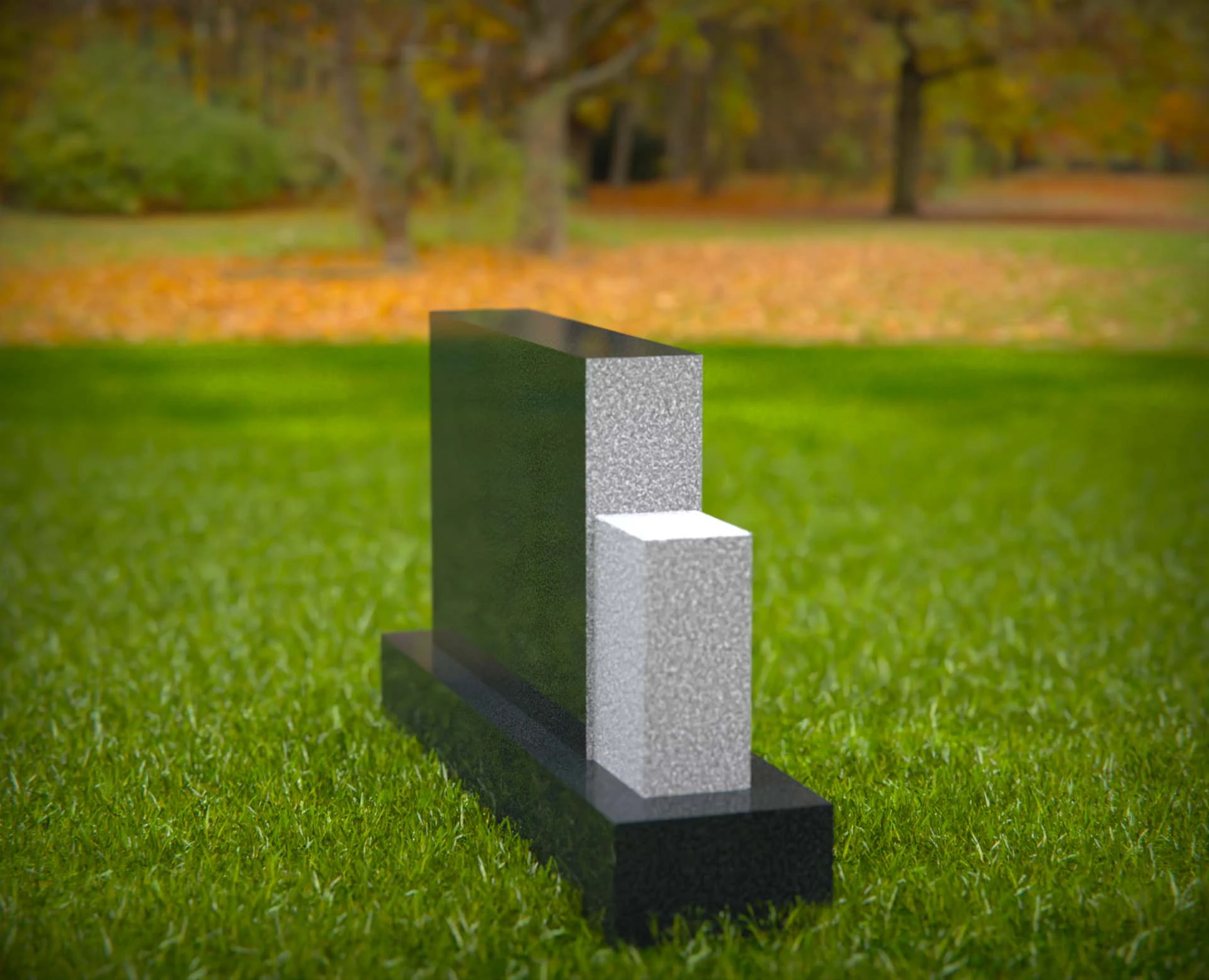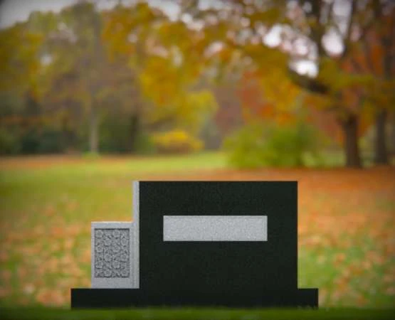 A contemporary memorial headstone featuring a sleek geometric design combined with a detailed floral engraving. The unique layout adds a modern yet timeless aesthetic, offering a distinguished tribute to a loved one. Set in a peaceful cemetery landscape, this gravestone symbolizes remembrance and elegance. Perfect for discussions on innovative gravestone designs and personalized memorial styles.