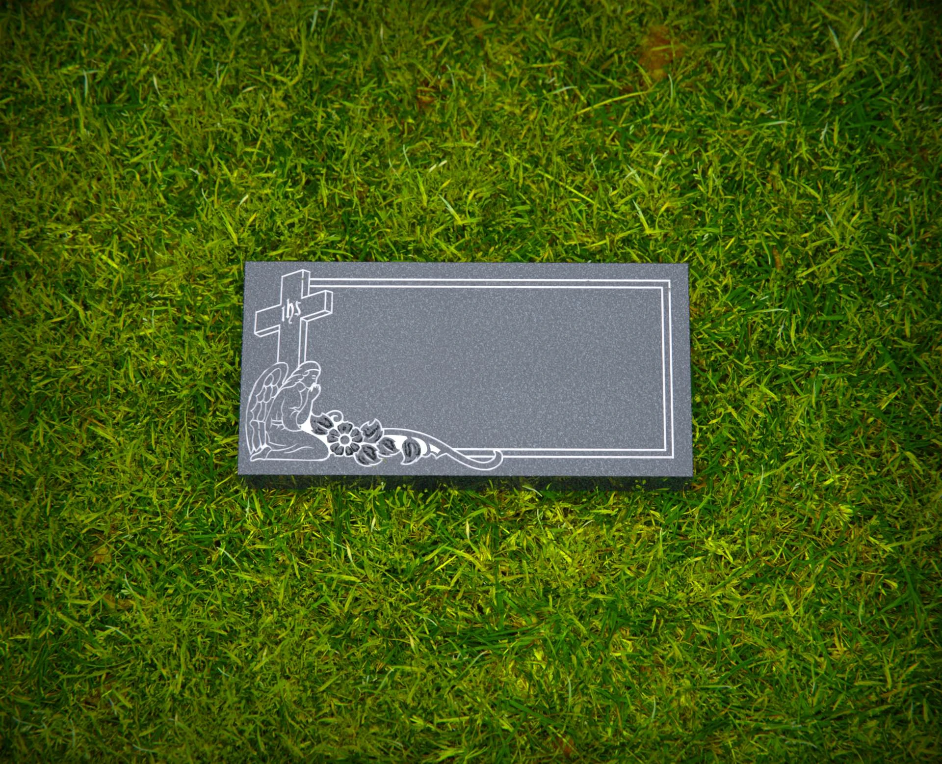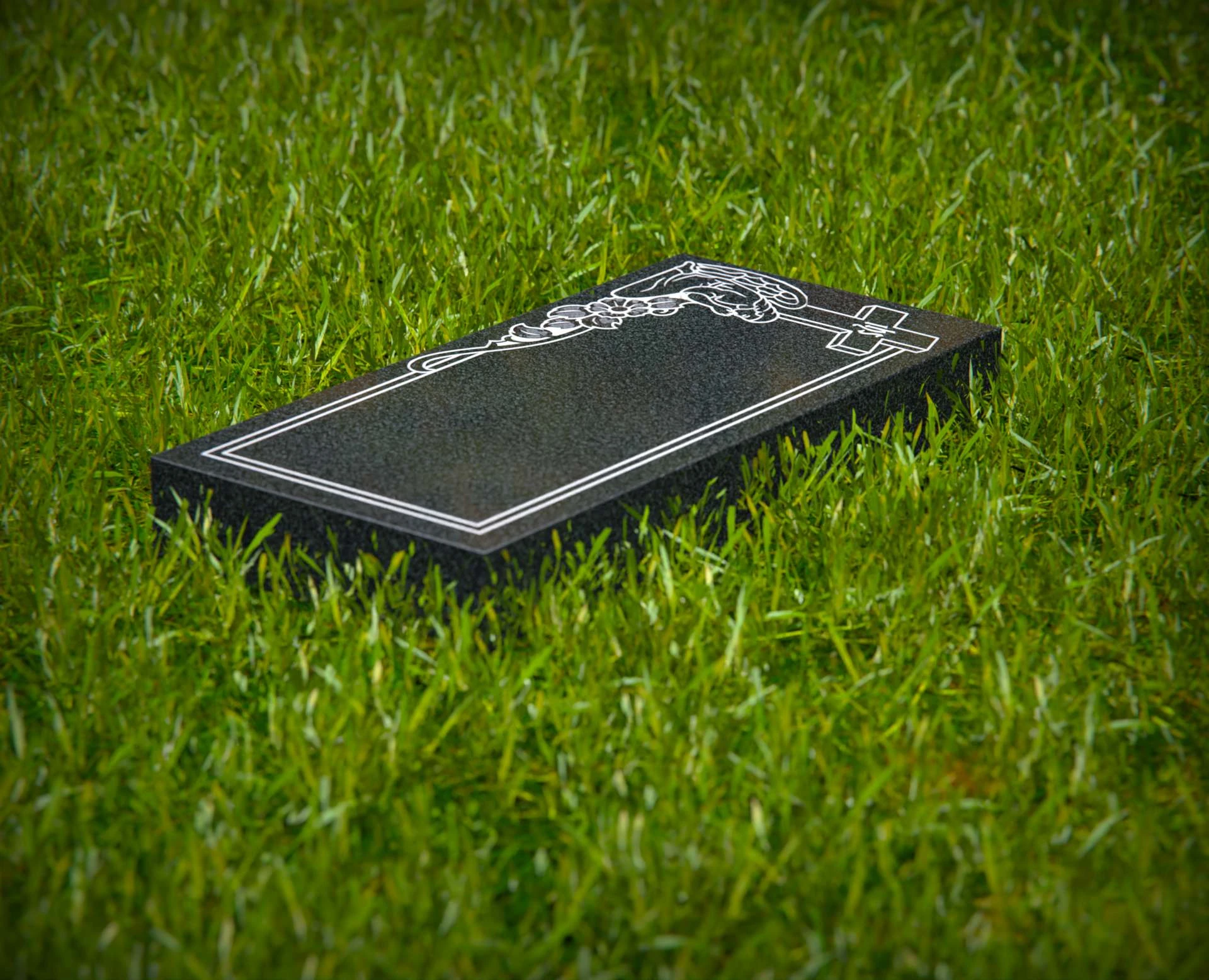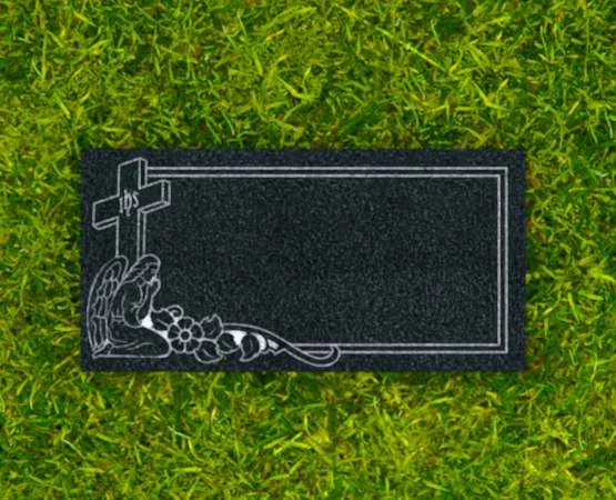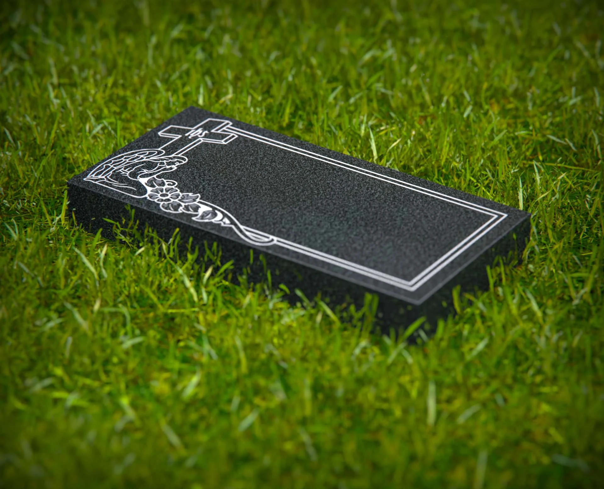 1643 - Angel & Cross Flat Granite Grave Marker with Floral Engraving