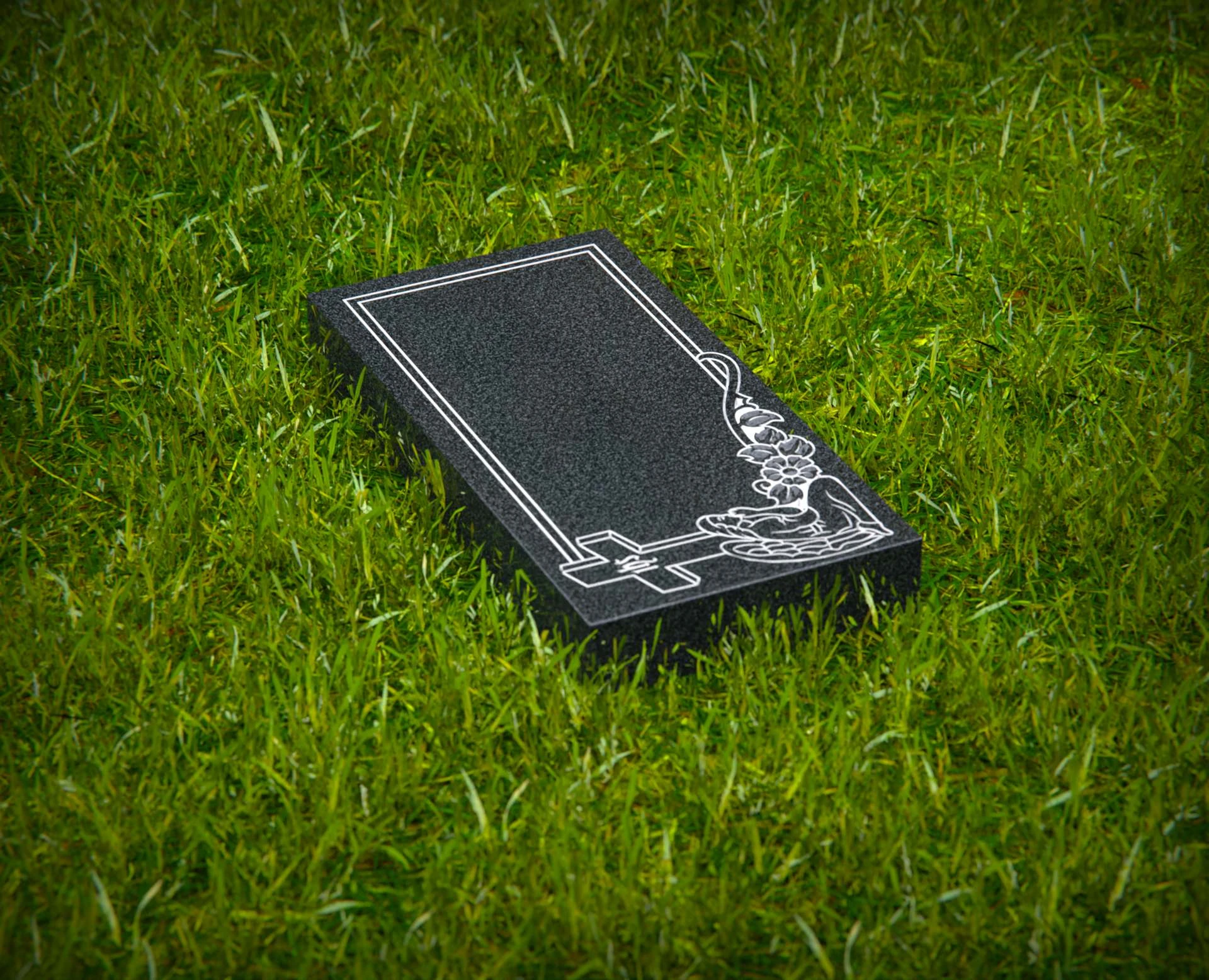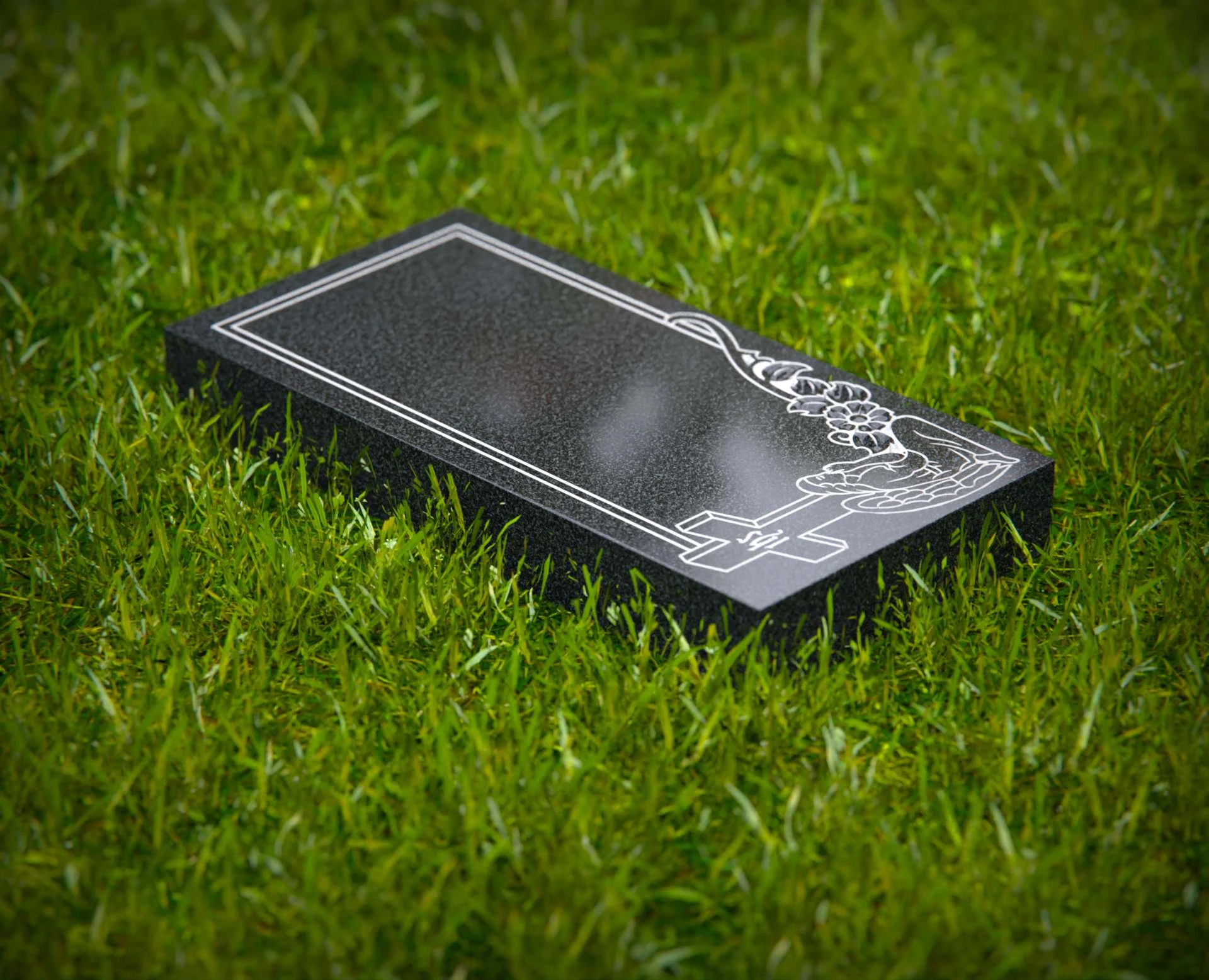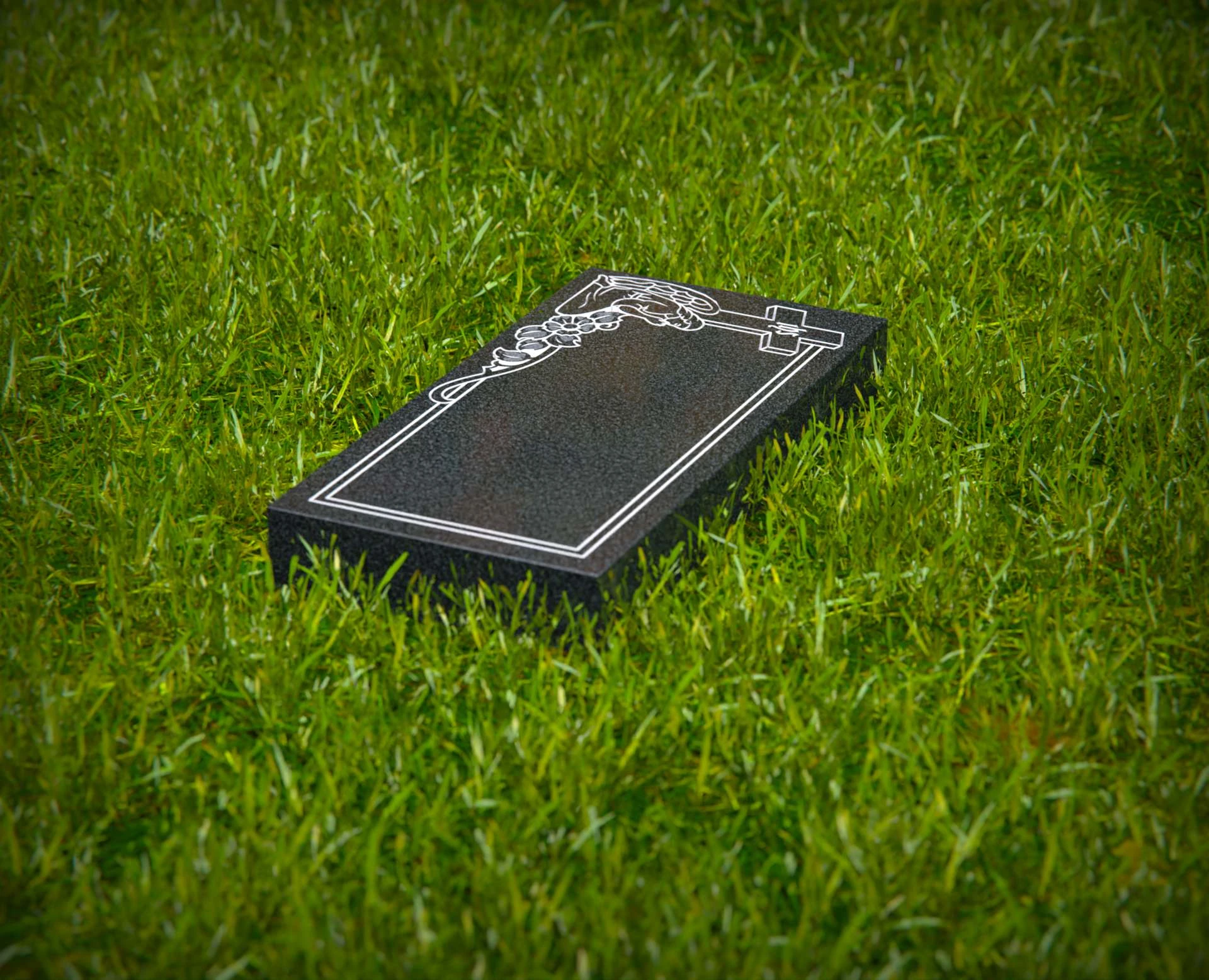 1643 - Angel & Cross Flat Granite Grave Marker with Floral Engraving