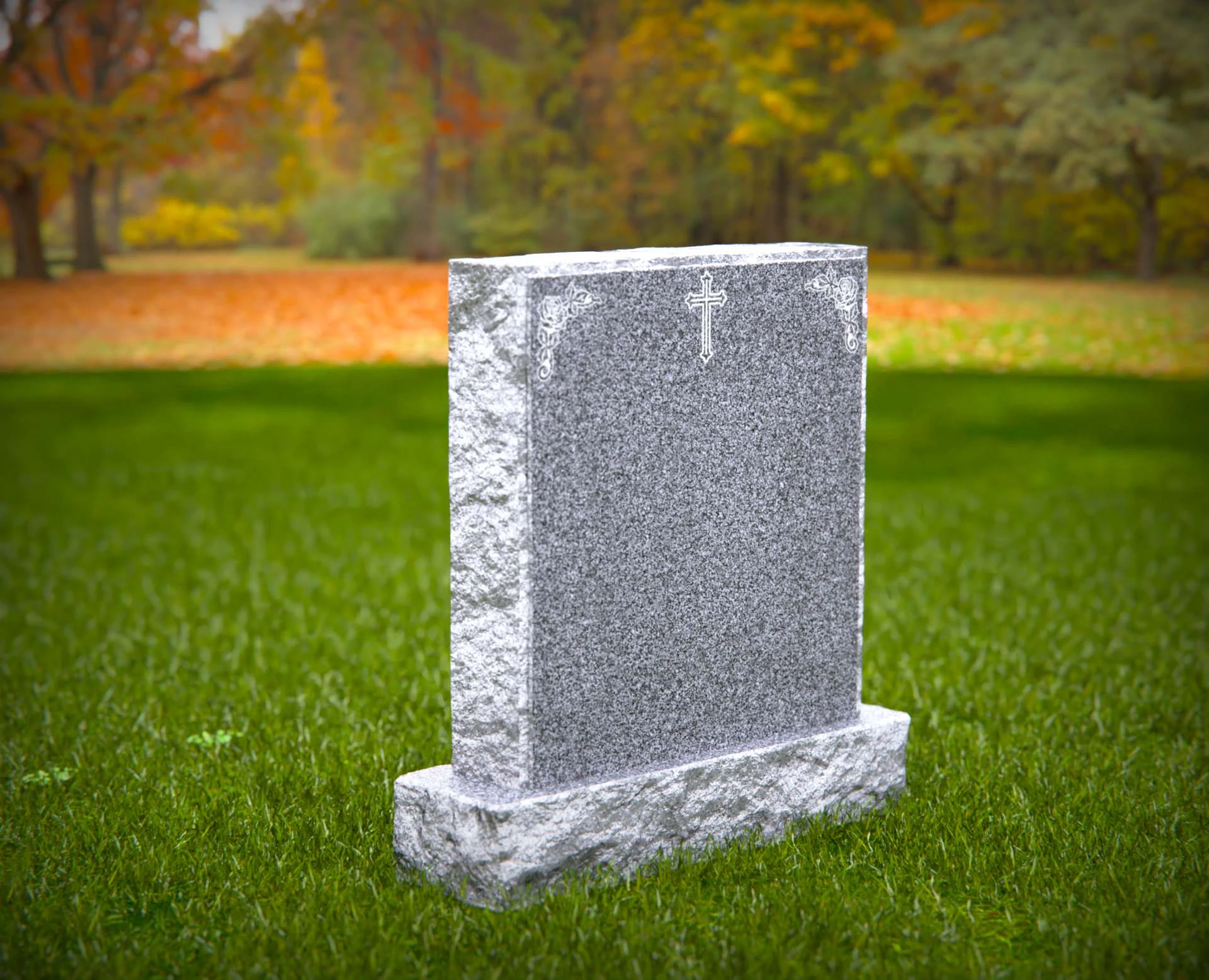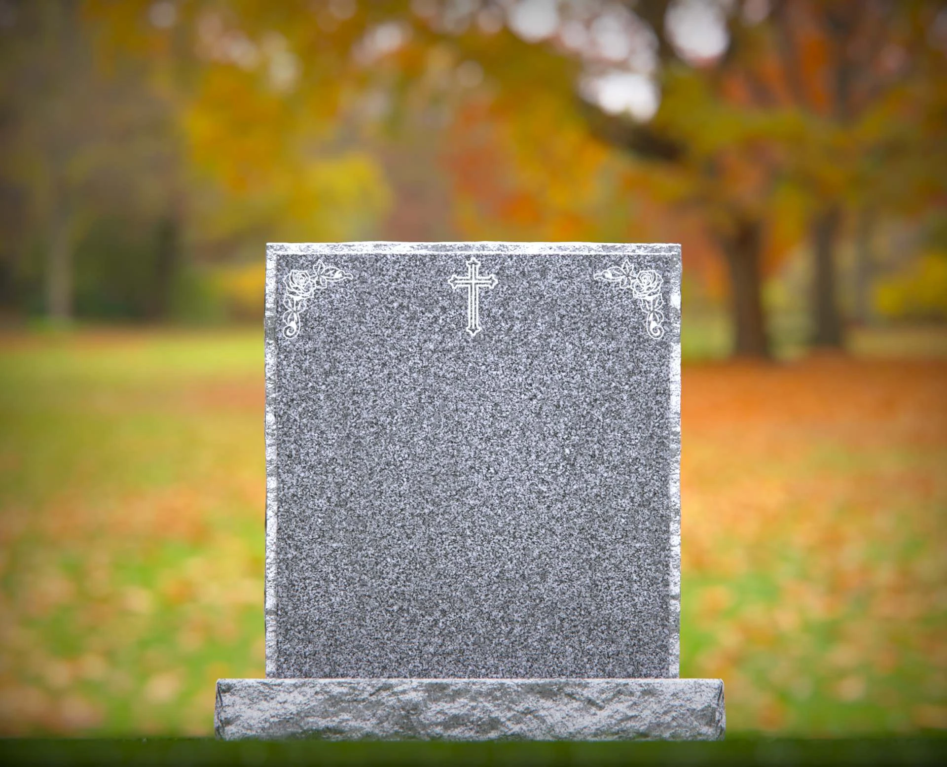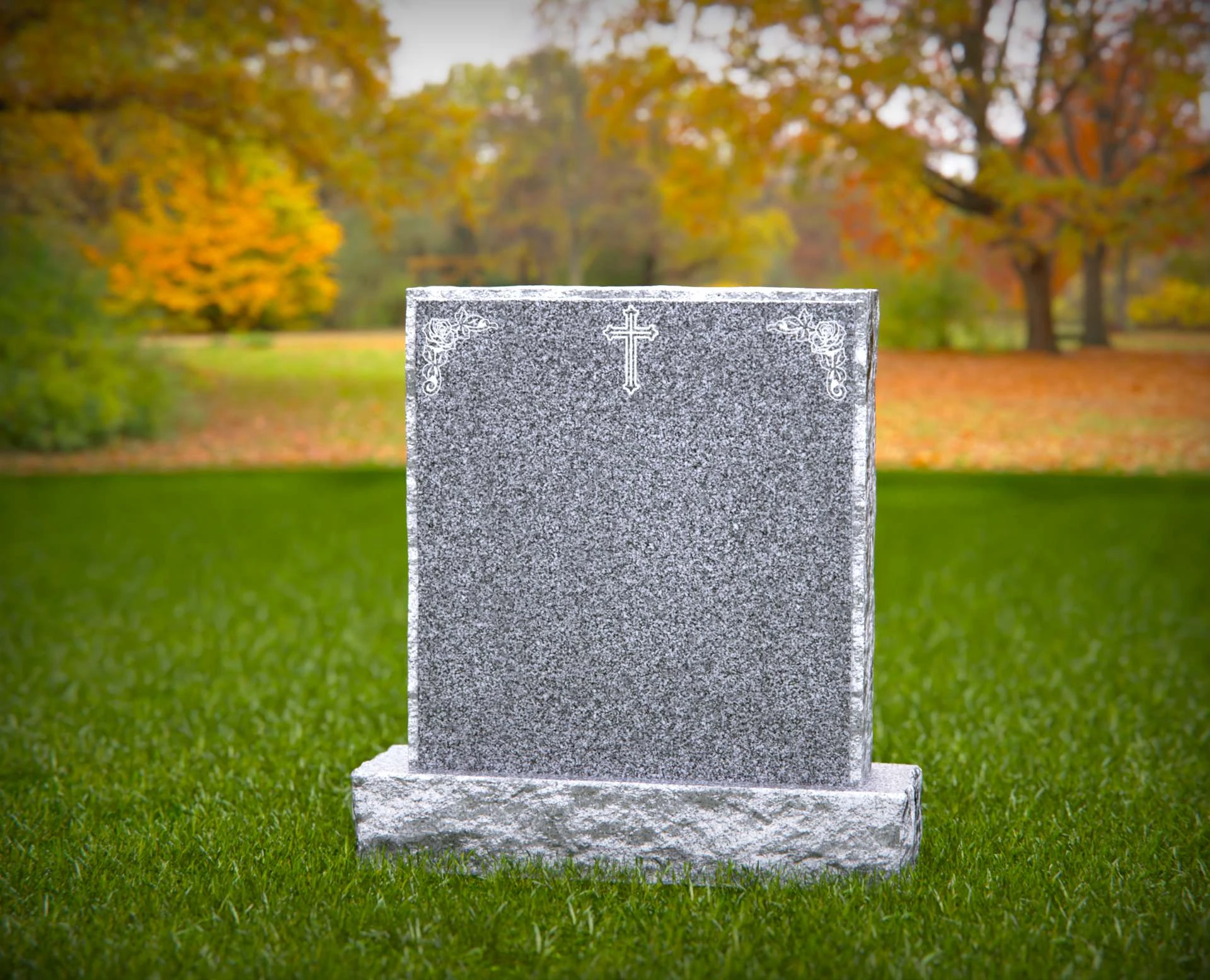 This classic upright headstone showcases a refined design ideal for commemorating a life of faith and love. The stone features a delicately engraved cross at the top center, symbolizing spiritual devotion, framed by ornate floral designs in each upper corner. Placed in a calm and natural park environment, this monument provides a graceful and enduring tribute. Perfect for funeral planning resources, headstone catalogs, and faith-inspired memorial collections.
