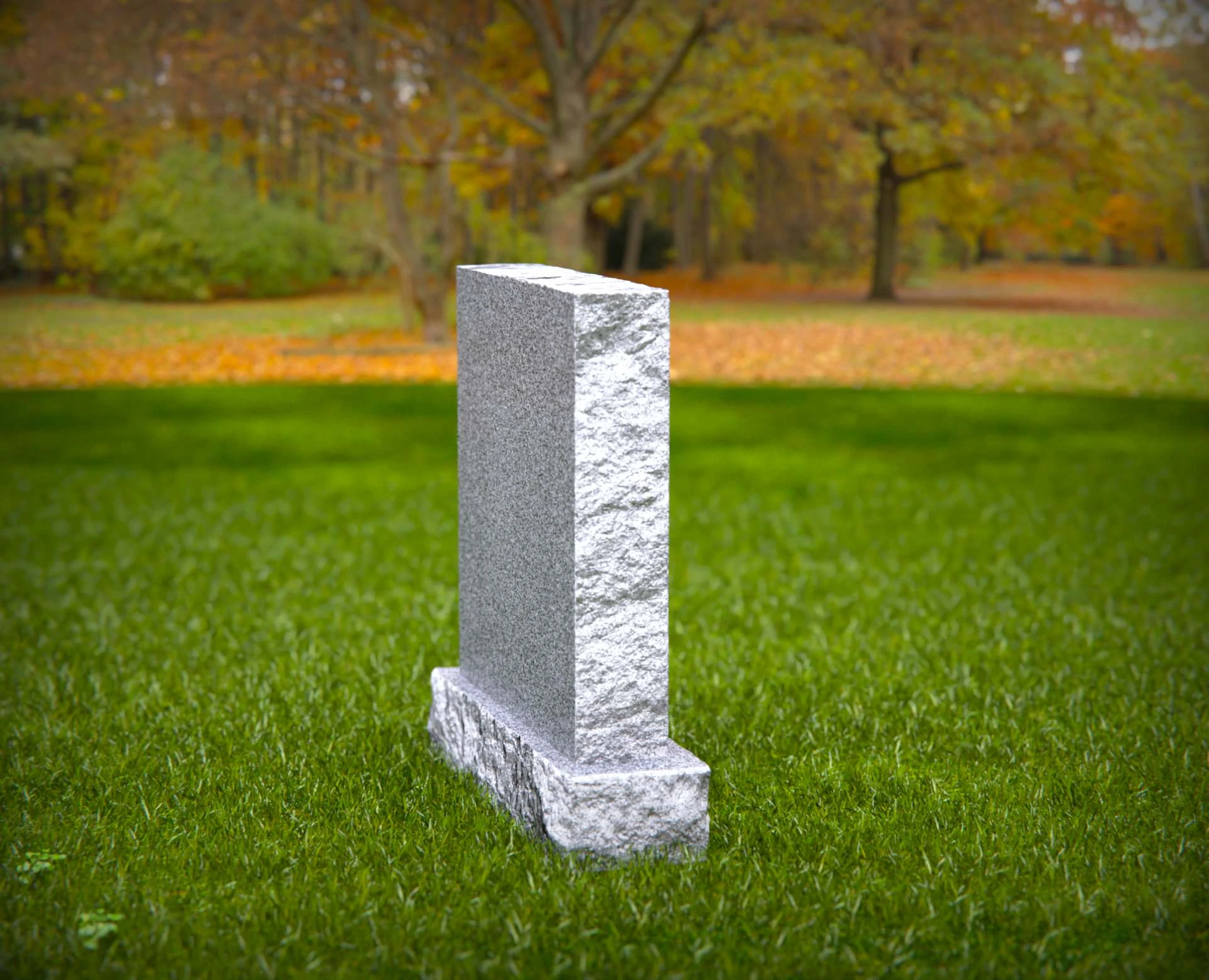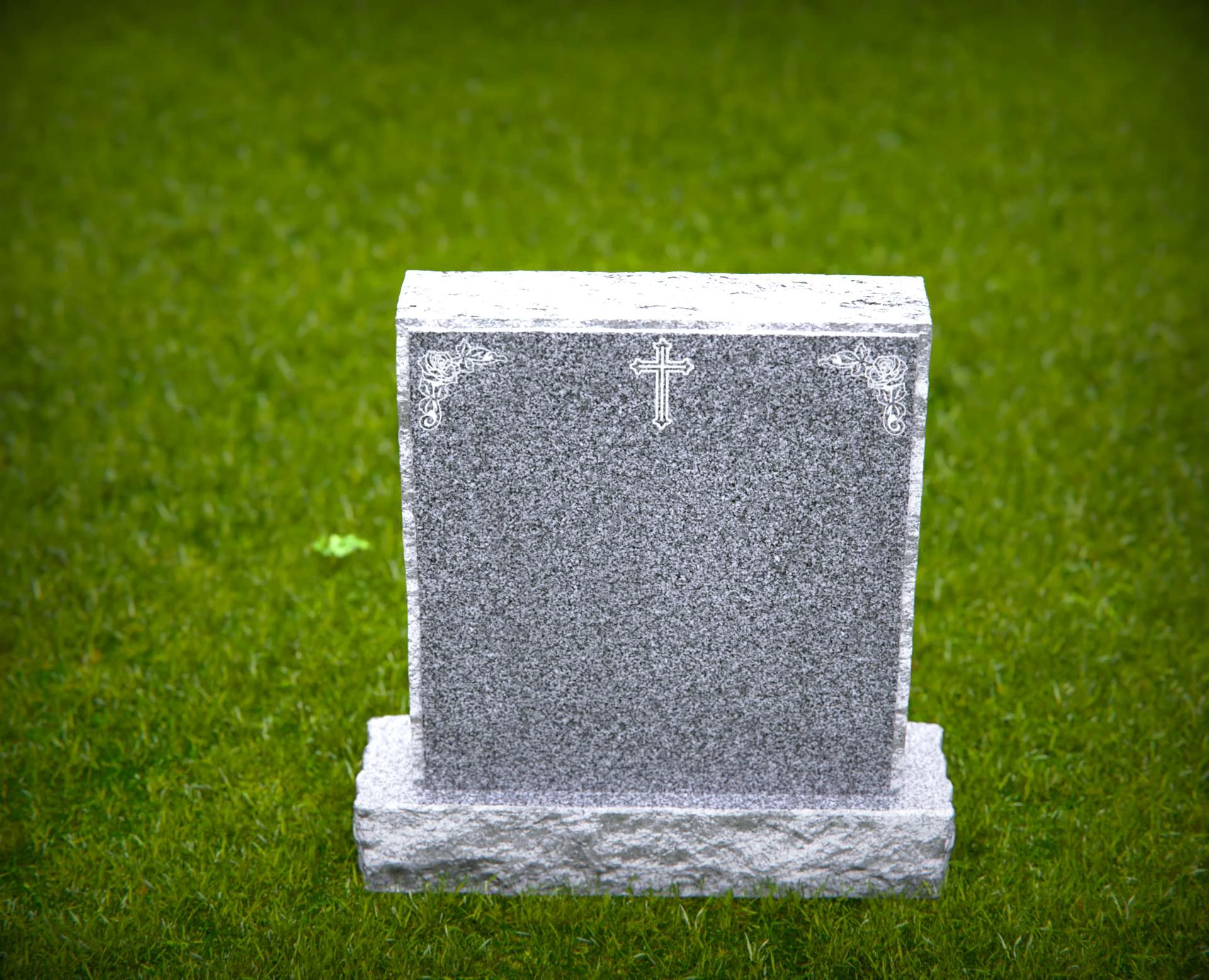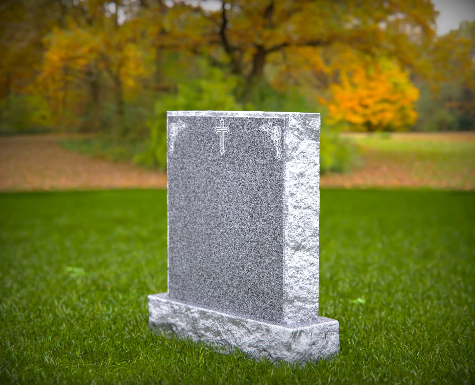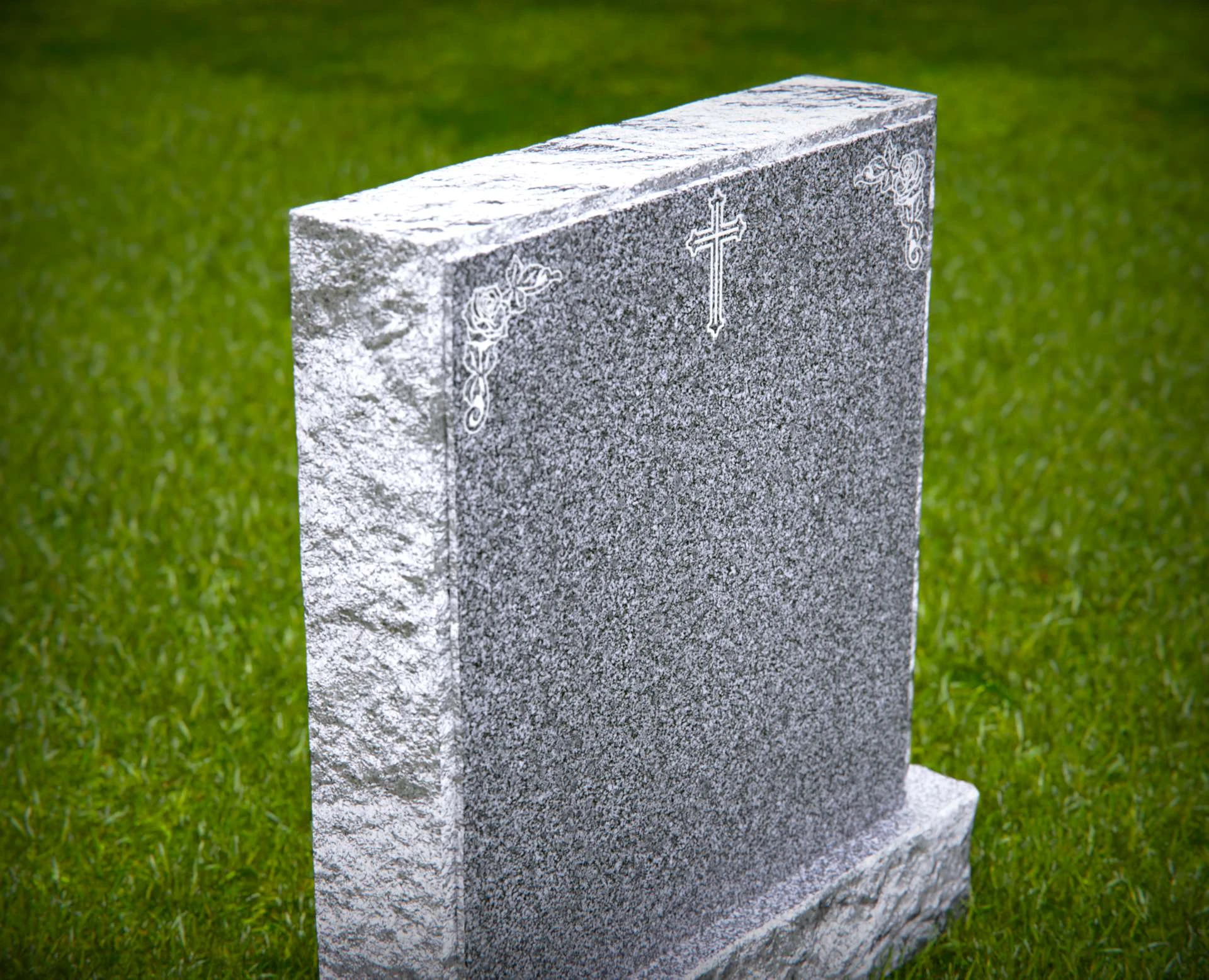 This classic upright headstone showcases a refined design ideal for commemorating a life of faith and love. The stone features a delicately engraved cross at the top center, symbolizing spiritual devotion, framed by ornate floral designs in each upper corner. Placed in a calm and natural park environment, this monument provides a graceful and enduring tribute. Perfect for funeral planning resources, headstone catalogs, and faith-inspired memorial collections.