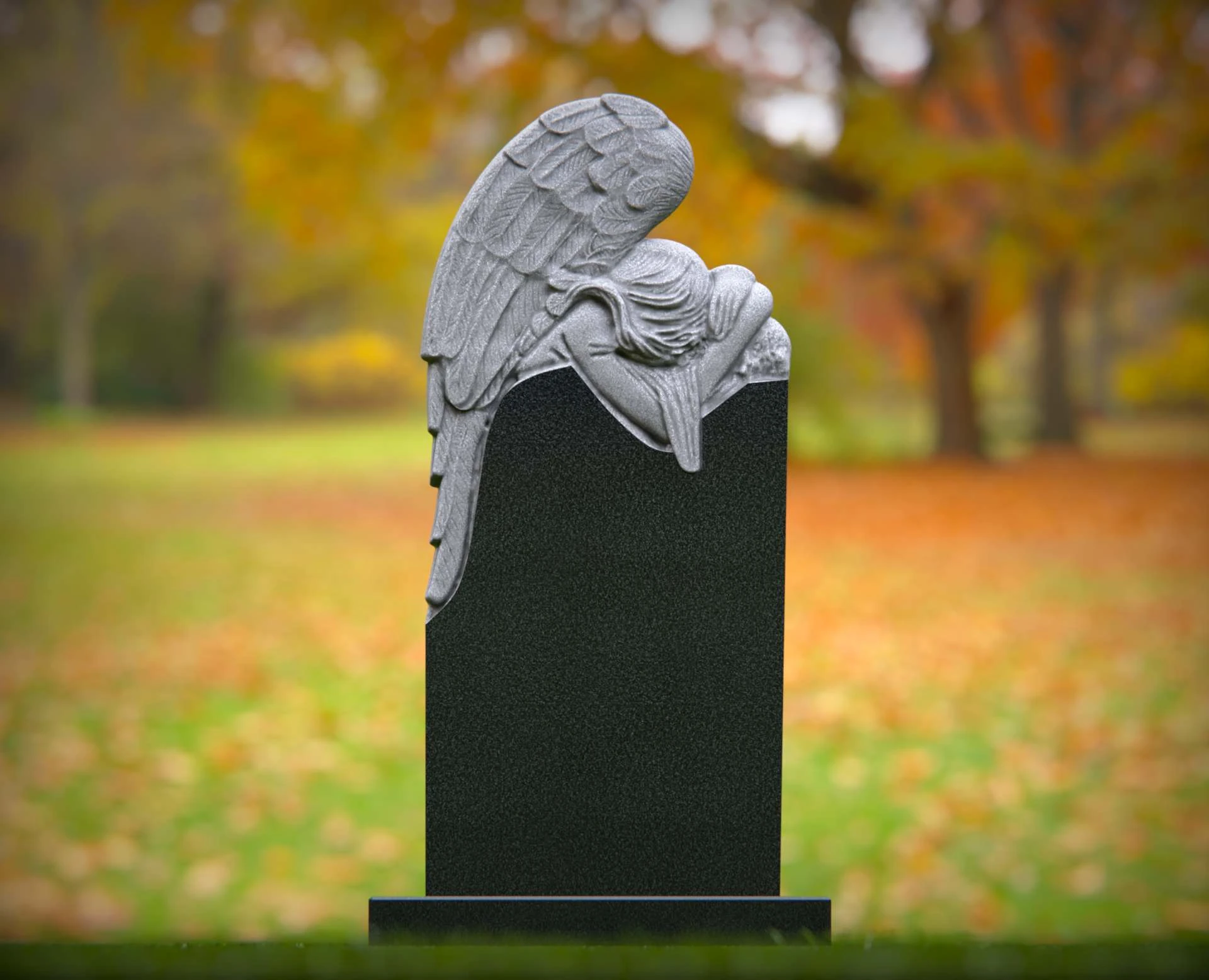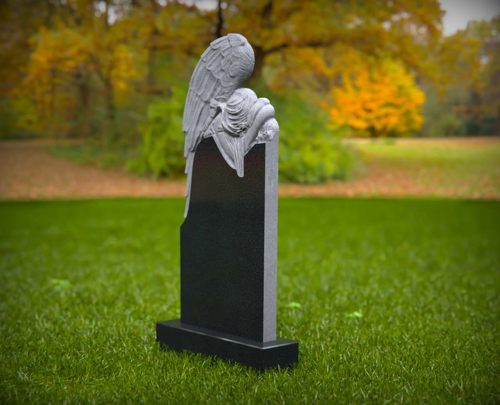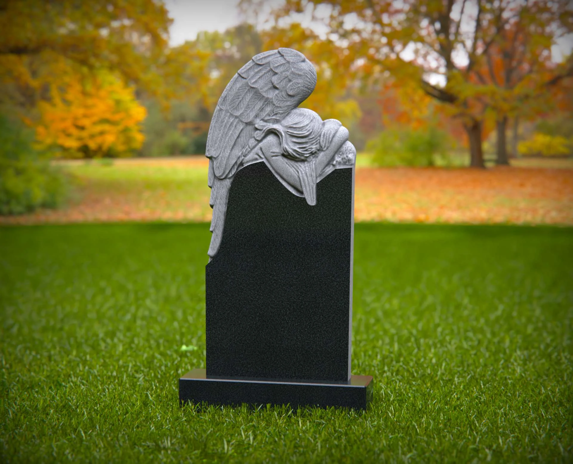 This poignant headstone features a beautifully sculpted weeping angel, resting in sorrow atop a sleek rectangular monument. Symbolizing deep love, remembrance, and mourning, the design conveys a powerful emotional tribute to a cherished soul. With a gently curved top and smooth inscription area, this headstone offers space for custom engraving and serves as a lasting, heartfelt memorial in any cemetery or garden of reflection.