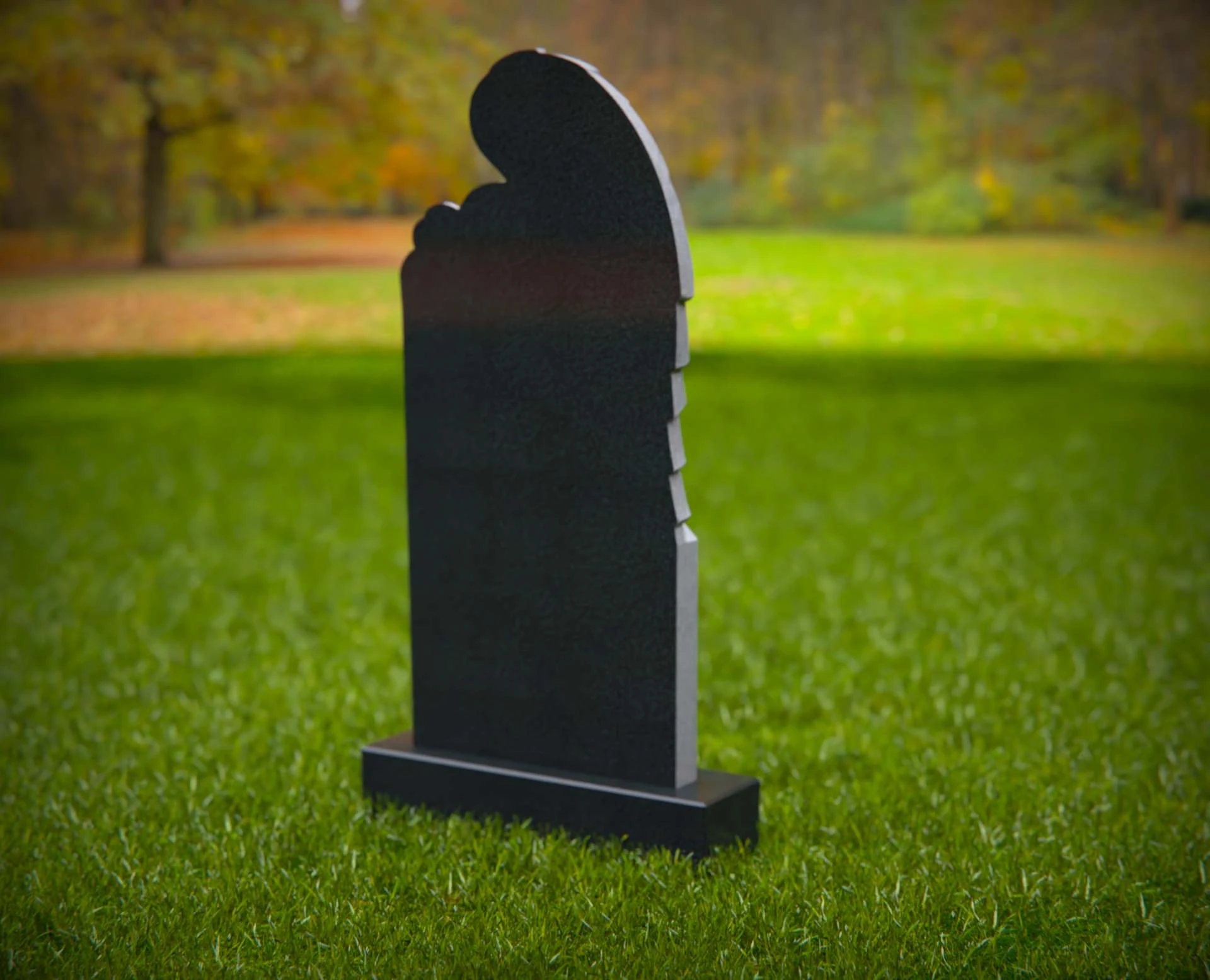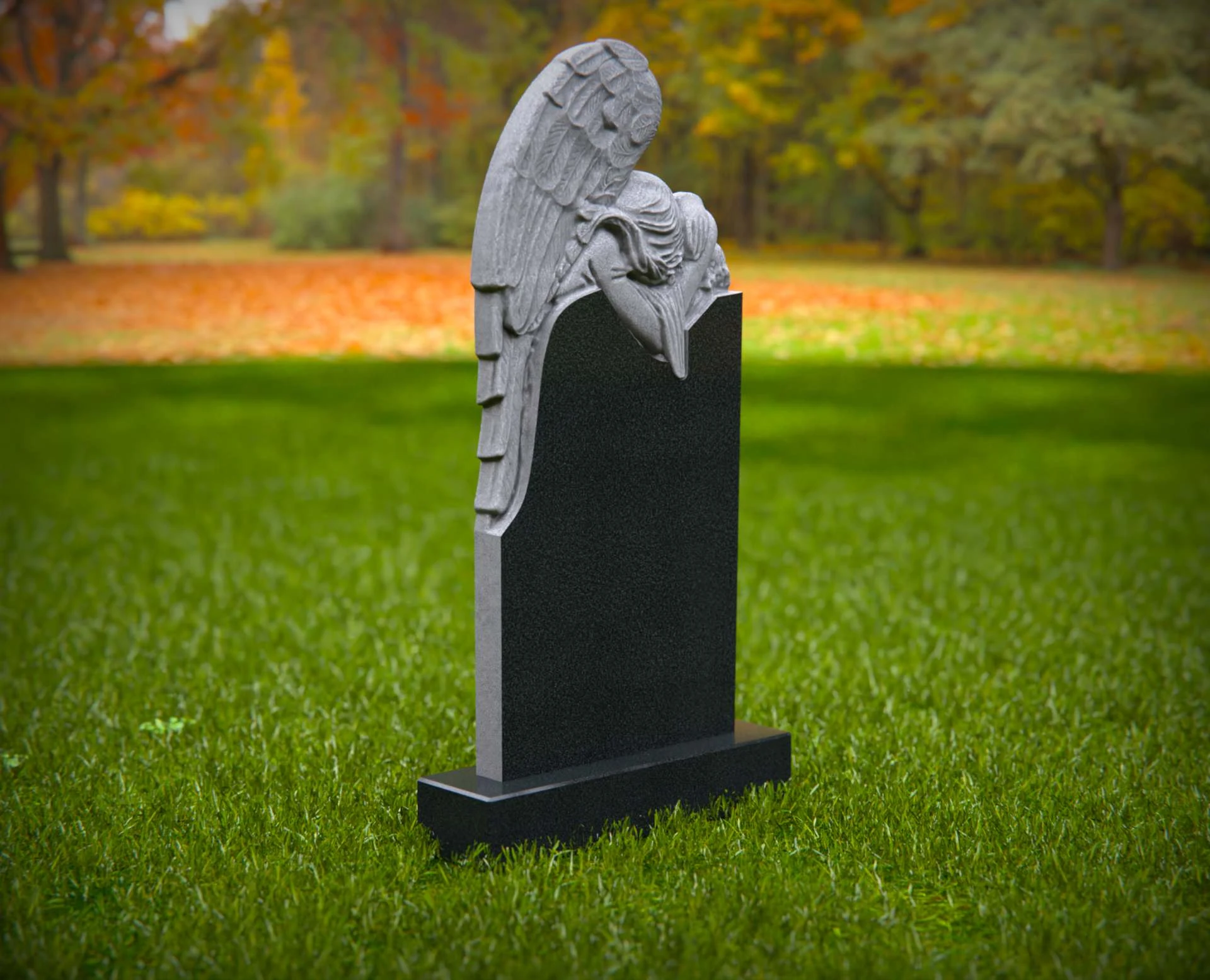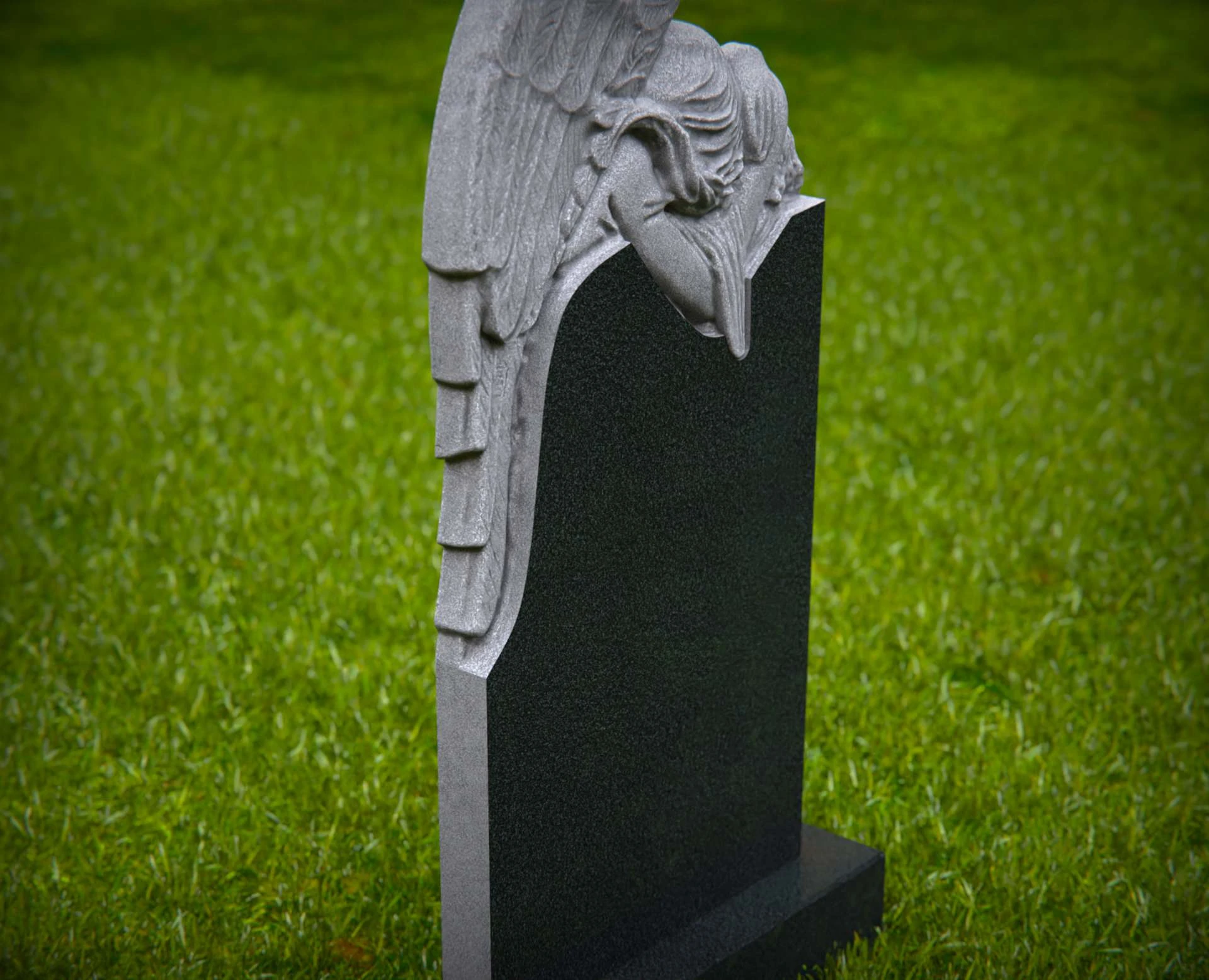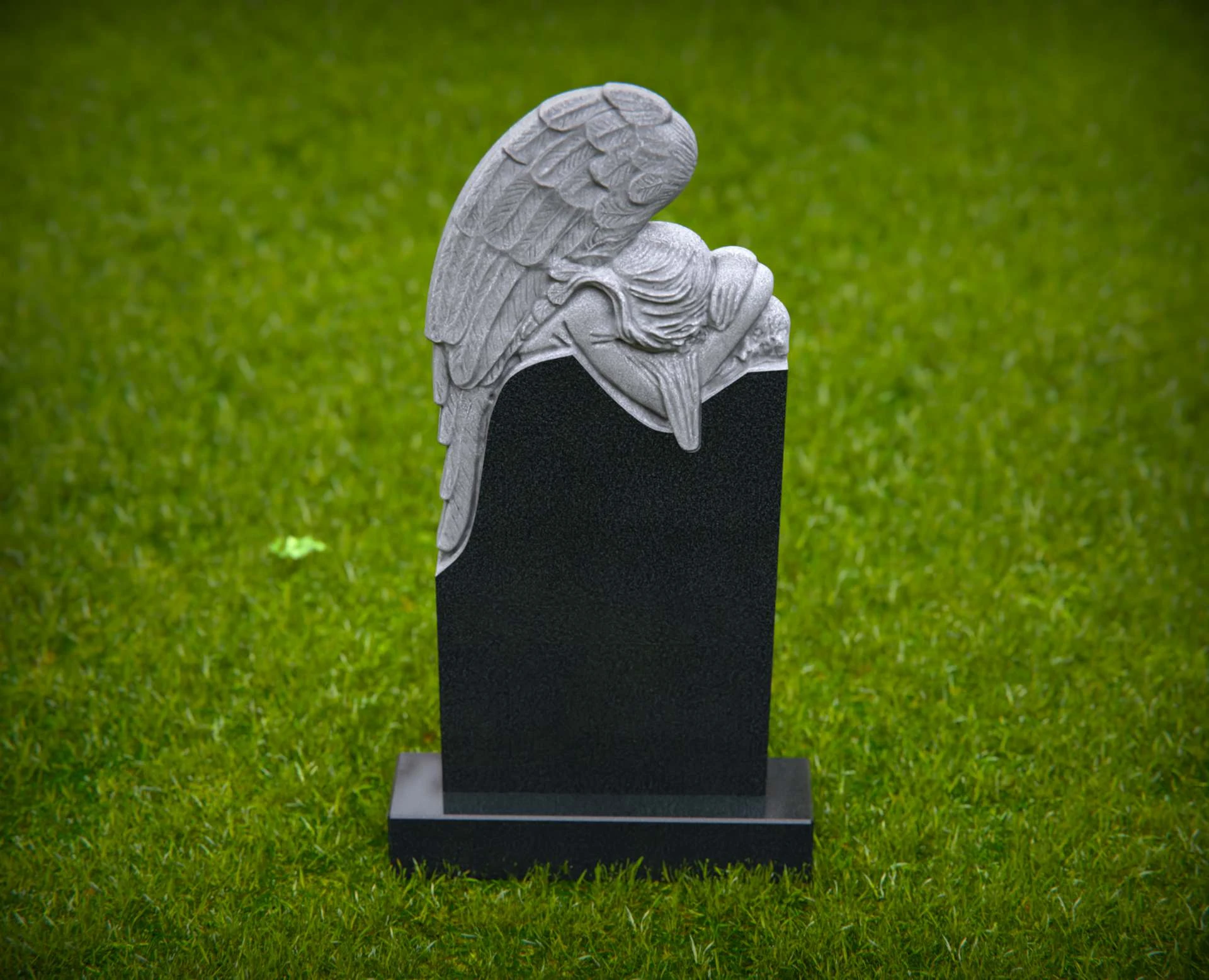 This poignant headstone features a beautifully sculpted weeping angel, resting in sorrow atop a sleek rectangular monument. Symbolizing deep love, remembrance, and mourning, the design conveys a powerful emotional tribute to a cherished soul. With a gently curved top and smooth inscription area, this headstone offers space for custom engraving and serves as a lasting, heartfelt memorial in any cemetery or garden of reflection.