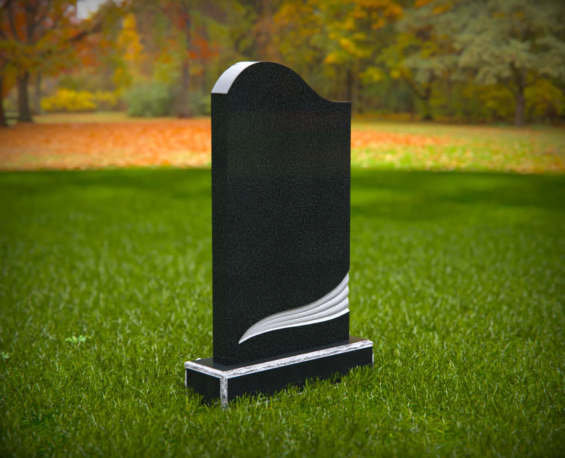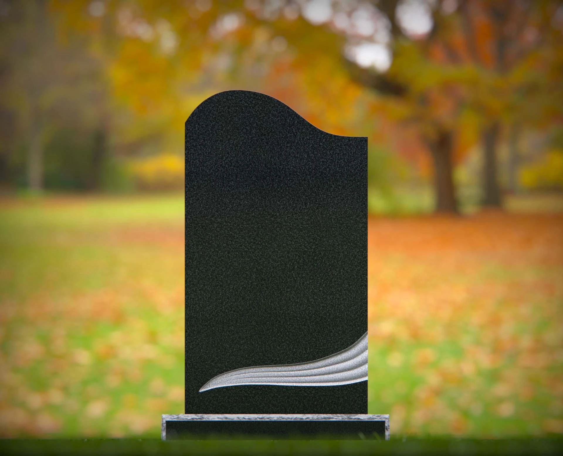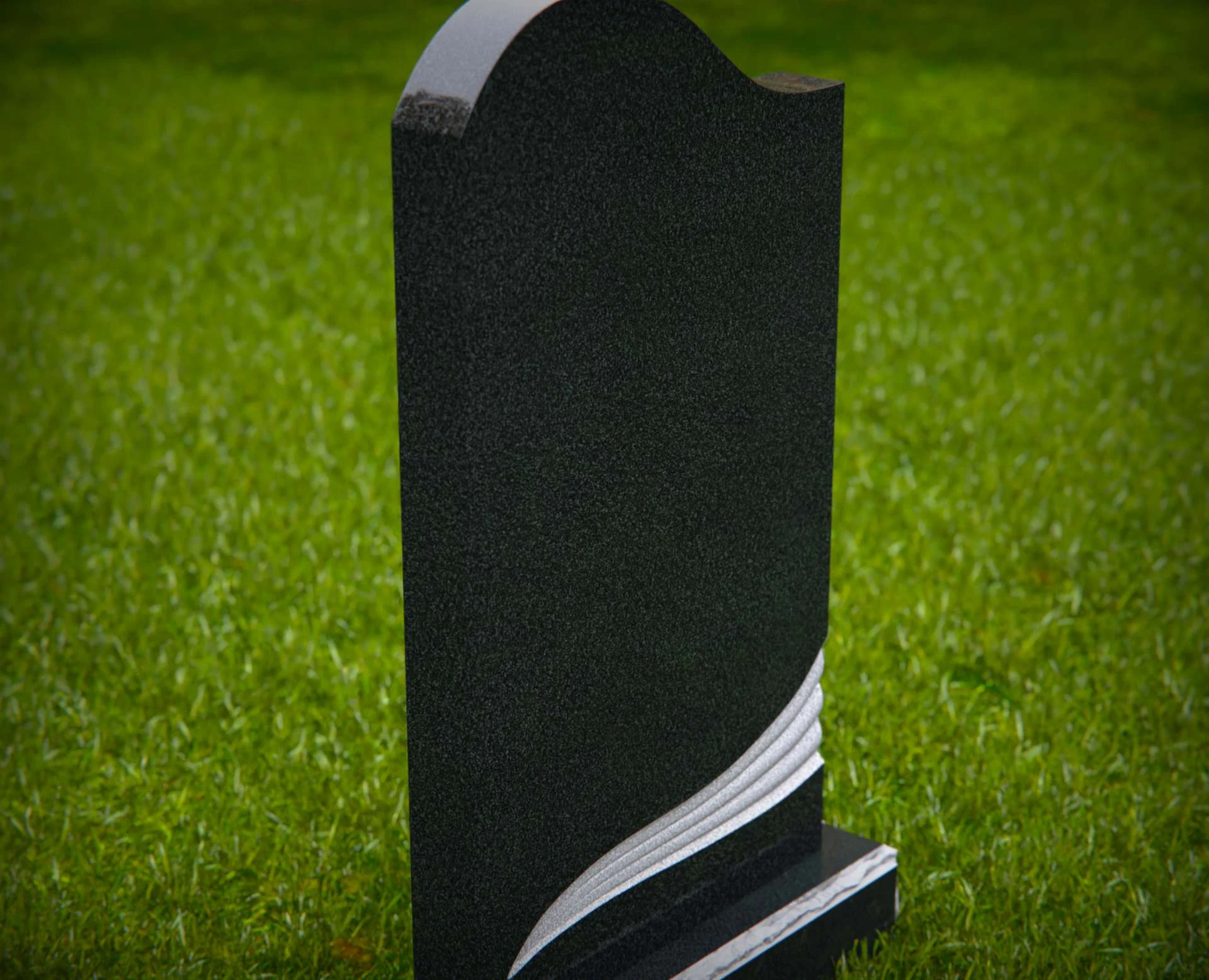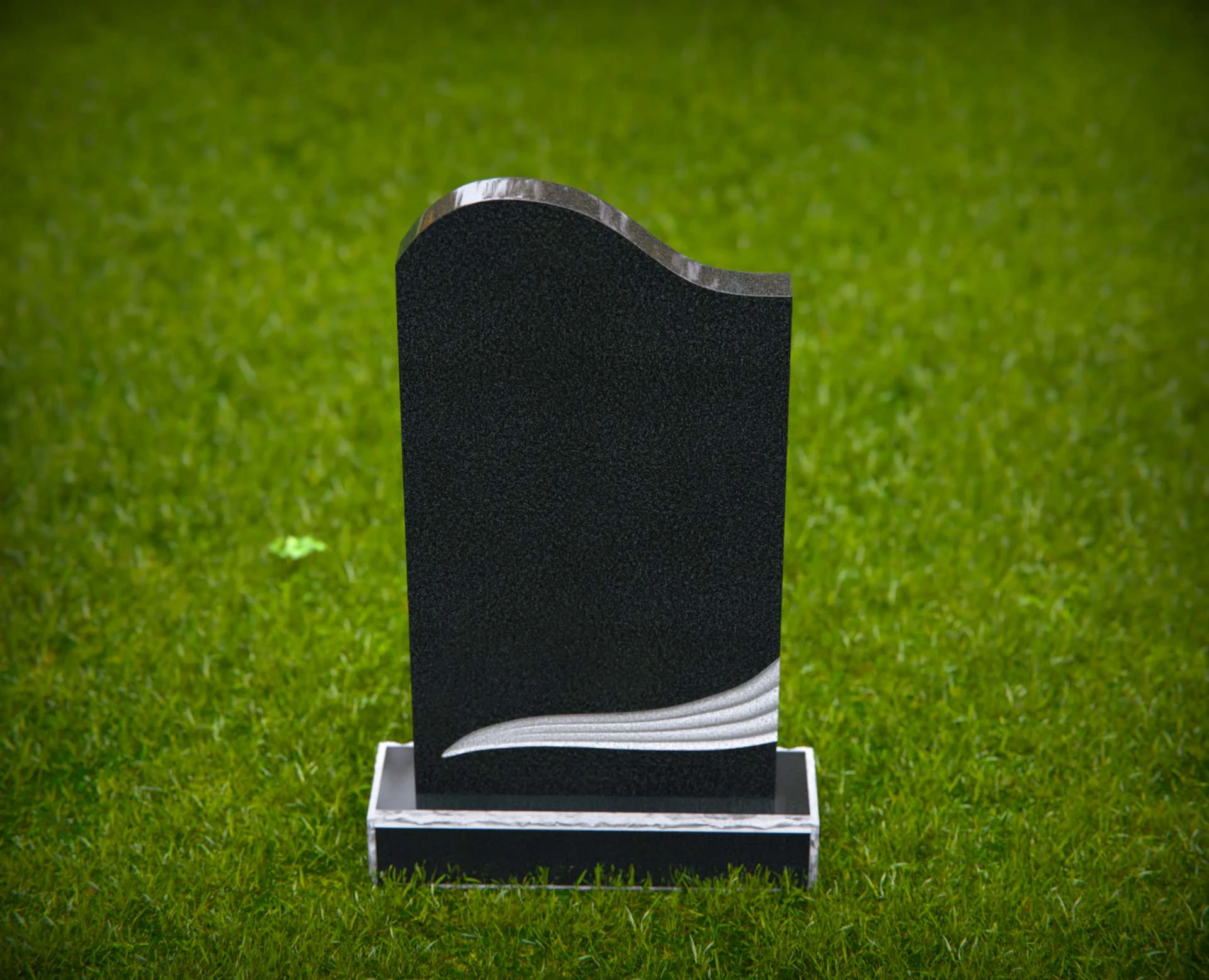 This contemporary upright headstone features a clean silhouette with a softly curved top and an elegant sculpted wave design near the base. Blending simplicity with modern artistry, this monument offers a unique yet respectful tribute to a loved one. The smooth surface provides ample space for personalized inscriptions, while the subtle detailing adds a touch of symbolism and grace to any cemetery setting.