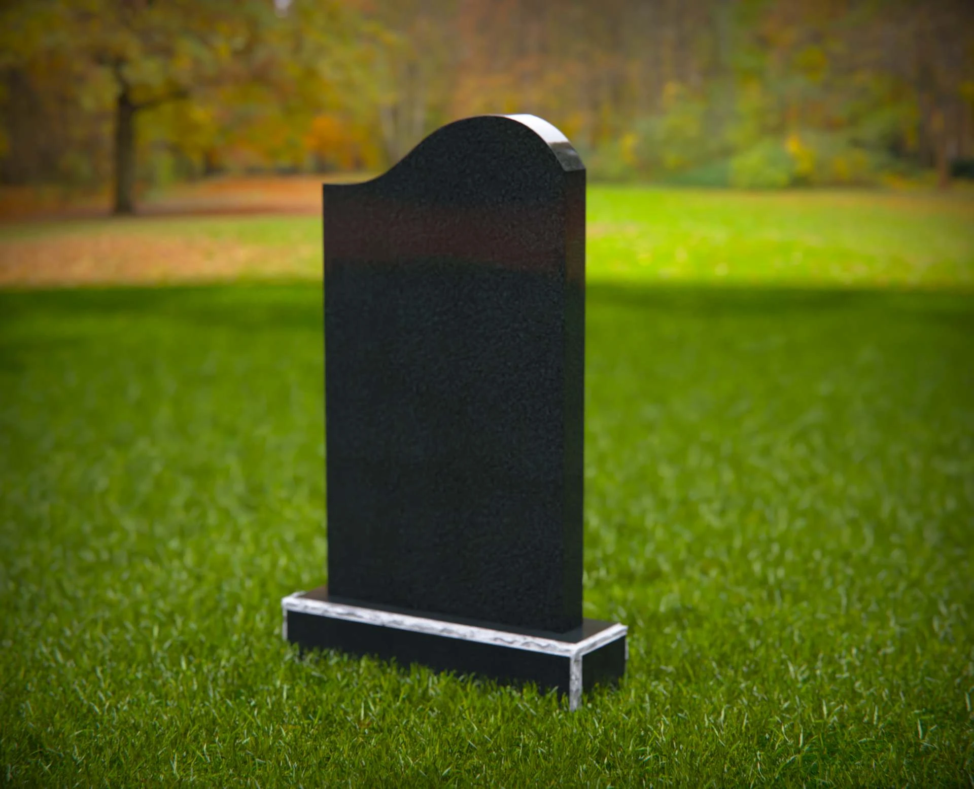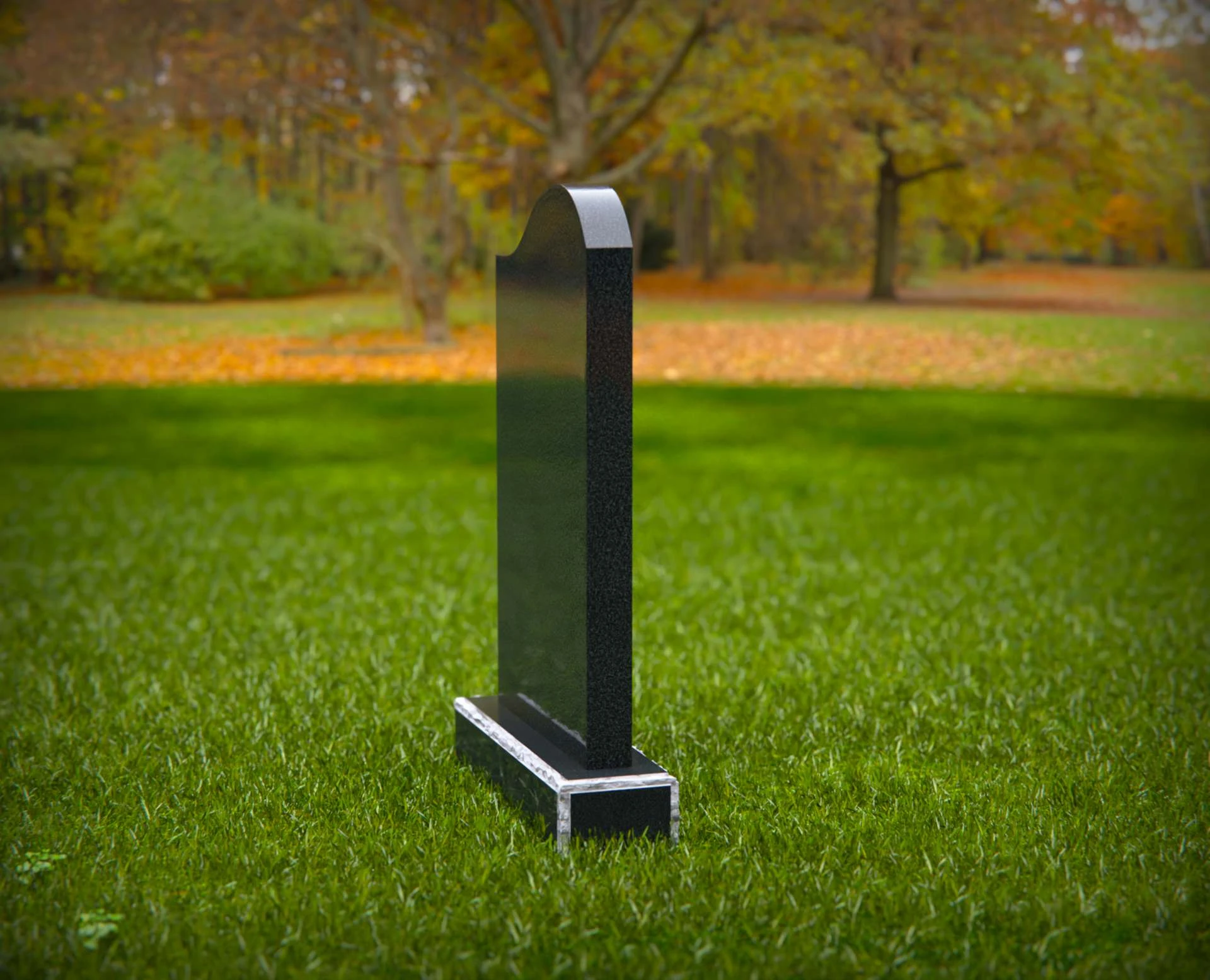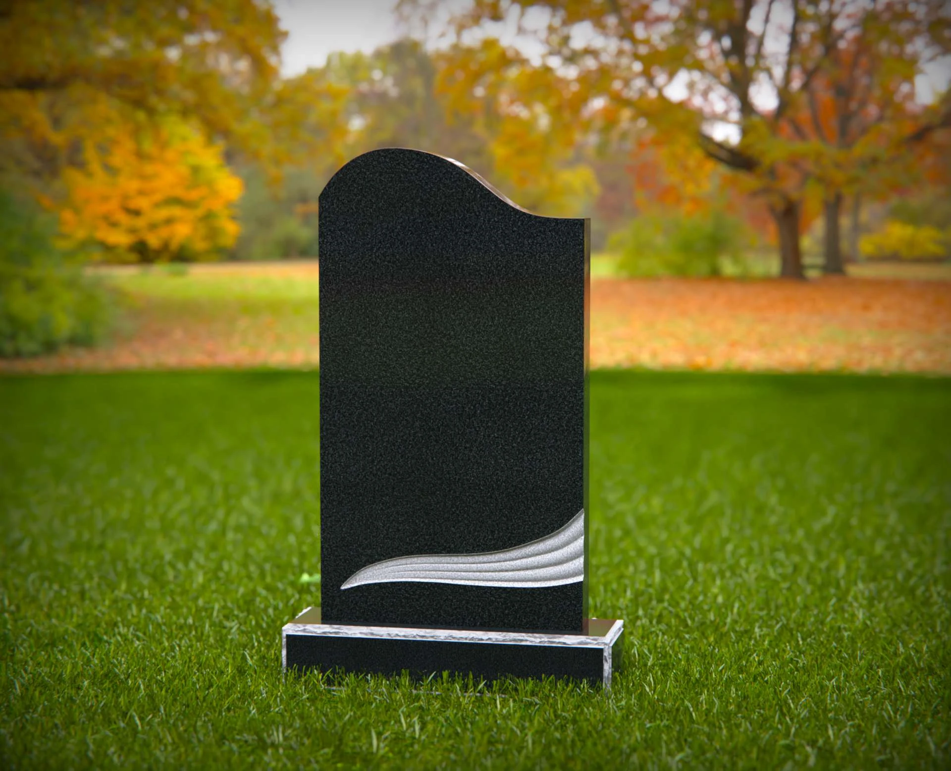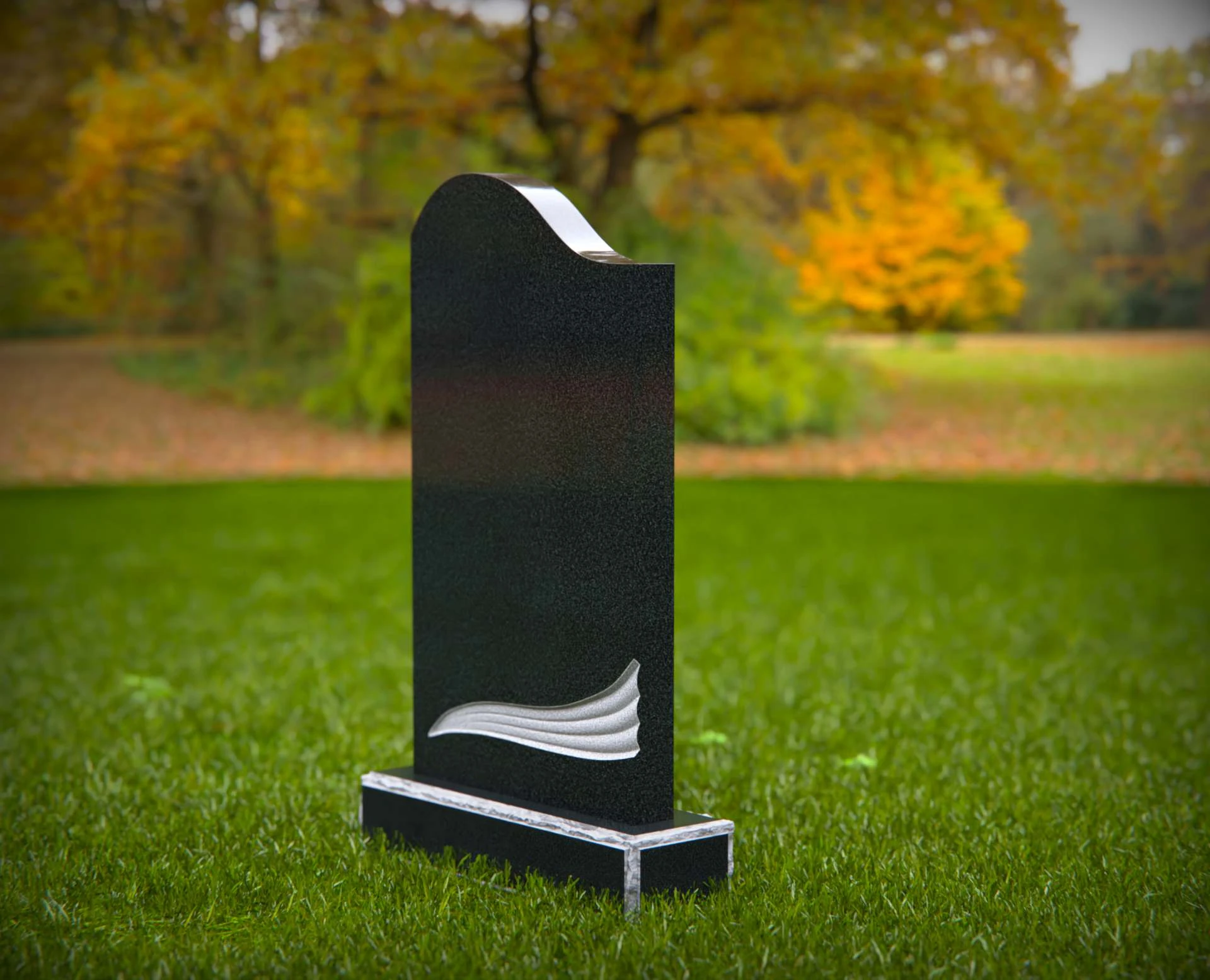 This contemporary upright headstone features a clean silhouette with a softly curved top and an elegant sculpted wave design near the base. Blending simplicity with modern artistry, this monument offers a unique yet respectful tribute to a loved one. The smooth surface provides ample space for personalized inscriptions, while the subtle detailing adds a touch of symbolism and grace to any cemetery setting.