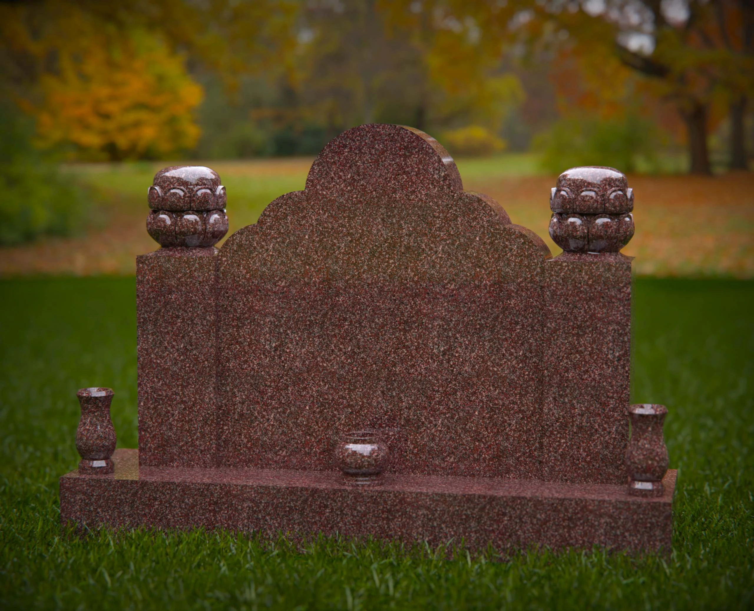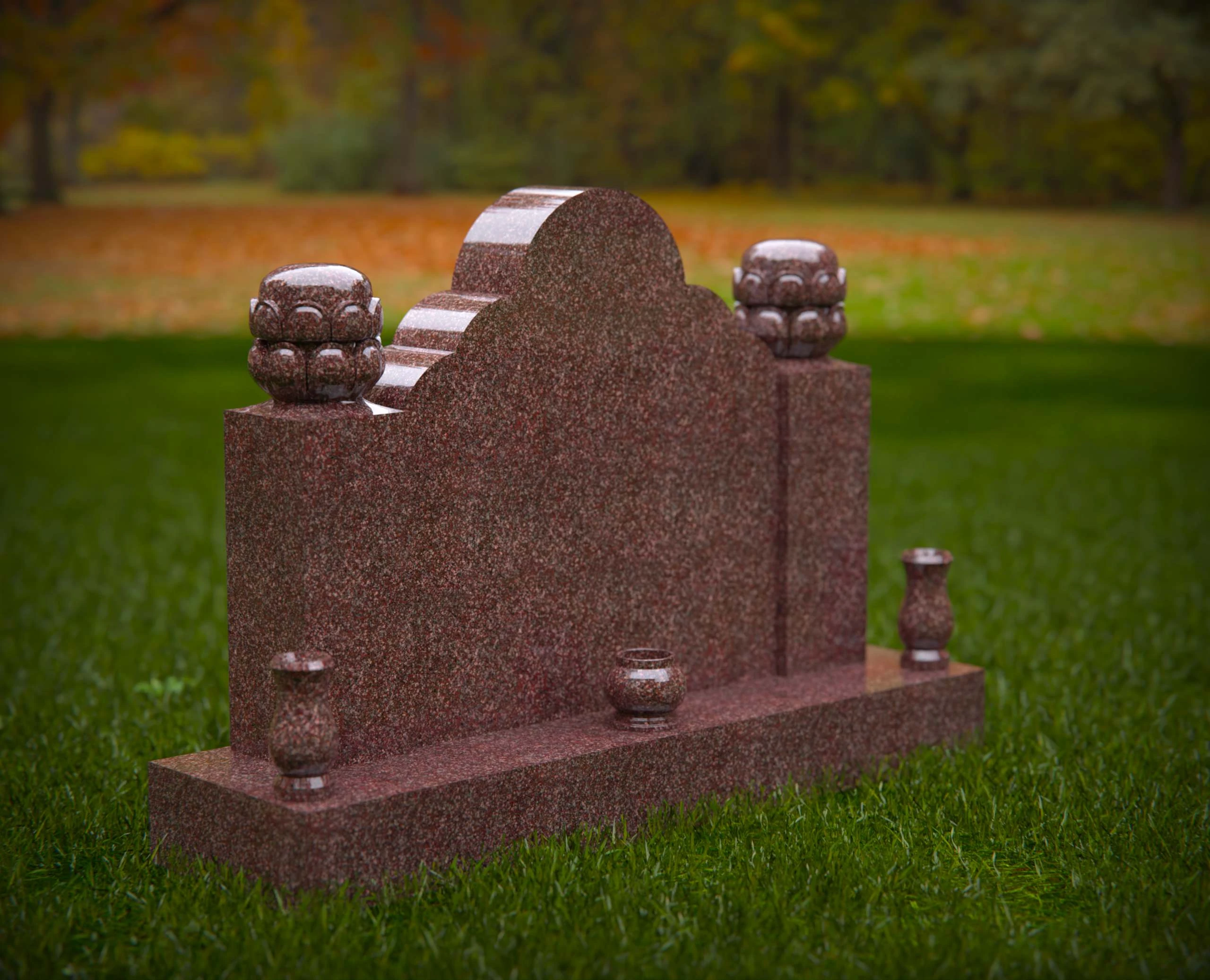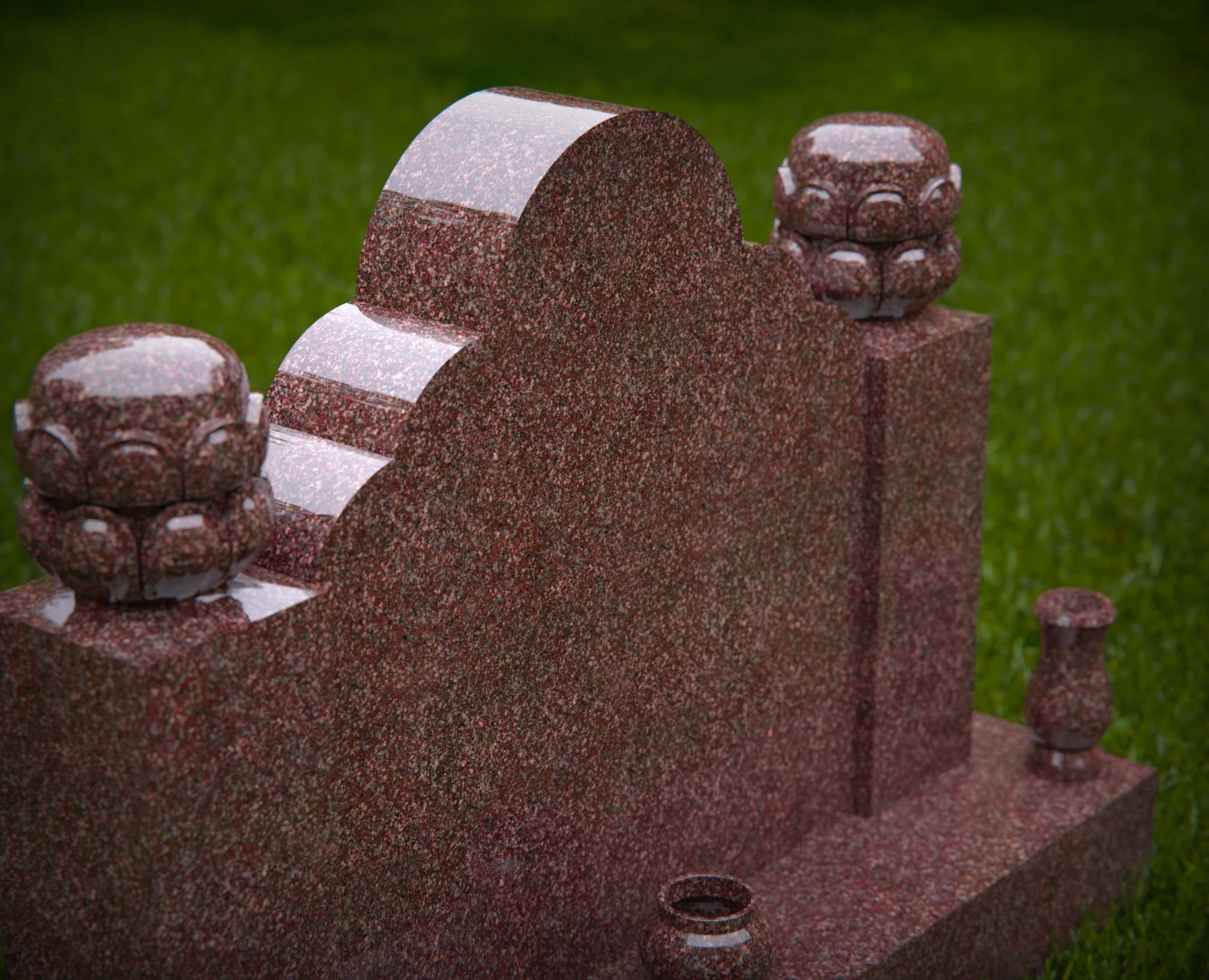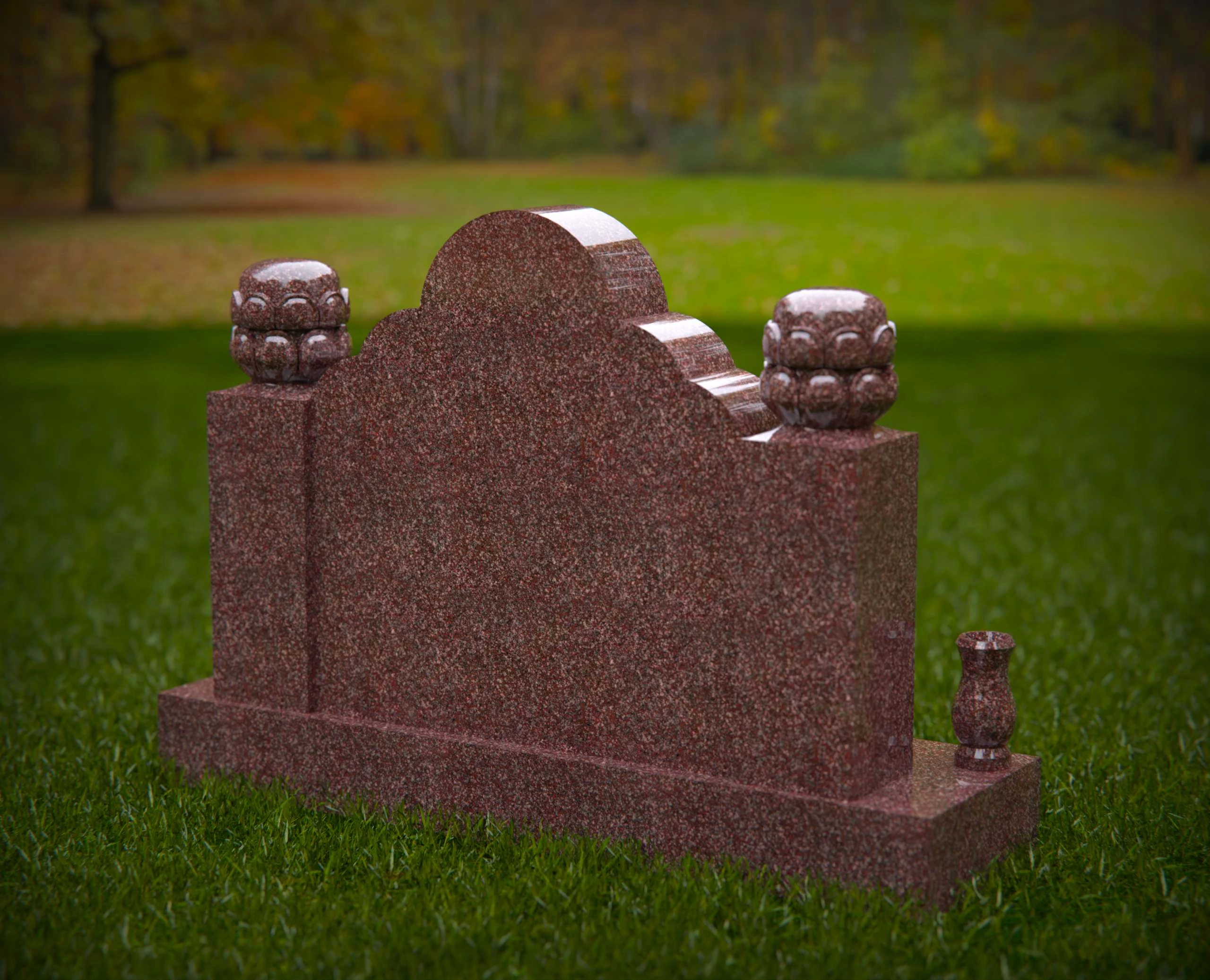 This double monument gravestone features a richly scalloped top design, flanked by detailed ornamental finials on each corner. The base is accented with elegant flower vases and a central rounded detail, making it an ideal tribute for two individuals. Perfect for use in headstone design portfolios, memorial service promotions, or monument product listings that highlight craftsmanship and symbolism.