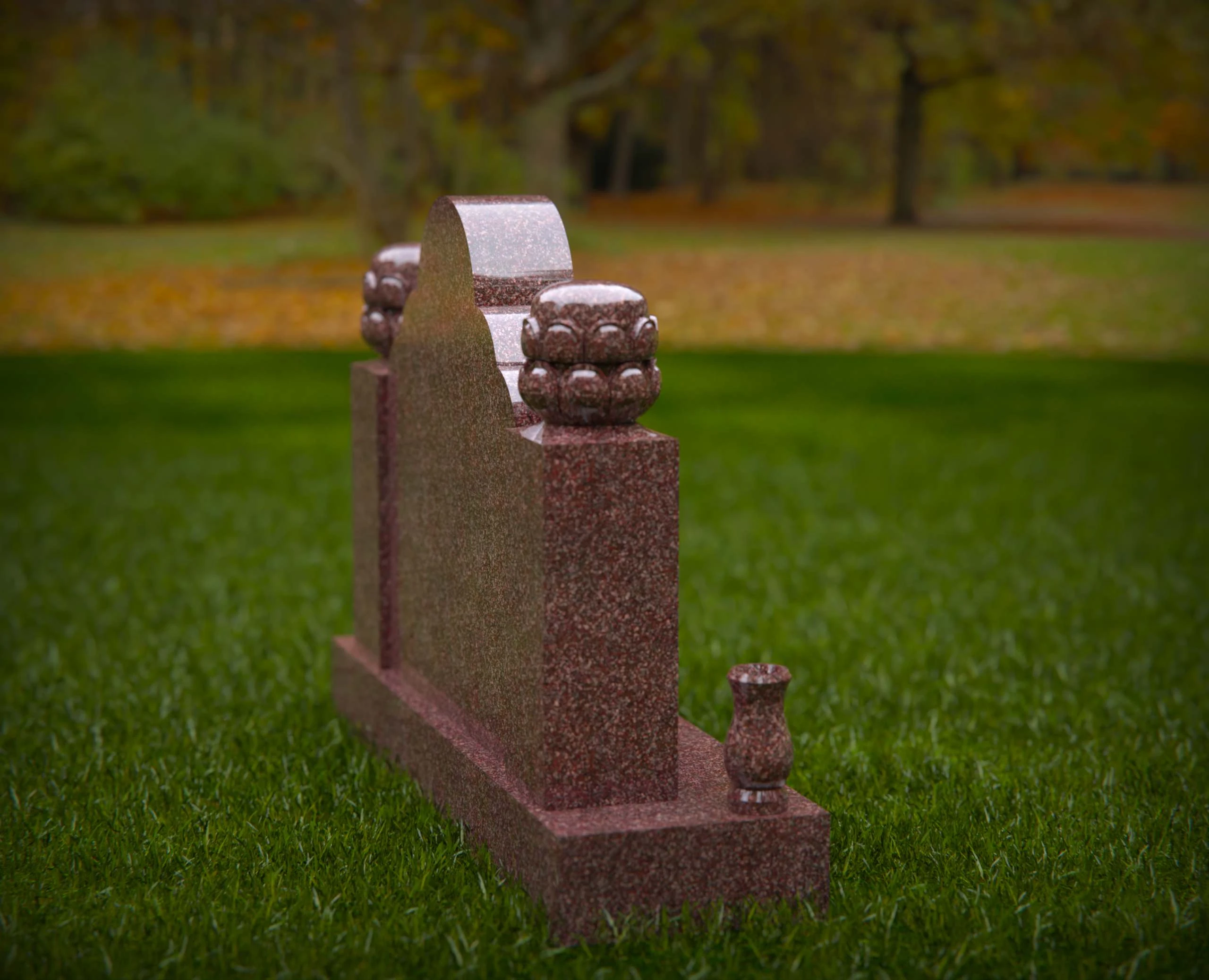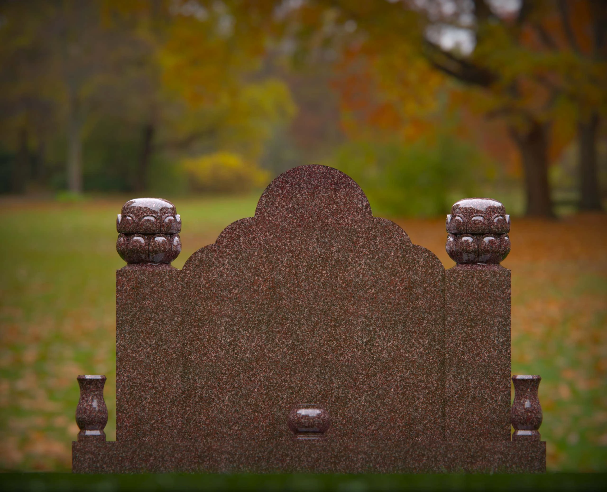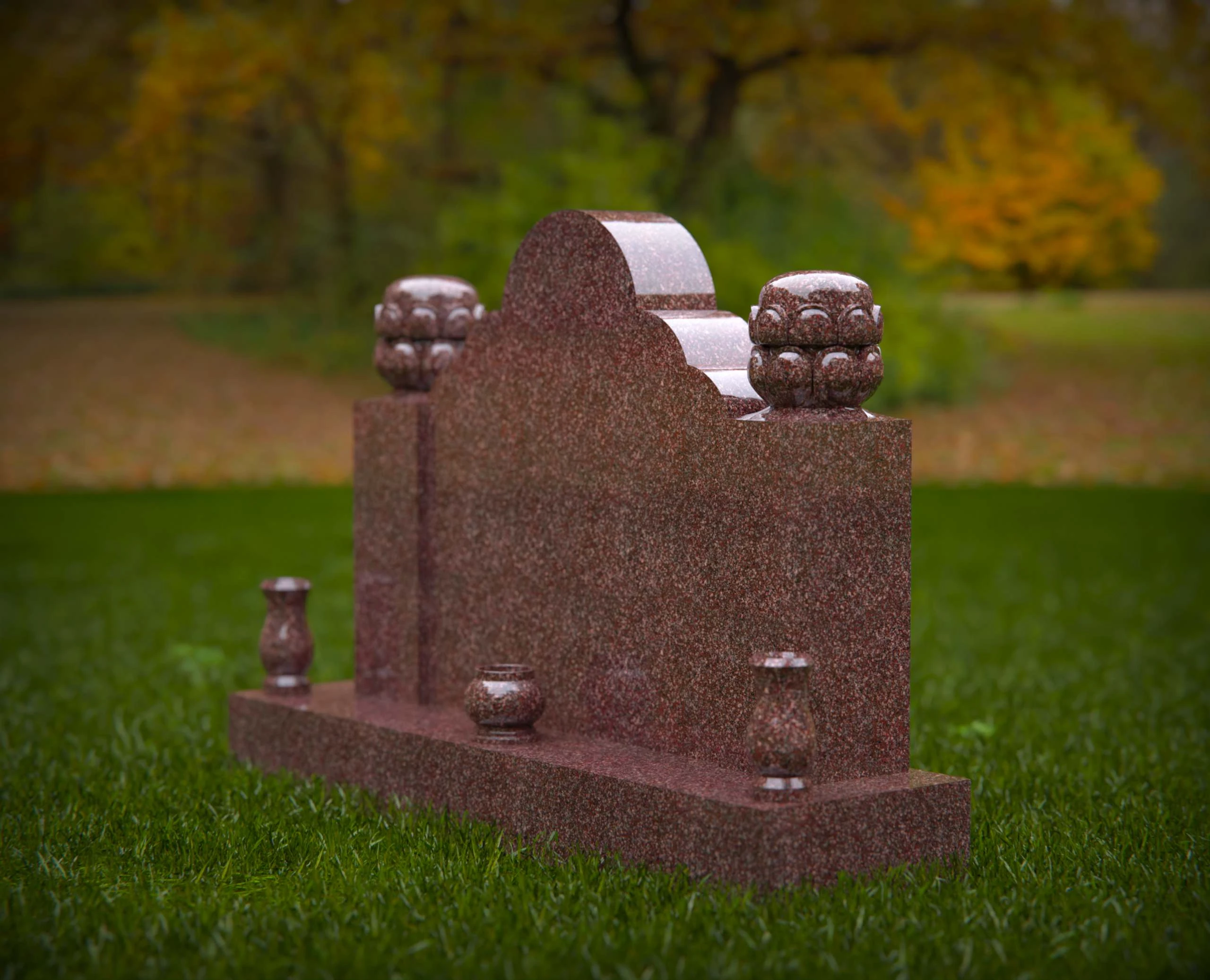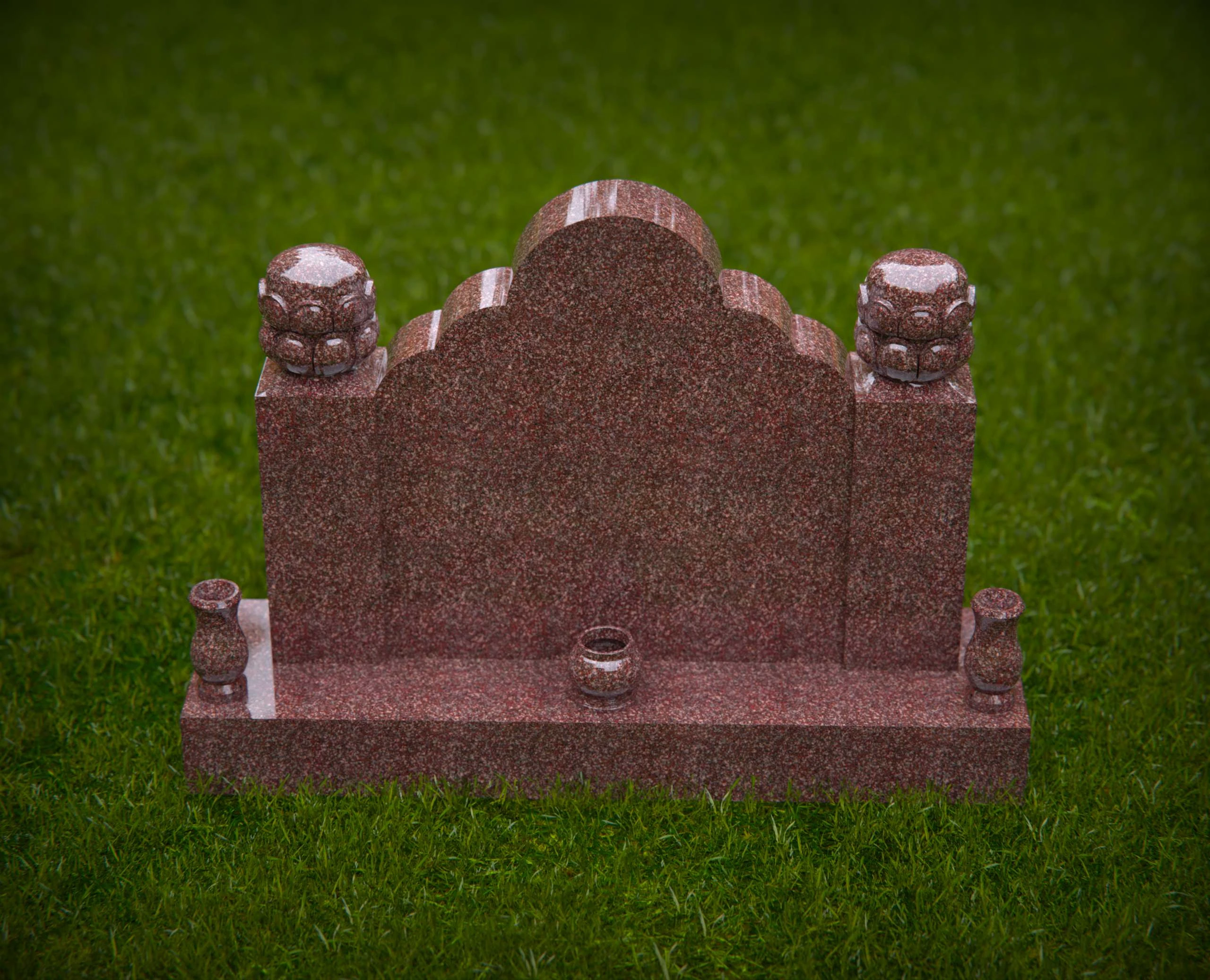 This double monument gravestone features a richly scalloped top design, flanked by detailed ornamental finials on each corner. The base is accented with elegant flower vases and a central rounded detail, making it an ideal tribute for two individuals. Perfect for use in headstone design portfolios, memorial service promotions, or monument product listings that highlight craftsmanship and symbolism.