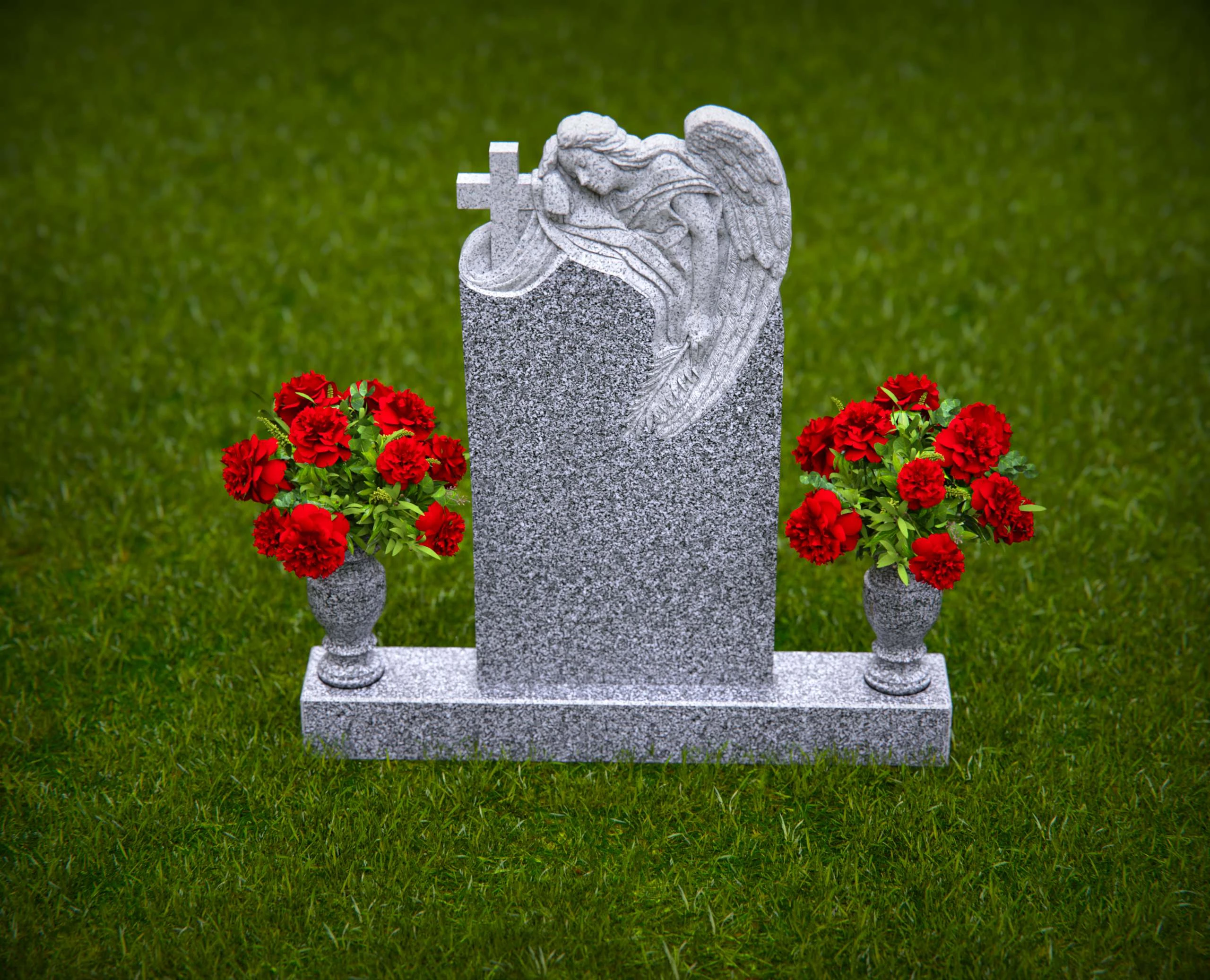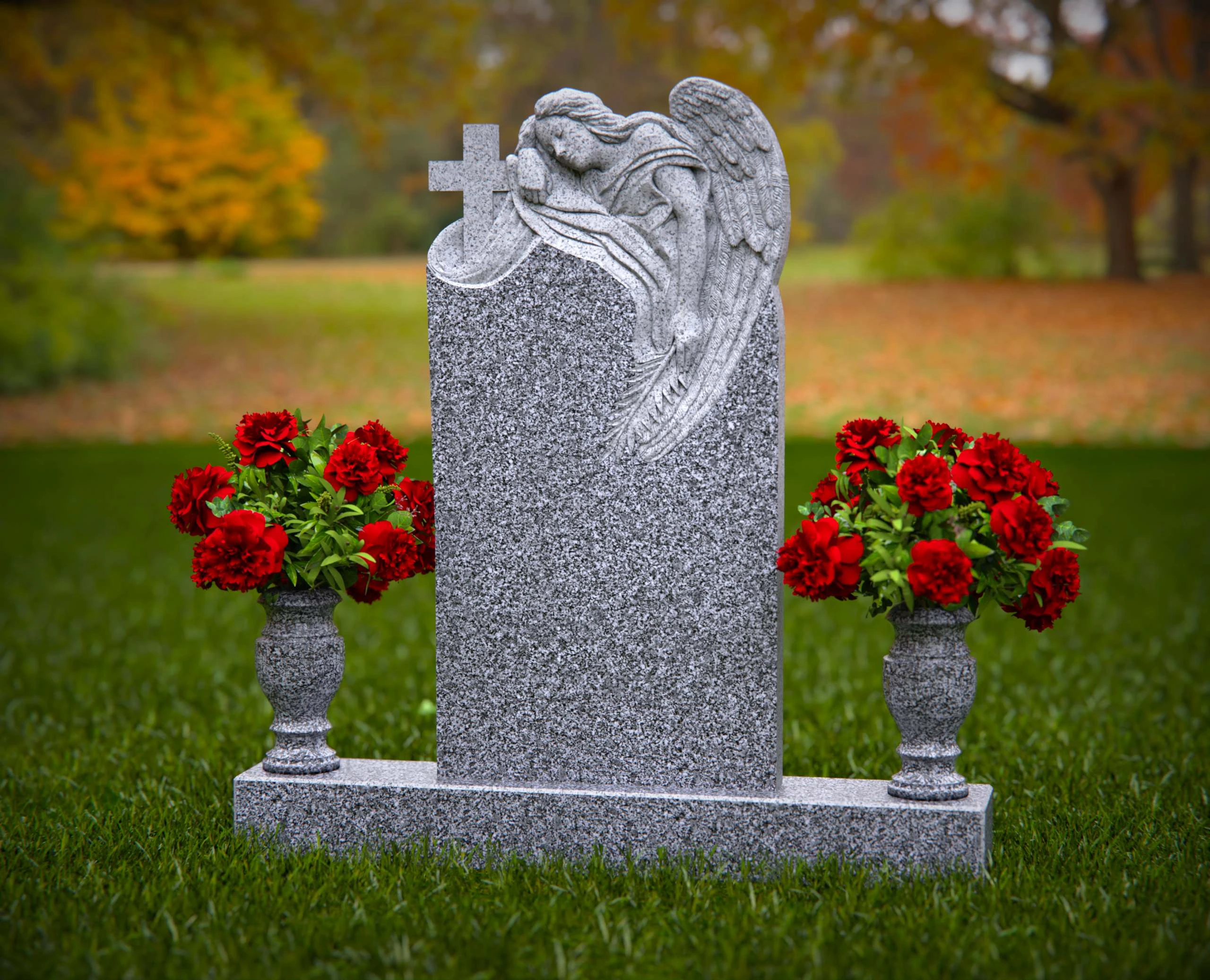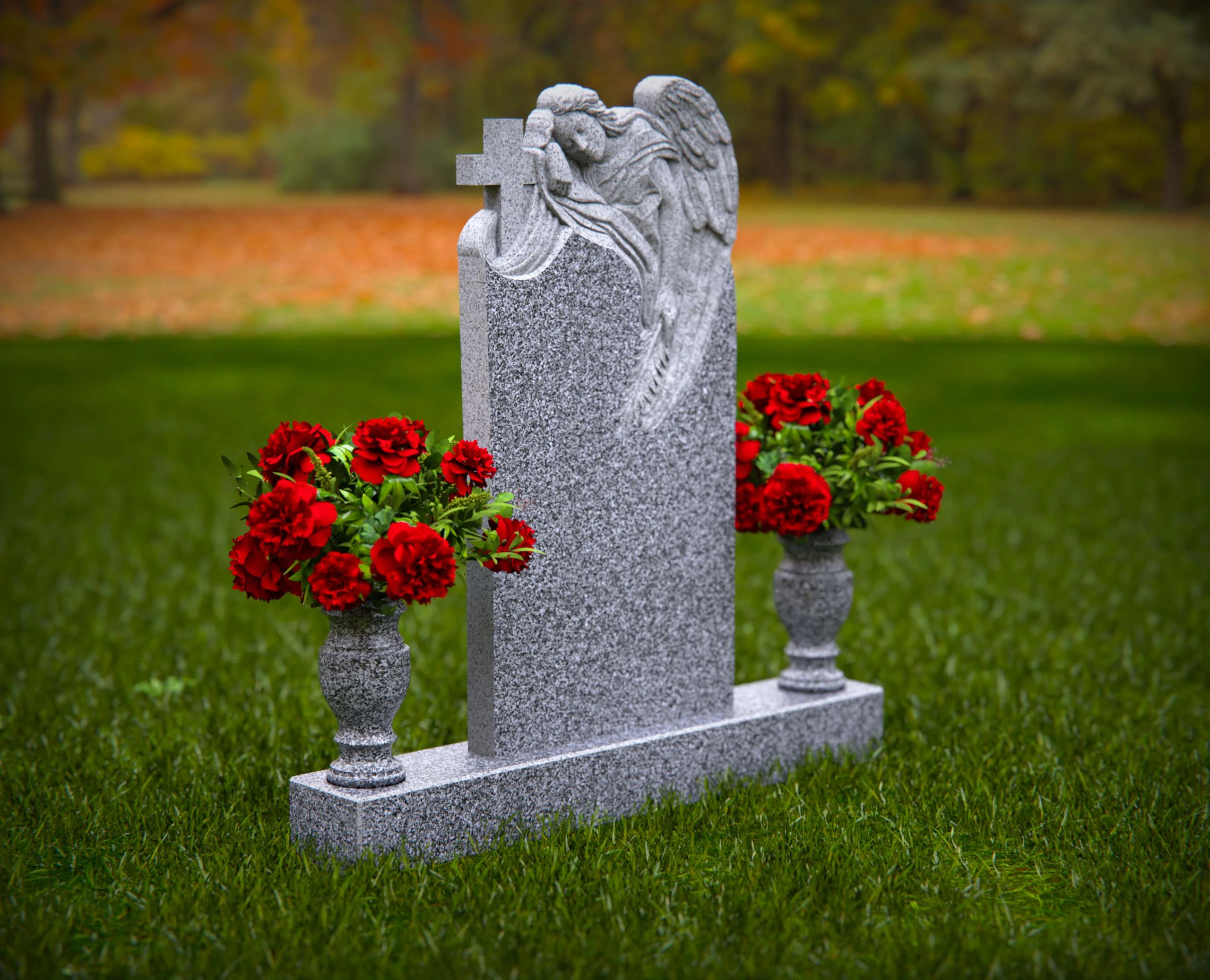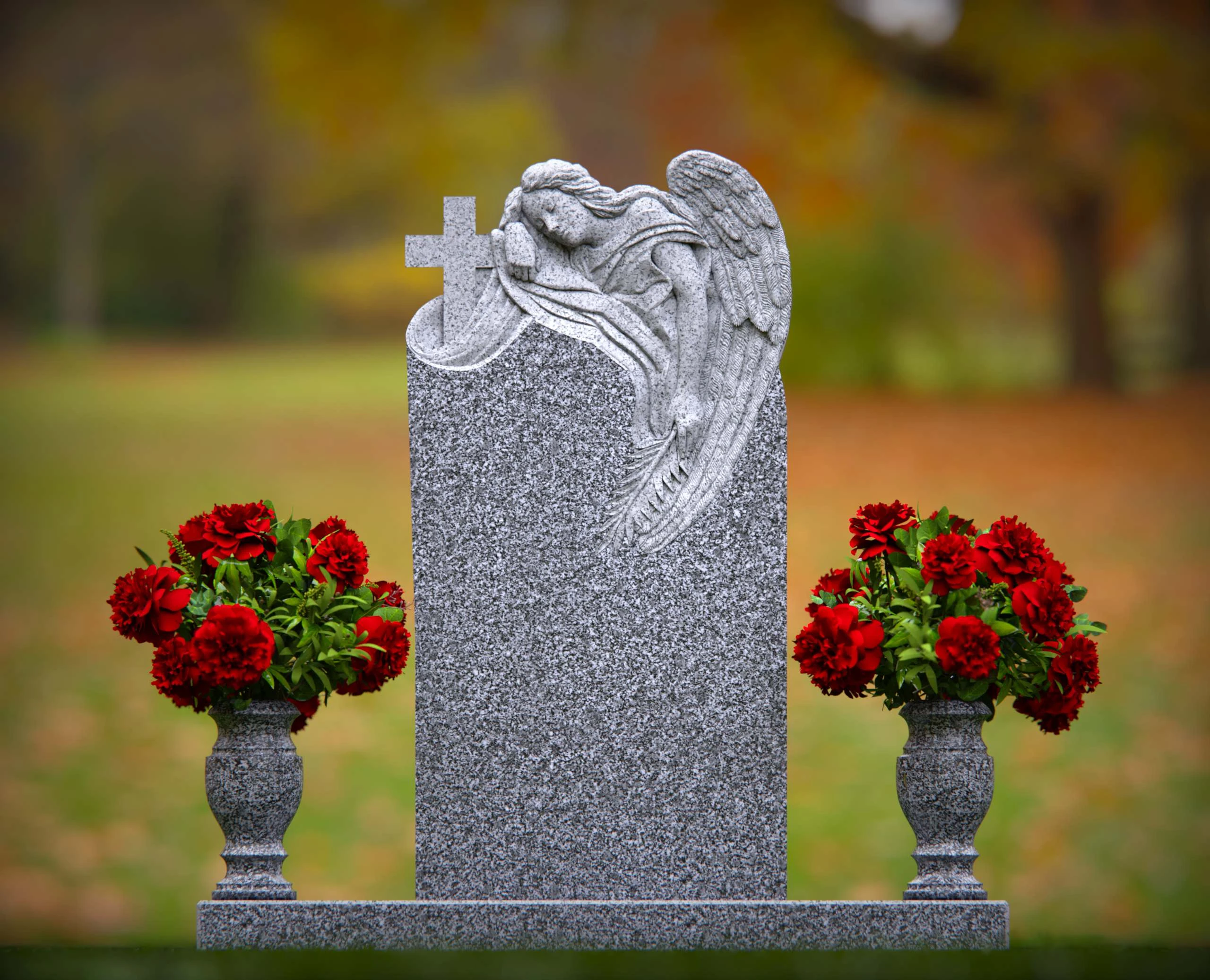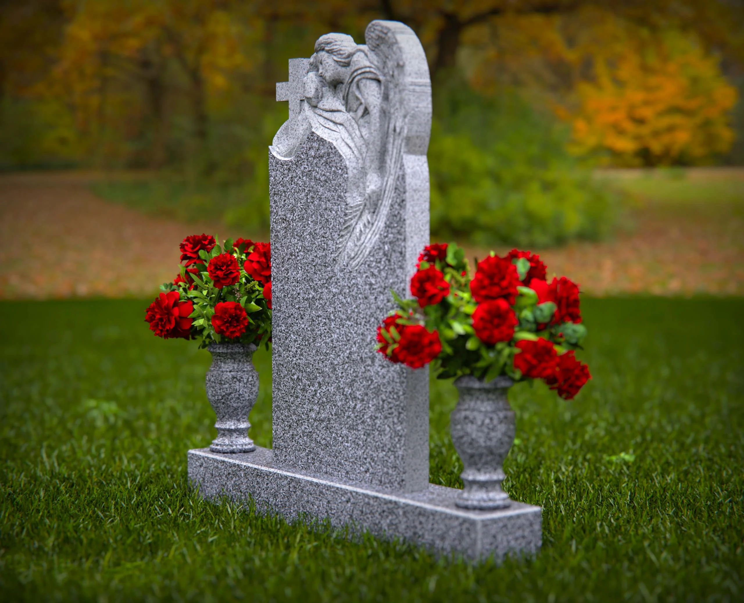 This heartfelt monument features a beautifully sculpted angel gently embracing a cross atop a textured headstone. Two elegant vases filled with vibrant floral arrangements flank the memorial, adding a vibrant and tender touch to the scene. Set against a serene backdrop of softly blurred trees and fallen leaves, the composition conveys a deep sense of peace, love, and spiritual remembrance. Perfect for content focused on religious memorials, angel-themed cemetery art, emotional tributes, and timeless remembrance designs.